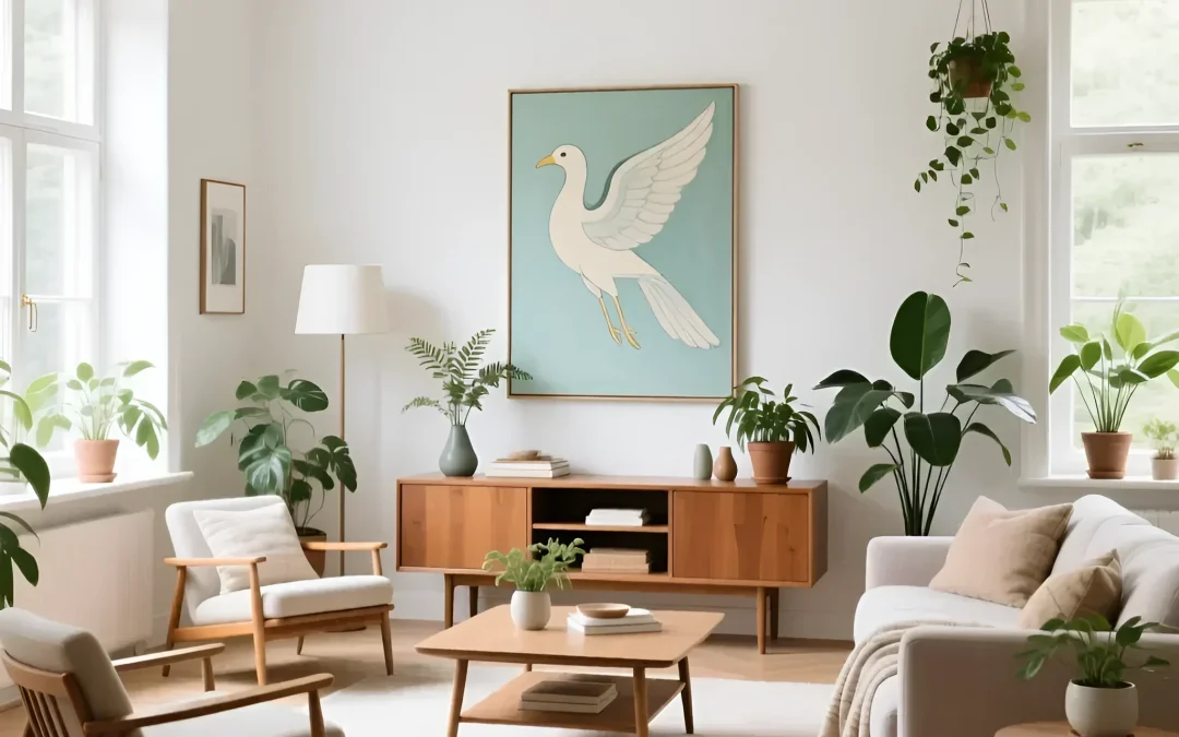 Изображение представляет собой мастерски выстроенную композицию интерьера в скандинавском стиле с явными элементами ретро. Основной акцент сделан на сочетании натуральных материалов – дерева, текстиля, растений – и светлой цветовой палитре, создающей ощущение простора и уюта. Картина с белой птицей над сервантом служит визуальным центром, добавляя образу легкости и символизма. Композиция выстроена по принципу баланса и симметрии, но при этом не выглядит статичной благодаря разнообразию форм и текстур. Общее впечатление – спокойствие, гармония и функциональность.