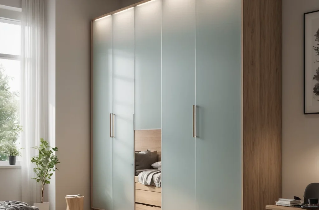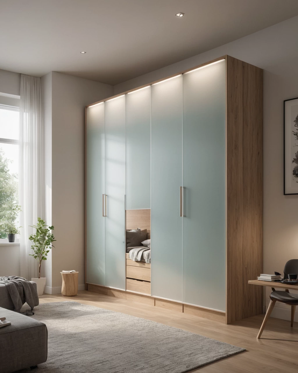photorealistic, a wardrobe with a frosted glass front, allowing diffused light into the interior №19 — mebeltops.com