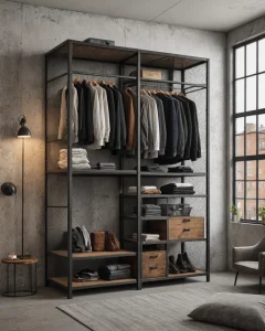 photorealistic, industrial style wardrobe, metal frame, wire mesh doors, visible clothing, loft bedroom, raw aesthetic №38 — mebeltops.com