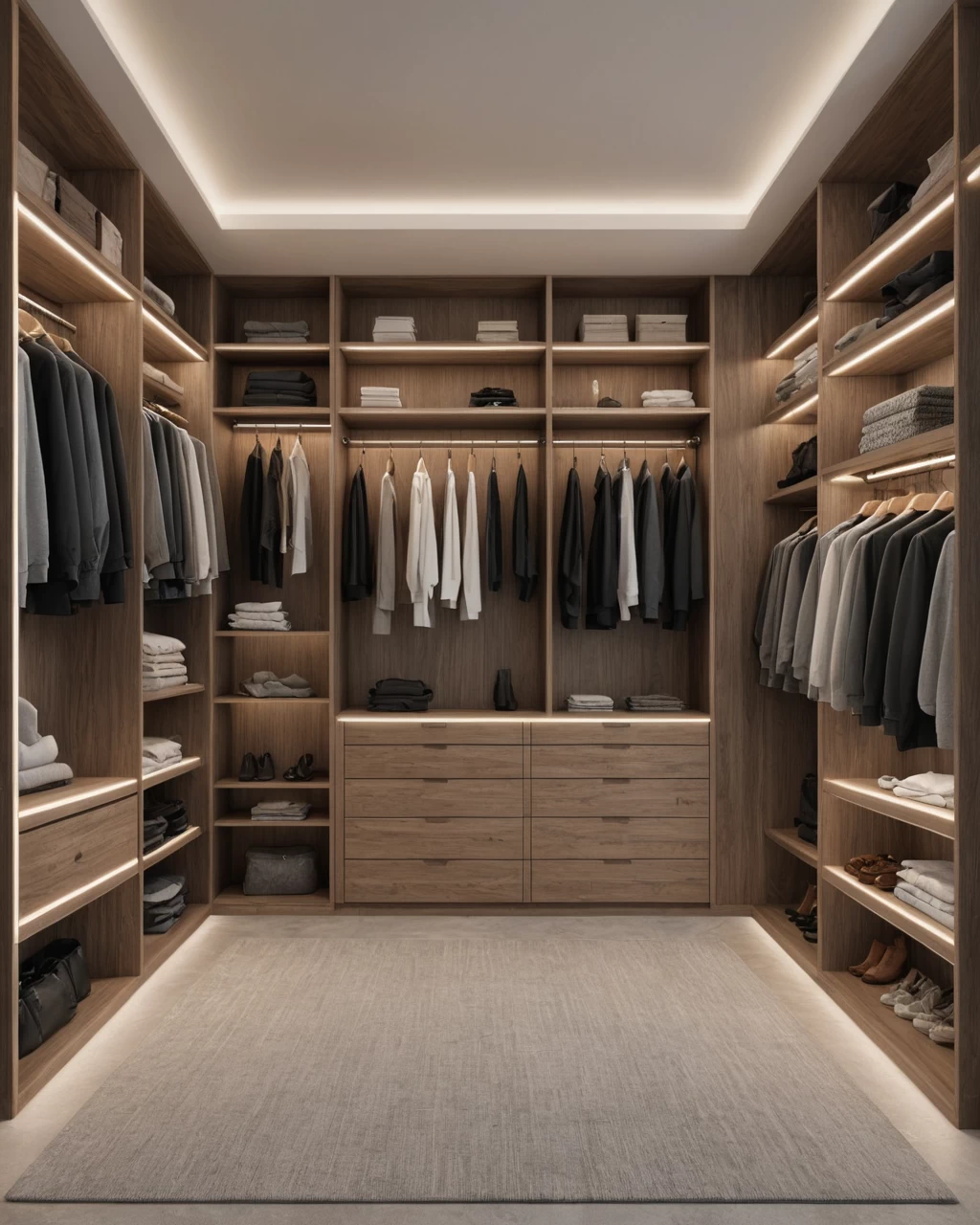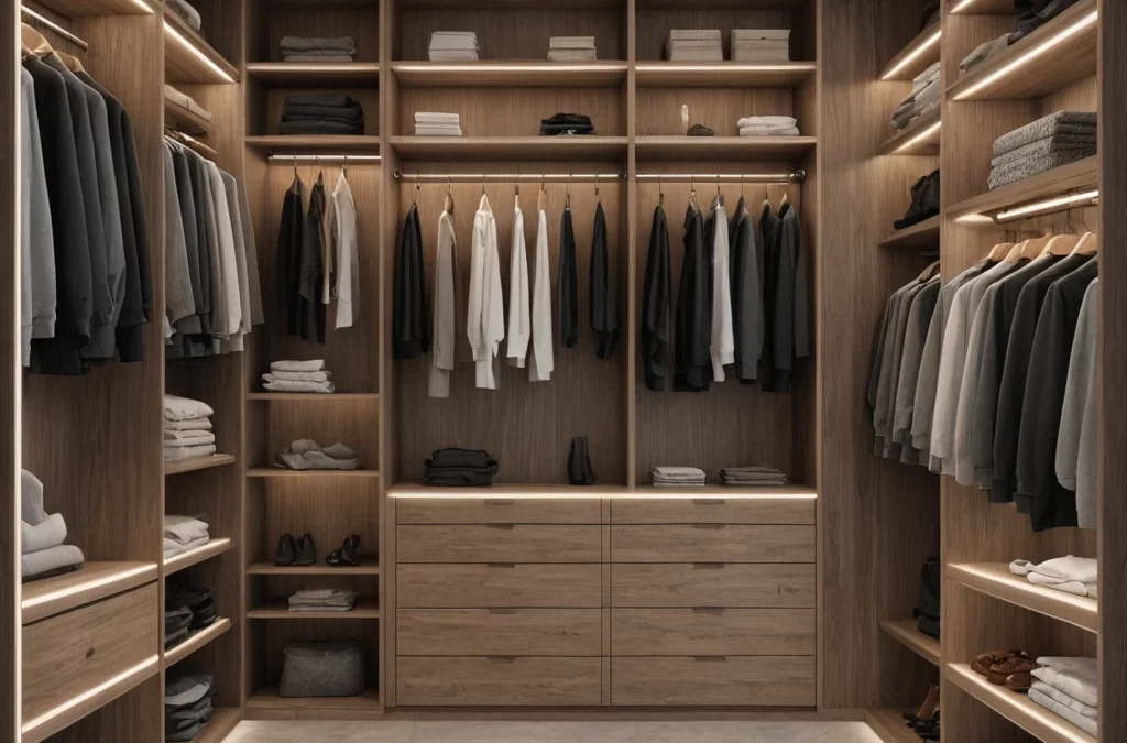 photorealistic, walk in closet style wardrobe, open shelving, integrated LED lighting, visible organization, luxurious bedroom №43 — mebeltops.com