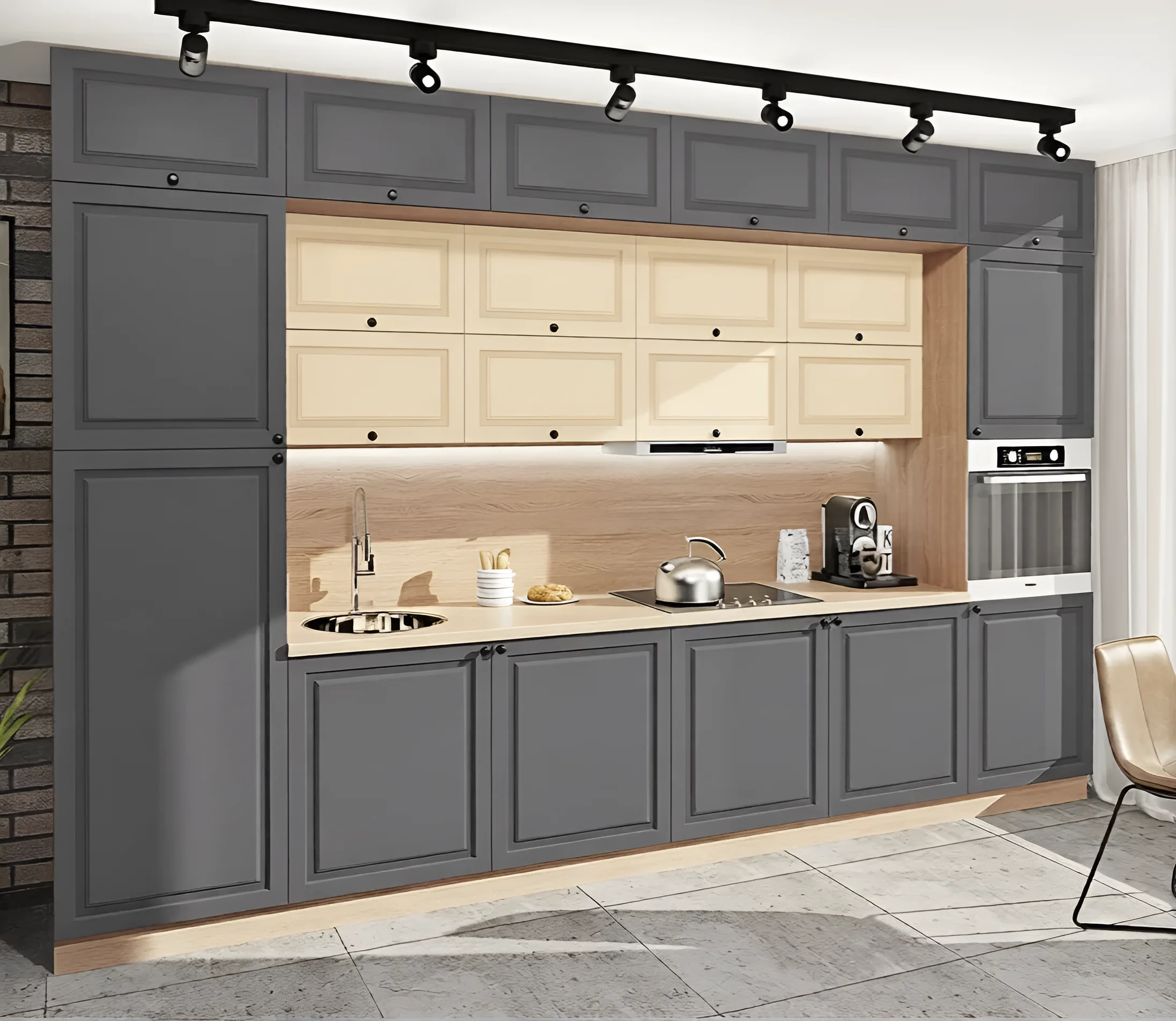 Entdecken Sie die perfekte Kombination aus Stil, Funktionalität und Langlebigkeit mit der Küche „Atlanta“ 3,6m von MebelTops.com. Dieses Modell aus hochwertigem lackiertem MDF in harmonischen Farbtönen von Graphit und Creme wird zum zentralen Element Ihres Zuhauses und verwandelt das Kochen in ein wahres Vergnügen und Ihren Raum in eine Oase des Komforts und modernen Designs.