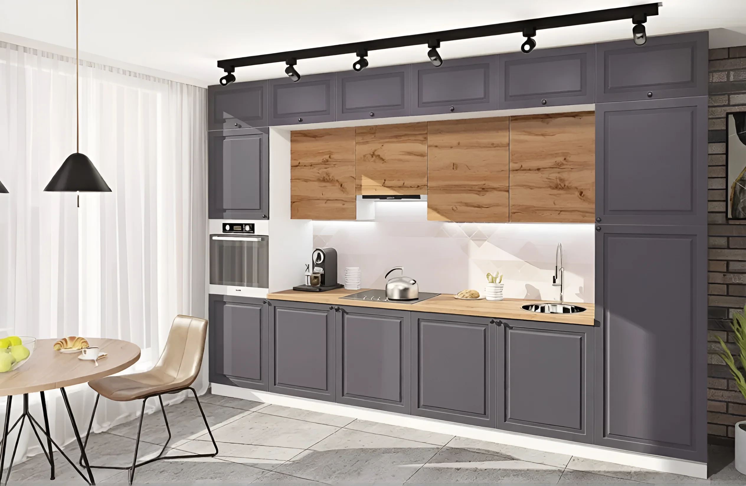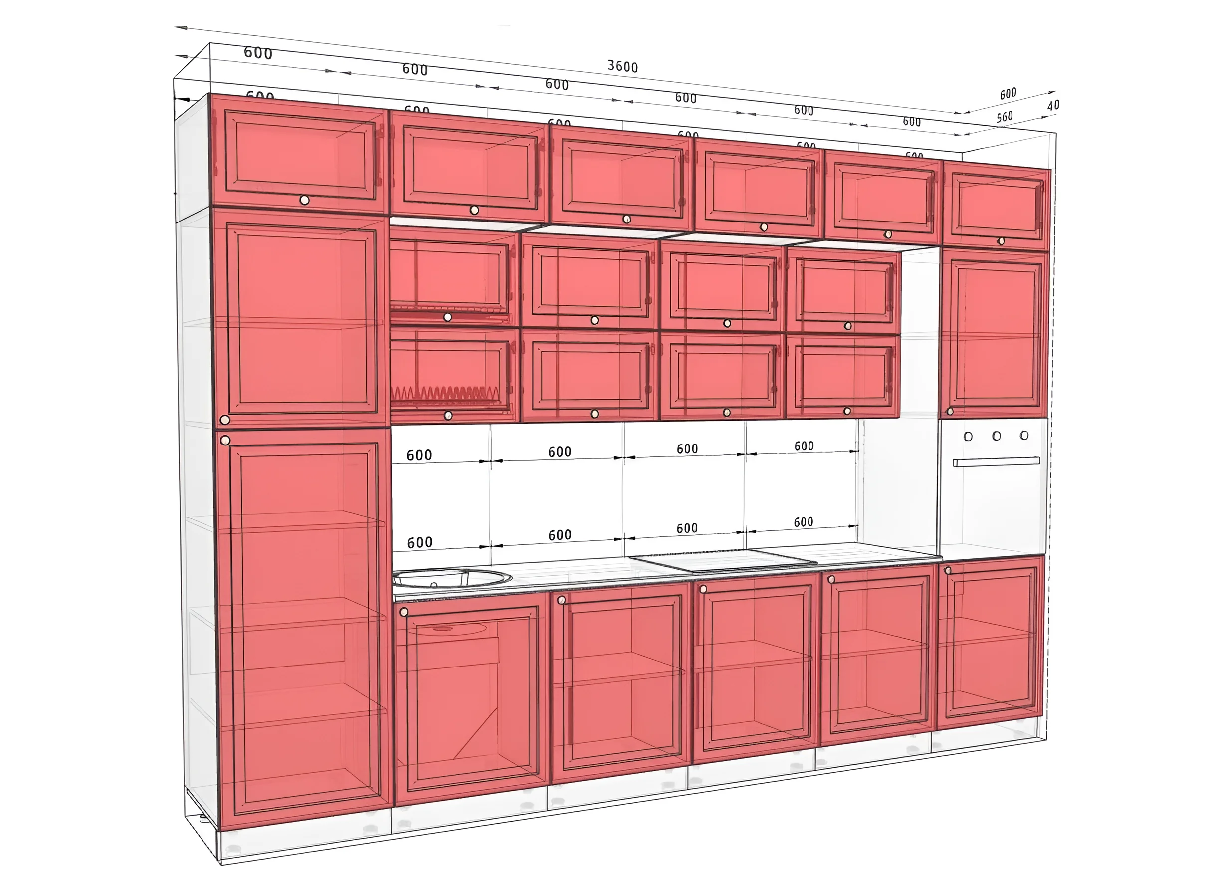 Dieses Modell hat eine beeindruckende Höhe von 2,5 Metern, was eine maximale Raumnutzung „bis zur Decke“ ermöglicht. Die Integration von Aufsatzschränken erhöht nicht nur das nutzbare Stauraumvolumen, sondern verleiht der Küche auch ein vollständiges, monolithisches Aussehen, verbirgt Lüftungskanäle und erzeugt den Effekt von Einbaumöbeln. Die Länge der Küche beträgt 3,6 Meter, was sie zur idealen Lösung für geräumige Räume macht und ausreichend Arbeitsflächen und Stauraum bietet.