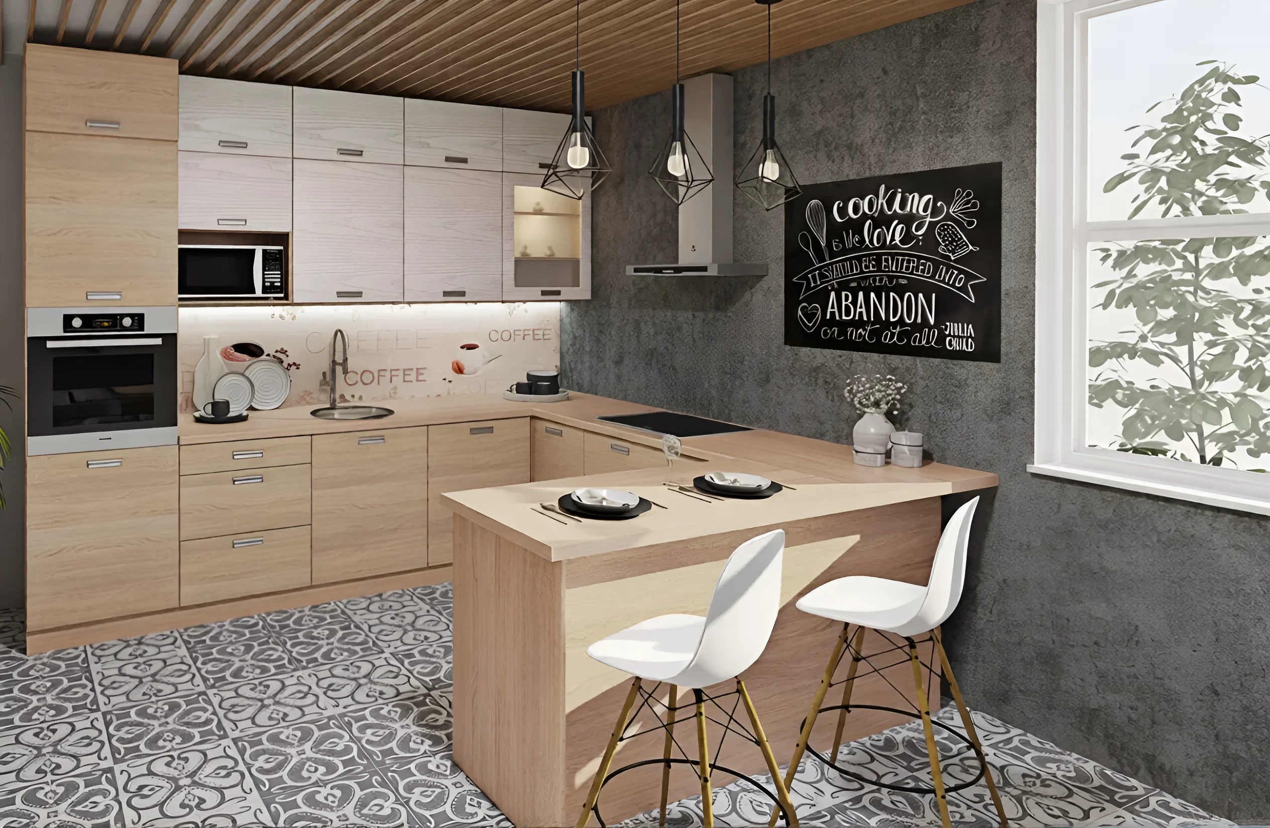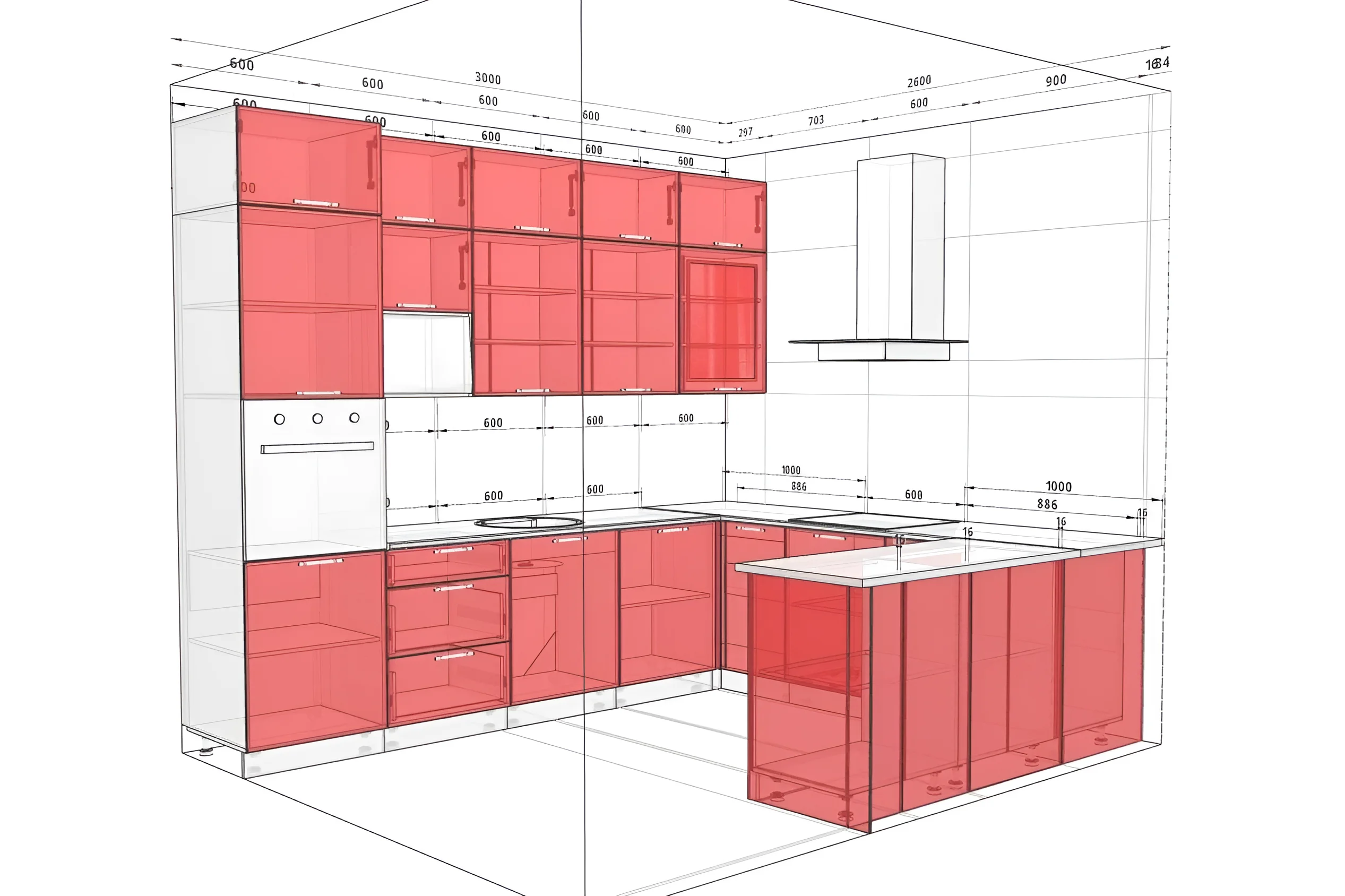 Diese U-förmige Küchenplanung ist eine der effektivsten Lösungen für die Organisation des Arbeitsbereichs und sorgt für ein bequemes „Arbeitsdreieck“ zwischen Spüle, Herd und Kühlschrank. Diese Konfiguration minimiert unnötige Bewegungen und macht den Kochprozess maximal komfortabel und schnell. Die Gesamtlänge der Küche beträgt 3 Meter und die Breite 2,6 Meter, was es ermöglicht, alle notwendigen Geräte unterzubringen, großzügige Kochbereiche zu schaffen und geräumige Aufbewahrungssysteme zu organisieren.