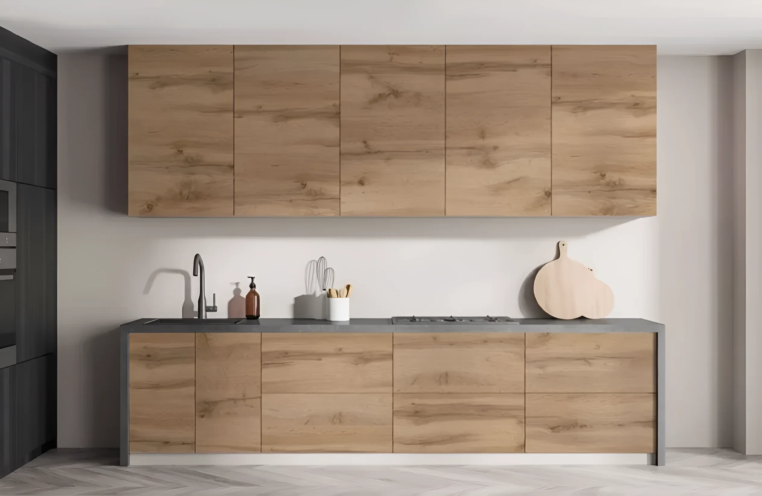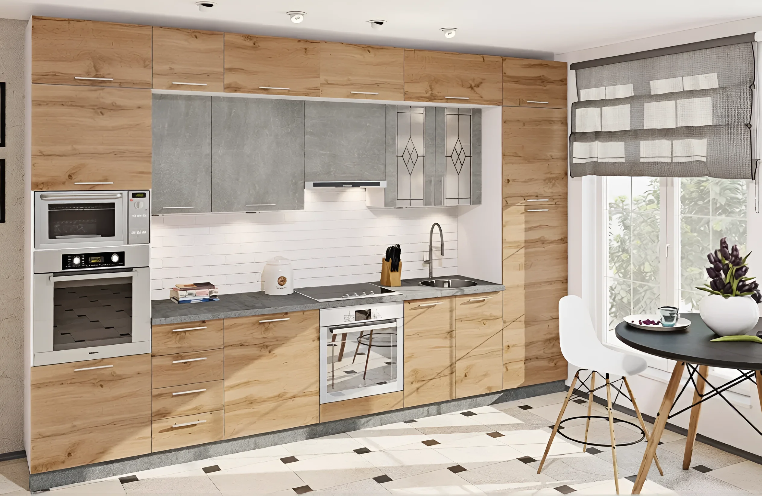 Die Länge dieser geraden Küche beträgt 3,6 Meter, was die Unterbringung aller notwendigen Geräte und die Schaffung einer vollwertigen Arbeitszone ermöglicht. Besonderes Augenmerk wurde auf die Höhe gelegt: Die Gesamthöhe der Küche erreicht 2,5 Meter, was die Nutzung des Raumes „bis zur Decke“ mit Hängeschränken bedeutet. Diese Lösung erhöht das nutzbare Stauvolumen erheblich und ermöglicht die effiziente Nutzung der oberen Ebenen für selten benötigtes Geschirr oder Haushaltsgeräte. Die Hängeschränke sind in zwei Höhen erhältlich – 1080 mm und 1280 mm, was die Anpassung des Designs an spezifische Bedürfnisse und die visuelle Vergrößerung des Raumes ermöglicht.