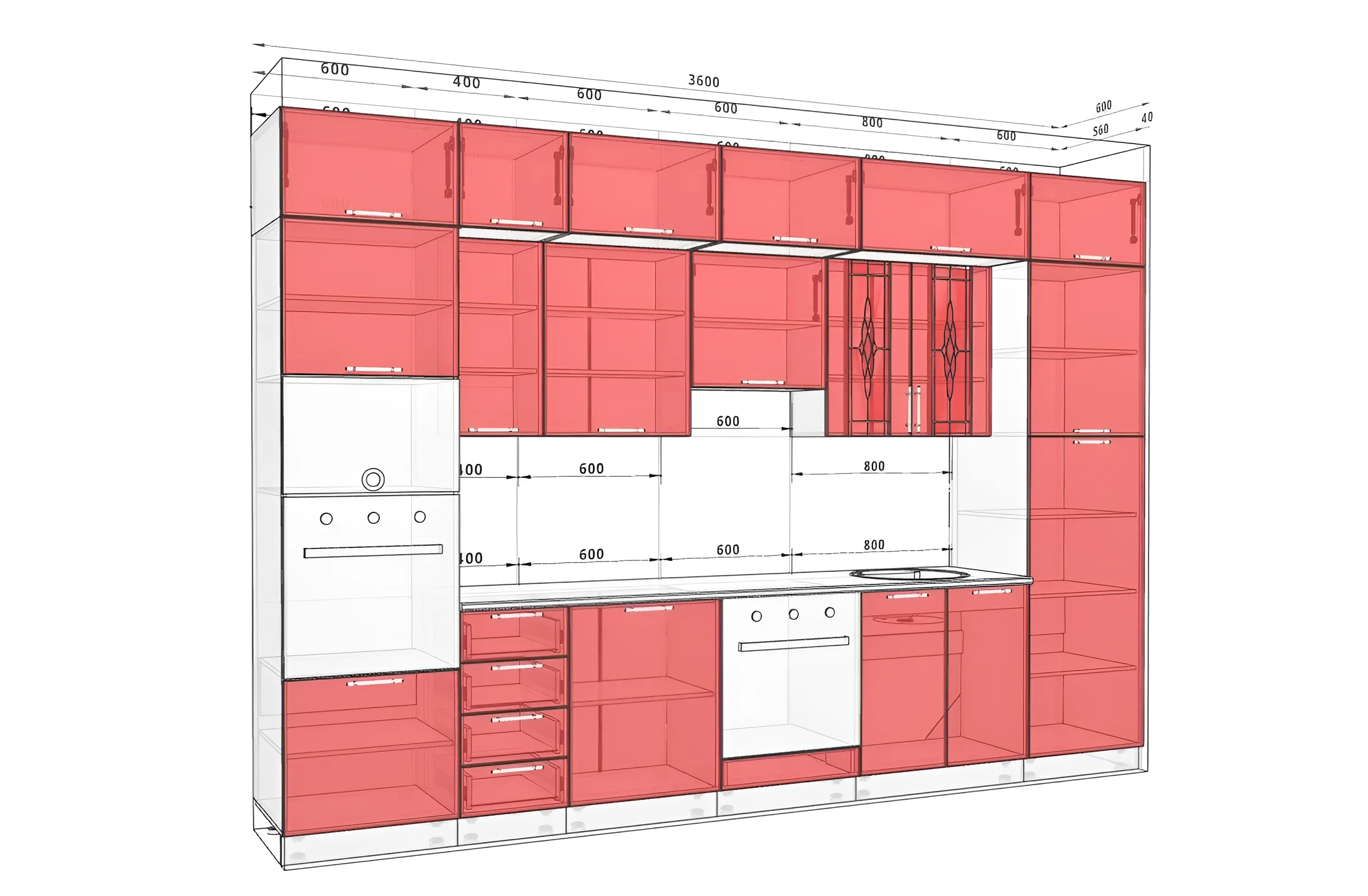 - Optimale Abmessungen: Länge 3,6 m, Tiefe der Unterschränke 450 mm, Arbeitsplatte 600 mm.