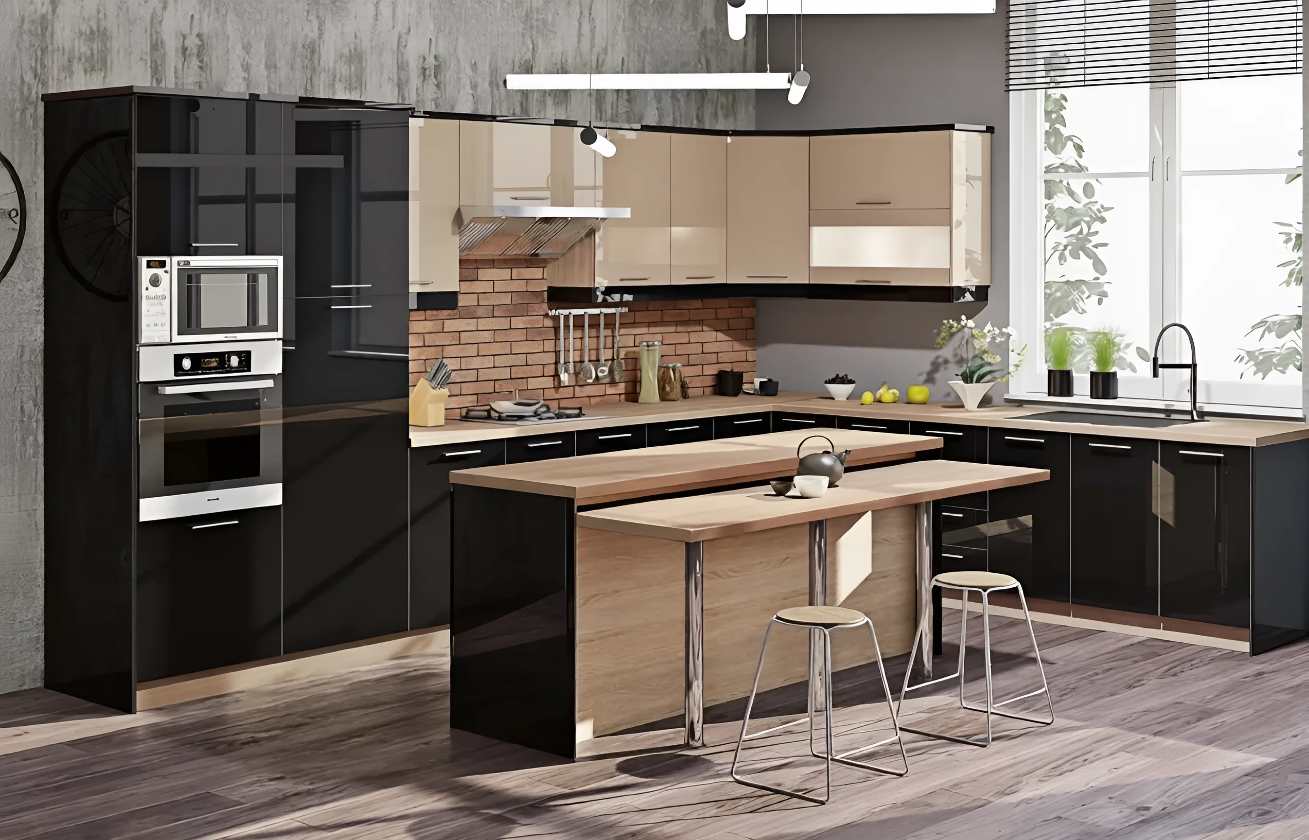 Die Küche „Lack Hochglanz“ ist die Verkörperung modernen Designs. Die Kombination aus tiefem Schwarz und zartem Cappuccino schafft ein harmonisches und stilvolles Interieur, das nie aus der Mode kommt. Der Hochglanz der Fronten verleiht der Küche nicht nur ein luxuriöses Aussehen, sondern erweitert auch optisch den Raum und verleiht ihm Leichtigkeit und Luftigkeit. Das Fehlen unnötiger Details und klare Linien unterstreichen den minimalistischen Ansatz, der für aktuelle Trends im Innendesign charakteristisch ist.