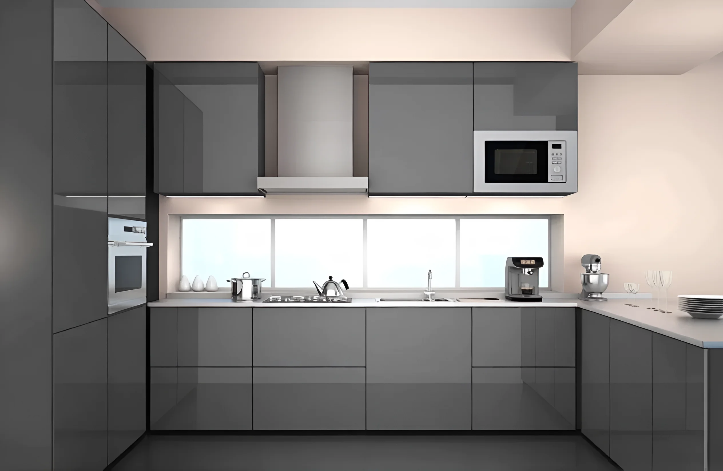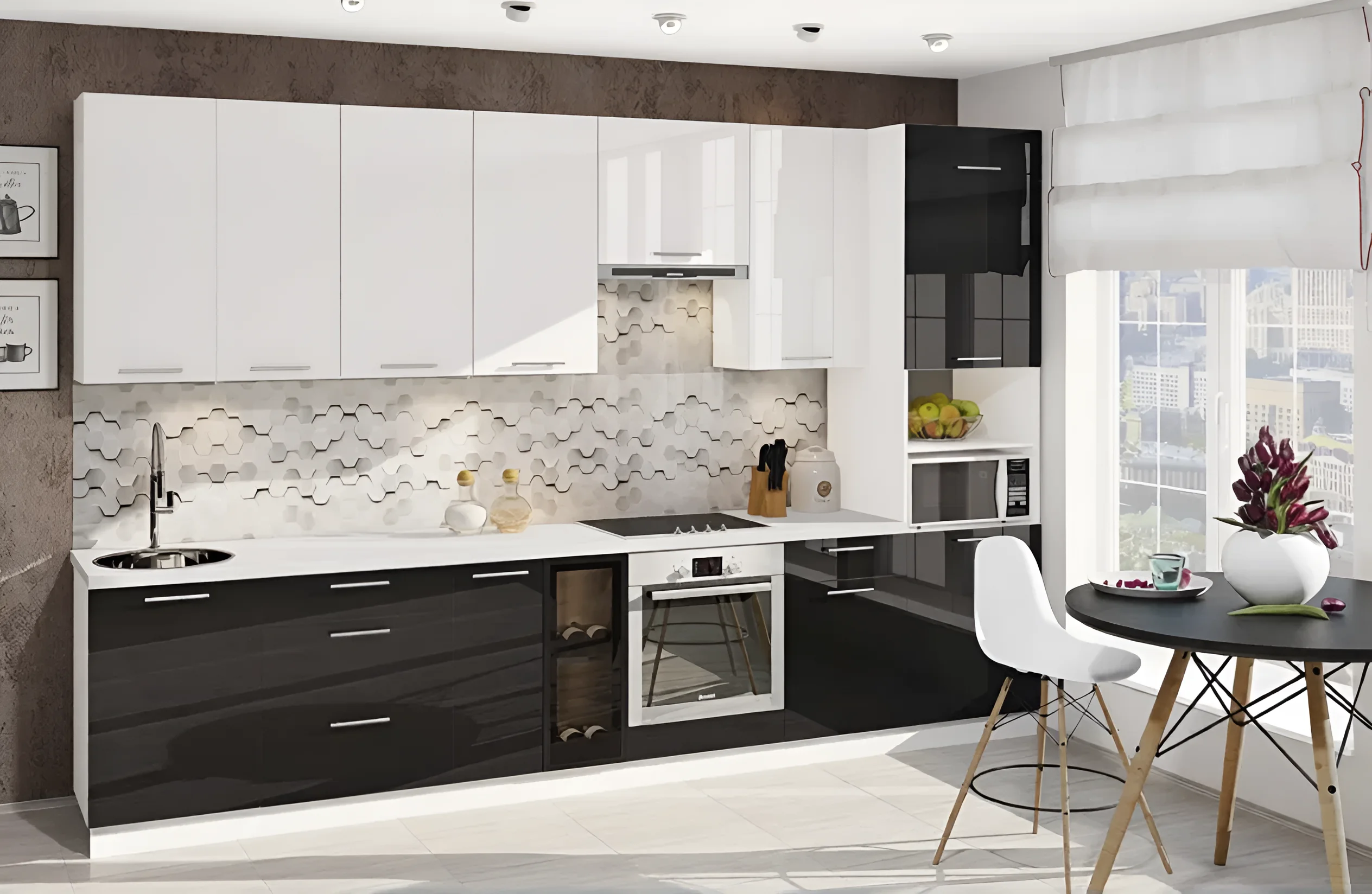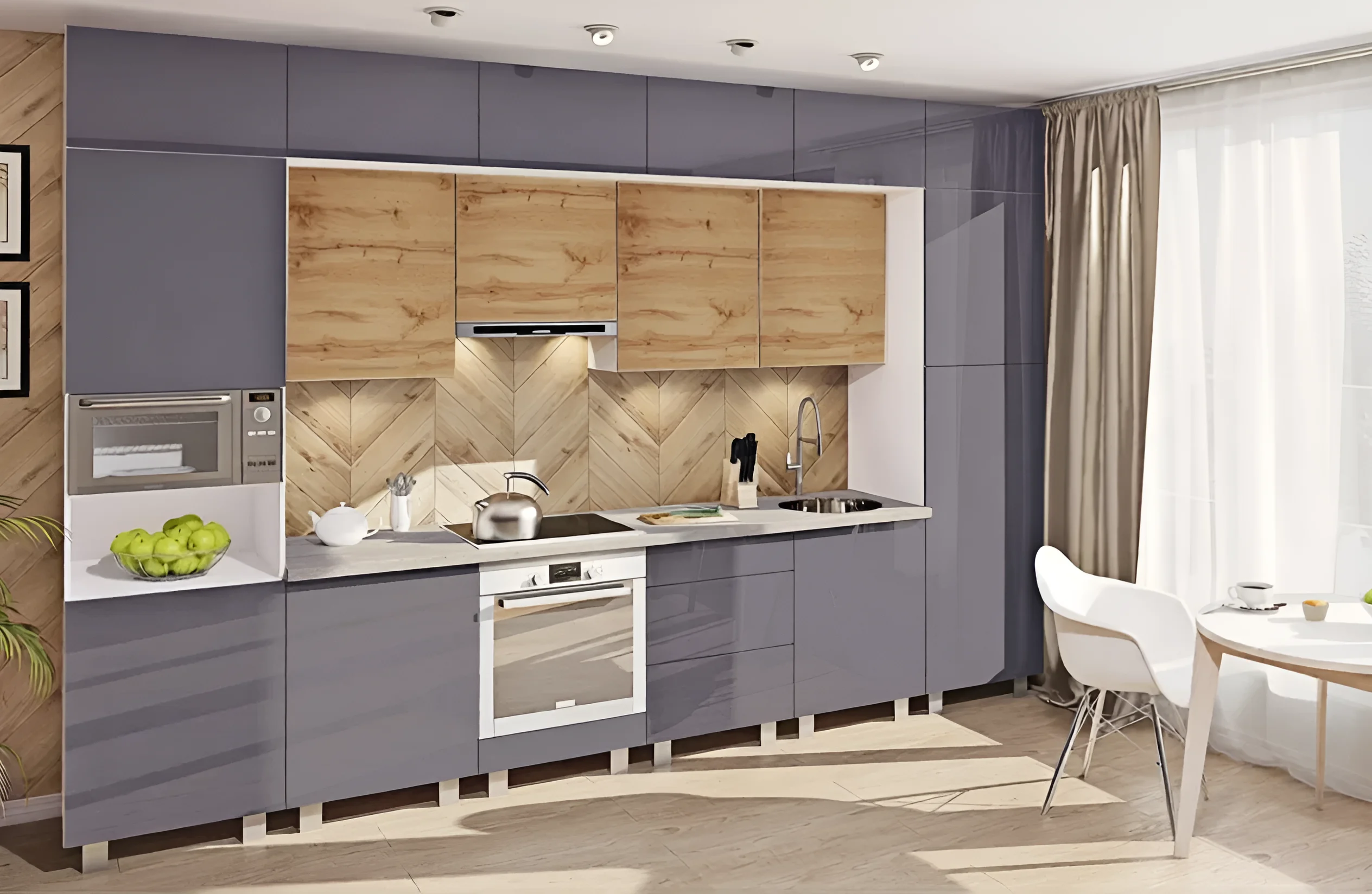 Die Fronten dieser Küche sind eine Geschichte für sich. Sie sind aus hochwertigem MDF gefertigt, das lackiert und zu einem „Hochglanz“ poliert wurde. Dies verleiht der Oberfläche eine außergewöhnliche Glätte und einen Spiegeleffekt. In der Konstruktion der Fronten werden auch MDF-Rahmen und MDF-Einlagen verwendet, was für zusätzliche Festigkeit und ästhetische Attraktivität sorgt. Dank dieser Materialauswahl sehen die Fronten nicht nur teuer und stilvoll aus, sondern zeichnen sich auch durch eine erhöhte Beständigkeit gegen Feuchtigkeit und mechanische Beschädigungen aus, was für Küchenmöbel besonders wichtig ist.