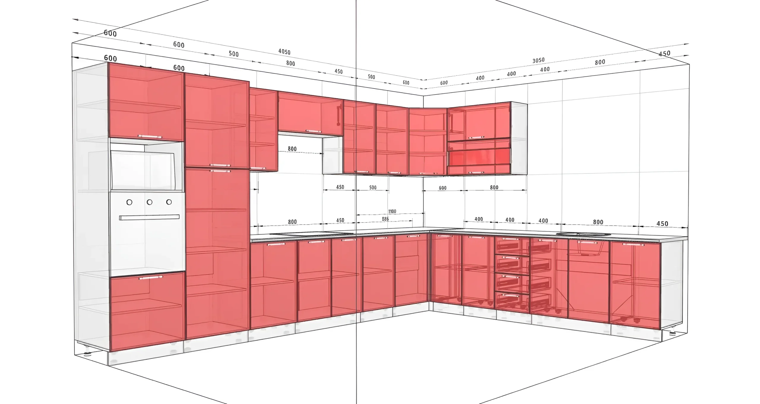 Dieses Küchenmodell hat beeindruckende Abmessungen von 4,05×3,05 Metern, was es zu einer idealen Lösung für geräumige Räume macht. Die Eckkonfiguration ermöglicht eine maximale Raumnutzung und schafft ein praktisches „Arbeitsdreieck“ zwischen Herd, Spüle und Kühlschrank. Die Küchenhöhe beträgt 2,15 Meter (Standard), was einen optimalen Zugang zu allen Elementen gewährleistet. Die Höhe der Oberschränke wird in zwei Varianten angeboten: 720 mm und 920 mm, sodass Sie die am besten geeignete Höhe für die Aufbewahrung von Geschirr und Lebensmitteln wählen und die Küche harmonisch in das Gesamtkonzept des Raumes integrieren können.