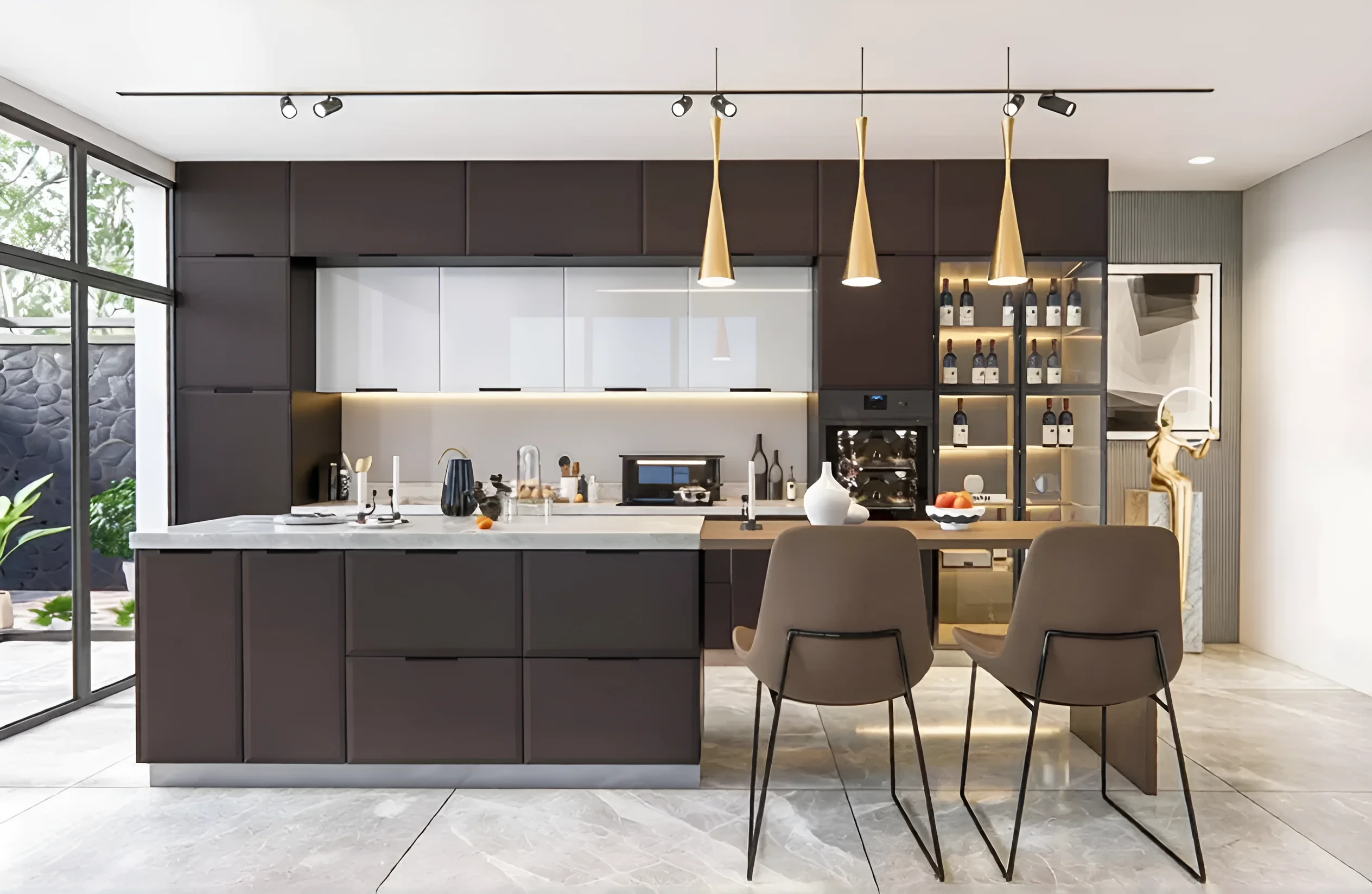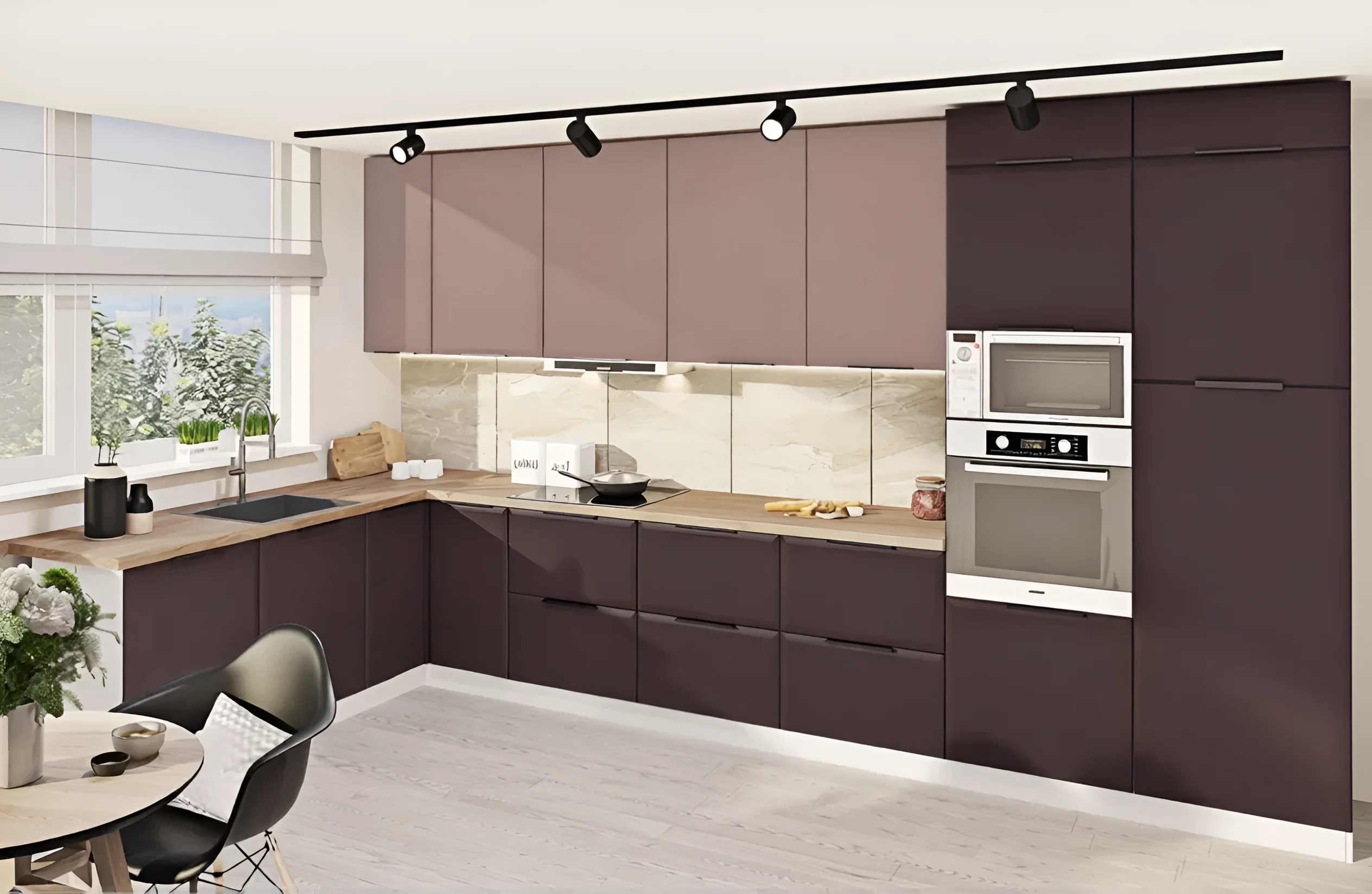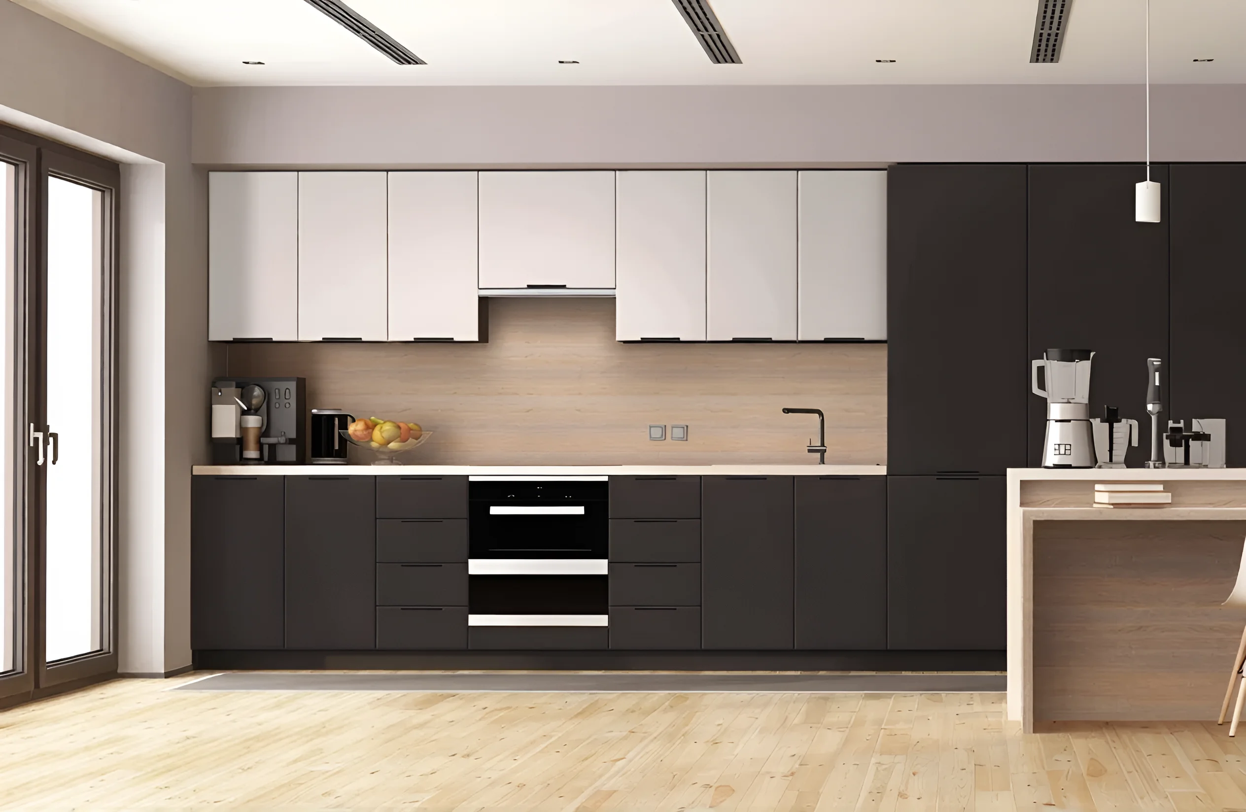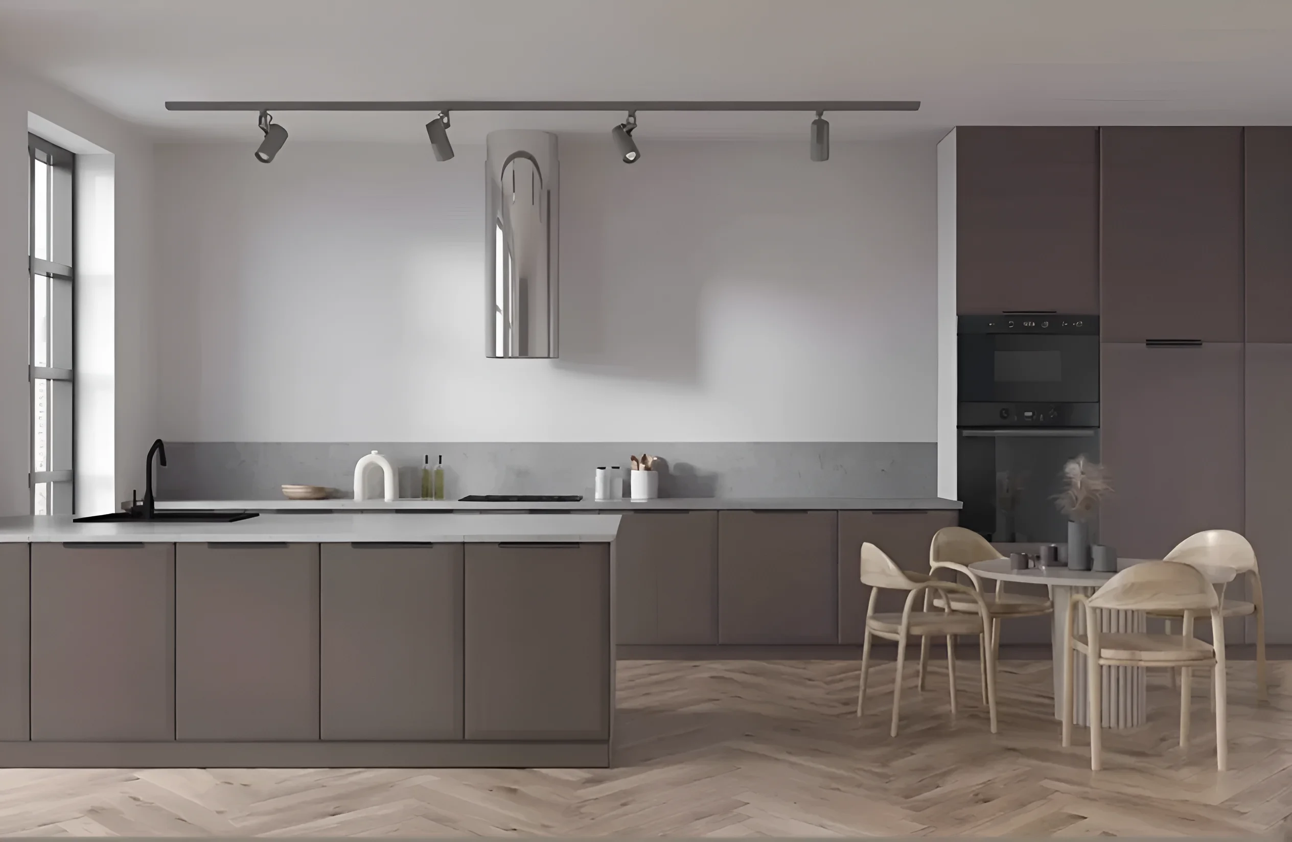 Die „High-Tech“-Küche mit 4,8 Metern wurde unter Berücksichtigung moderner Standards und Bedürfnisse entwickelt. Die Standardhöhe der Küche beträgt 2,15 Meter, was eine effiziente Nutzung des vertikalen Raums ermöglicht und ausreichend Stauraum bietet. Die Länge der Küchenzeile von 4,8 Metern ist optimal für die Schaffung einer vollwertigen Arbeitszone, die alle notwendigen Elemente umfasst – von der Spüle über das Kochfeld bis hin zu integrierten Geräten. Diese Länge ermöglicht die Zonierung des Raumes und sorgt für eine komfortable Bewegung in der Küche, auch bei intensiver Nutzung.
