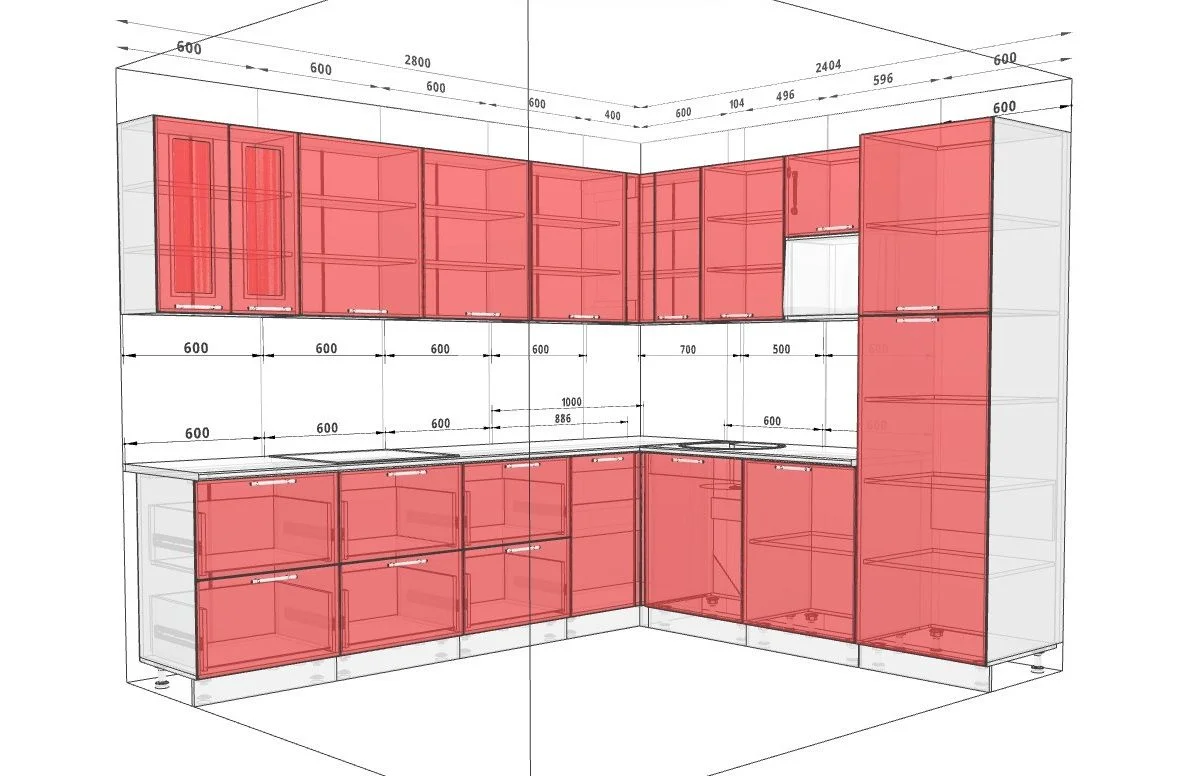 Die Eckkonfiguration der Küche „Sigma Griff“ mit den Maßen 2,8×2,4m ist für die maximale Nutzung des verfügbaren Raumes konzipiert. Dies ist eine ideale Lösung für eine effektive Raumzonierung und die Schaffung eines bequemen Arbeitsdreiecks. Die Gesamthöhe der Küche beträgt 2,15 m, was den Standardparametern entspricht und eine komfortable Nutzung für Menschen unterschiedlicher Körpergröße gewährleistet.