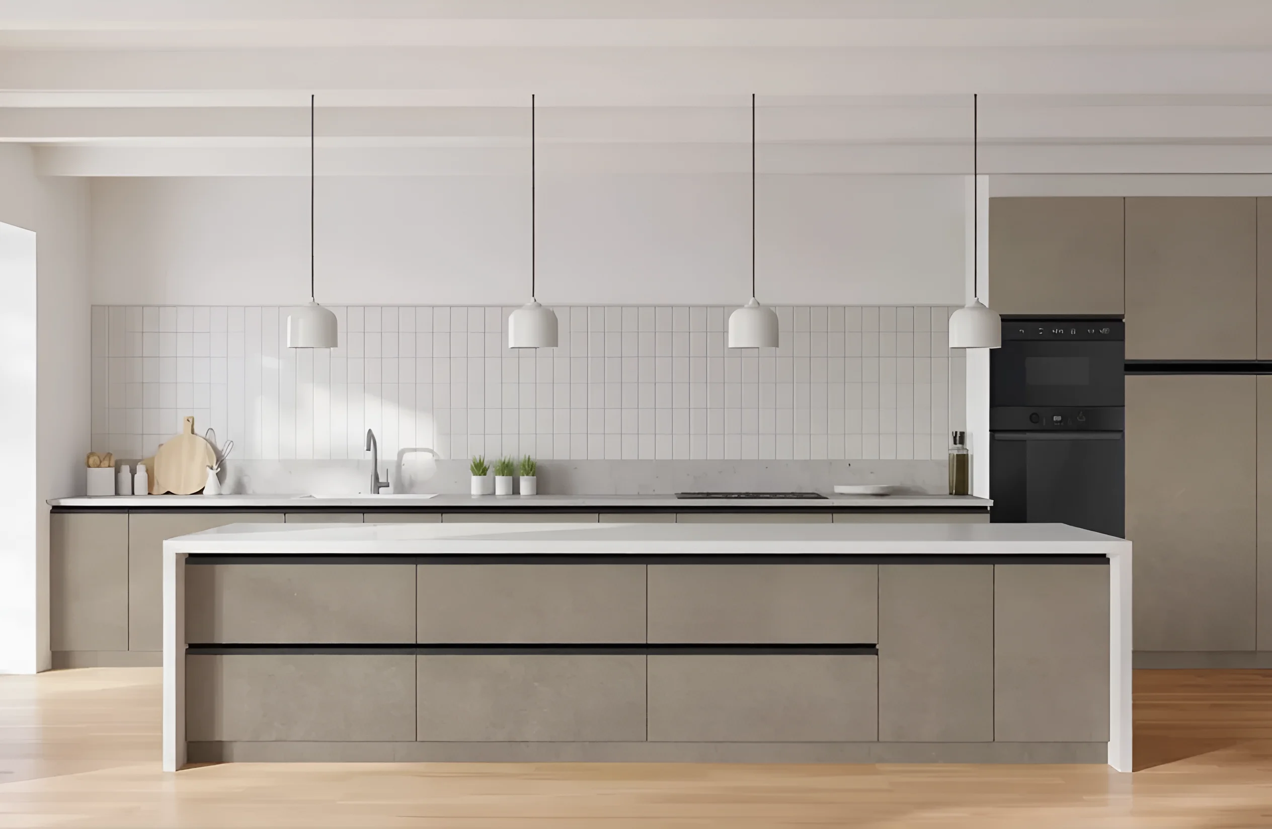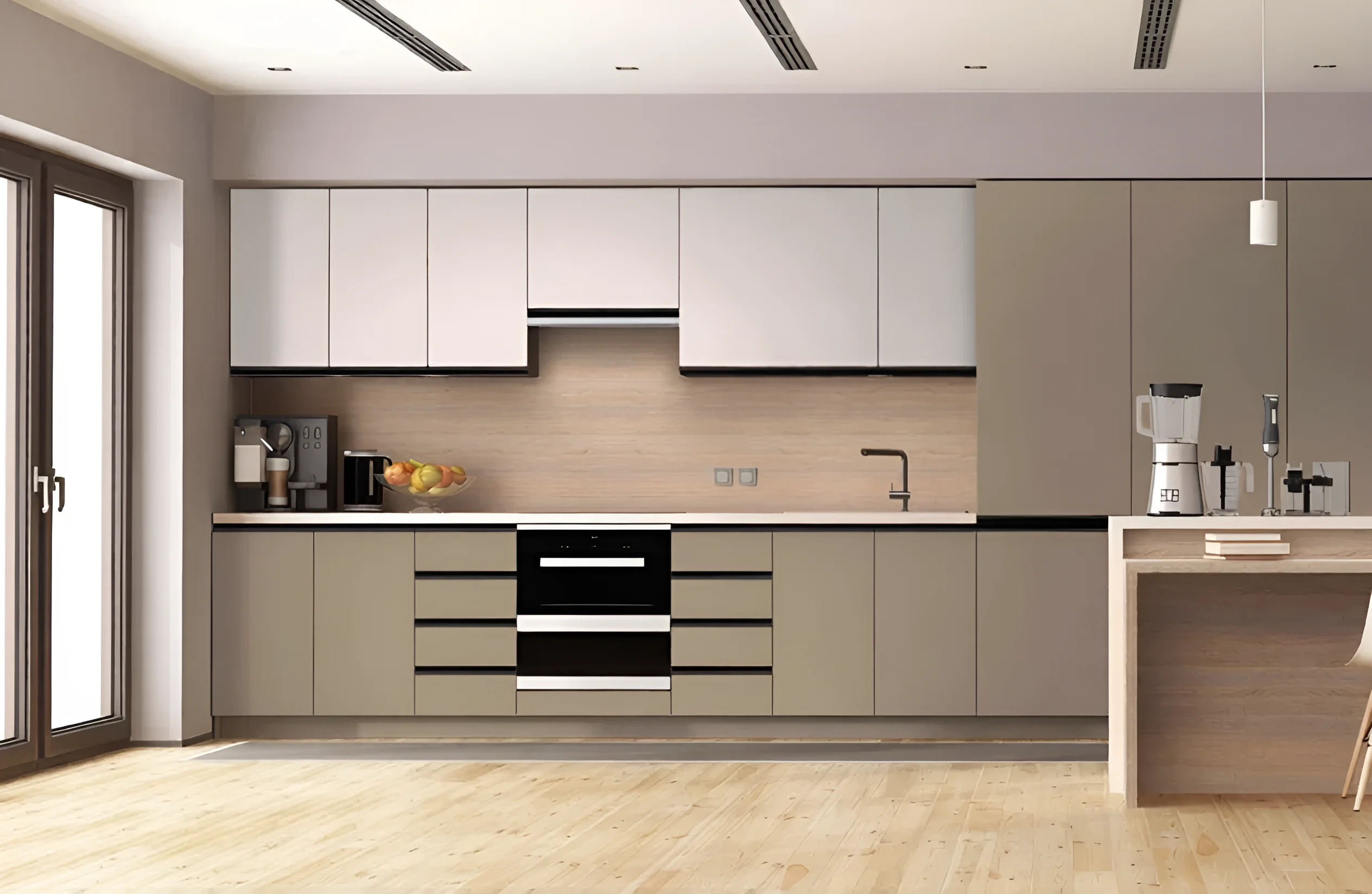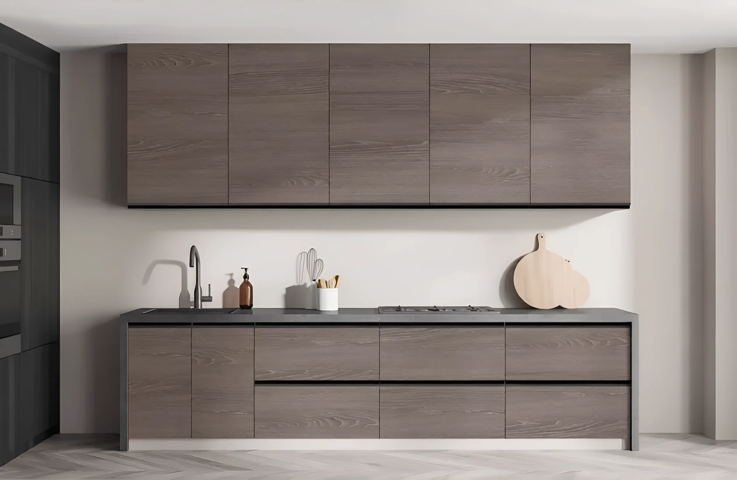 Die Oberschränke werden in zwei Höhenvarianten angeboten: 720 mm und 920 mm. Diese Flexibilität ermöglicht die Kombination von Modulen, um eine einzigartige Komposition zu schaffen, die Ihren Aufbewahrungsbedürfnissen am besten entspricht. Hohe Schränke eignen sich ideal für die Aufbewahrung selten genutzter Gegenstände oder zur Schaffung eines optisch leichteren und geräumigeren Interieurs. Die Unterschränke haben eine Standardtiefe von 450 mm, was optimal für die Integration von Haushaltsgeräten und den bequemen Zugriff auf den Inhalt ist. Die Tiefe der Arbeitsplatte beträgt 600 mm und bietet eine ausreichend geräumige und komfortable Arbeitsfläche für alle kulinarischen Aufgaben. Die durchdachte Ergonomie jedes Moduls ermöglicht es, alles Notwendige in Reichweite zu platzieren, was den Kochprozess maximal komfortabel und angenehm macht.