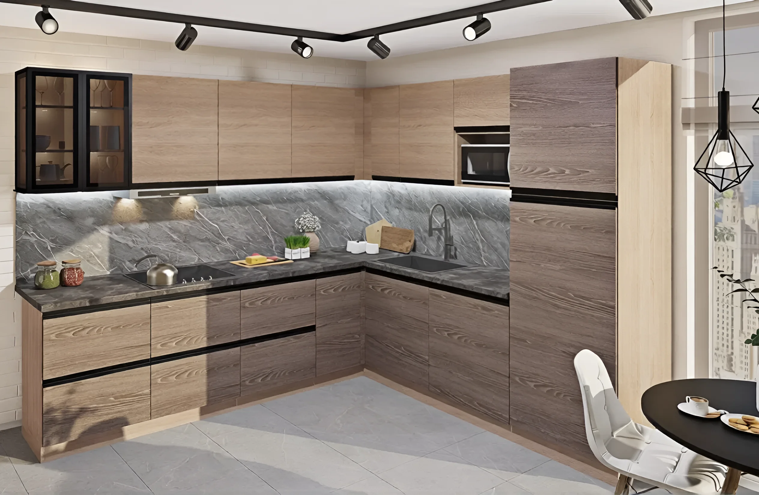 Das Design der Küche „Sigma Griff“ ist die Verkörperung modernen Minimalismus und natürlicher Schönheit. Die Küchenfronten sind in zwei edlen Farbtönen gehalten, die eine natürliche Holztextur imitieren: das helle und warme Sonoma Eiche mit einer ausgeprägten Maserung, die dem Raum Leichtigkeit und Luftigkeit verleiht, sowie das tiefe und satte Trüffeleiche, das dem Interieur Raffinesse und Solidität verleiht. Die Kombination dieser Farben schafft ein dynamisches, aber dennoch ausgewogenes Erscheinungsbild, das sich harmonisch sowohl in helle als auch in kontrastreichere Designlösungen einfügt.