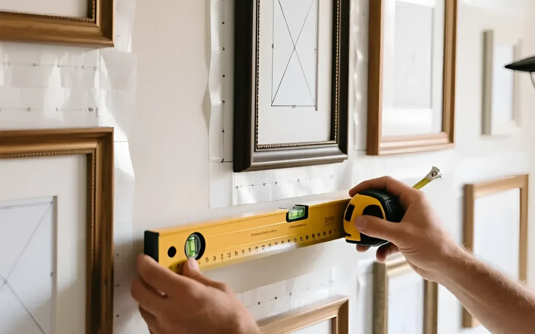 Правильно расположенный декор стен значительно повышает визуальный комфорт пространства, выступая как фокусная точка или связующий элемент между различными зонами. Использование шаблонов (как показано) гарантирует, что галерея будет идеально выровнена горизонтально и вертикально, что важно для восприятия порядка в жилых комнатах, кабинетах или прихожих. Точность установки исключает визуальный шум и усталость глаз.