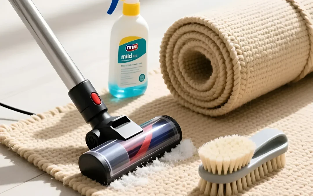 При выборе обратите внимание на плотность плетения: чем оно плотнее, тем меньше вероятность быстрого износа. Для поддержания свежести рекомендуется регулярная сухая чистка специальным абсорбирующим порошком, как показано на фото, с последующим тщательным пылесосением и периодической обработкой мягкой щеткой.
