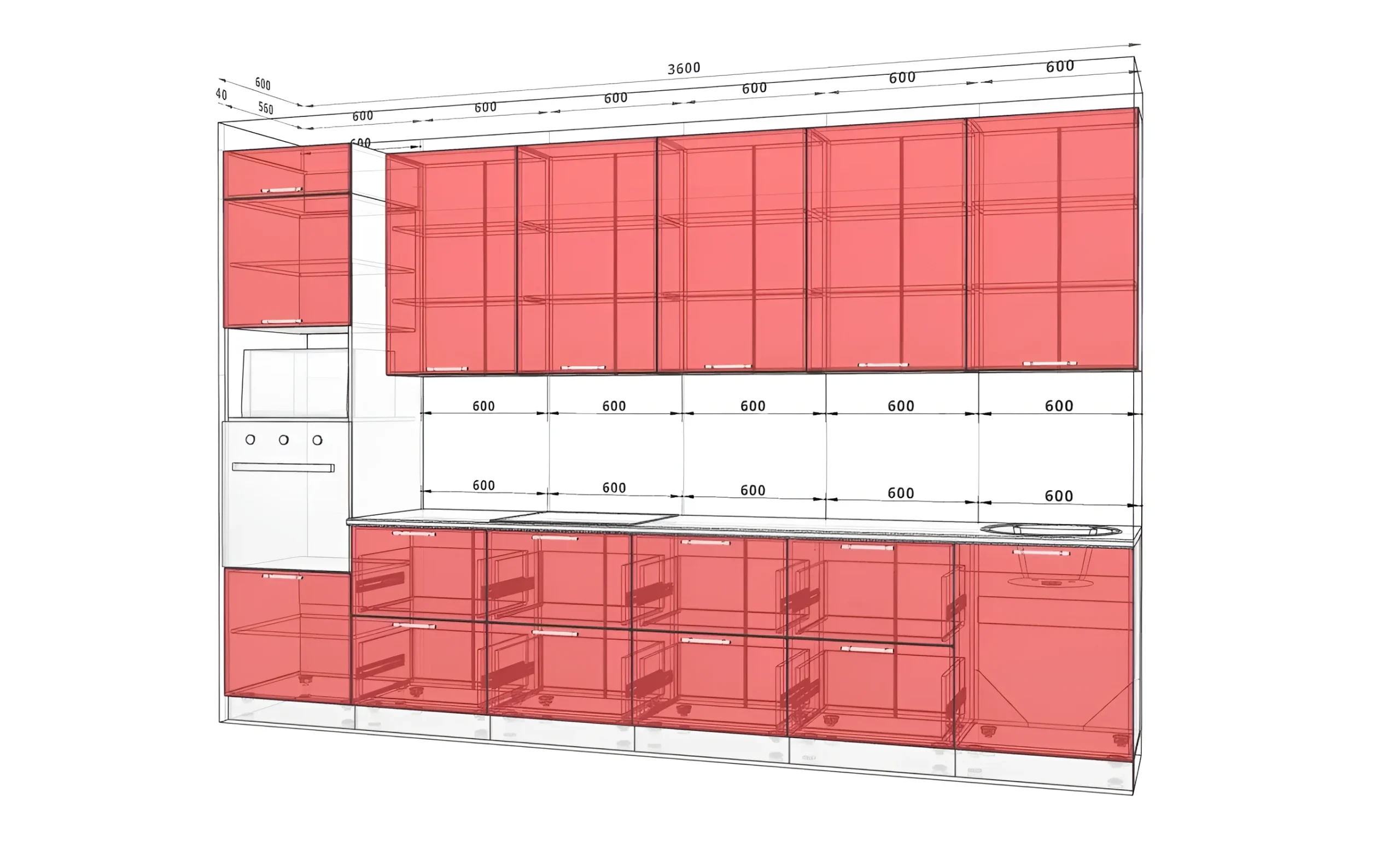 Общая длина кухни составляет 3,6 метра, что делает ее подходящей для помещений средней и большой площади. Стандартная высота кухни в 2,15 метра позволяет органично вписать ее в большинство типовых интерьеров, обеспечивая удобный доступ ко всем элементам. Верхние шкафы предлагаются в двух вариантах высоты: 720 мм и 920 мм. Это дает возможность выбрать конфигурацию, которая наилучшим образом соответствует вашим потребностям в хранении и визуальным предпочтениям. Более высокие шкафы (920 мм) позволяют максимально использовать вертикальное пространство, предоставляя дополнительное место для утвари и продуктов. Глубина нижних тумб составляет стандартные 450 мм, что обеспечивает достаточный объем для хранения посуды и кухонной техники, при этом оставляя достаточно свободного пространства для перемещения. Столешница имеет стандартную глубину 600 мм, что является идеальным решением для комфортной работы, установки мойки и варочной поверхности. Все эти параметры продуманы для создания максимально эргономичного и удобного рабочего пространства.