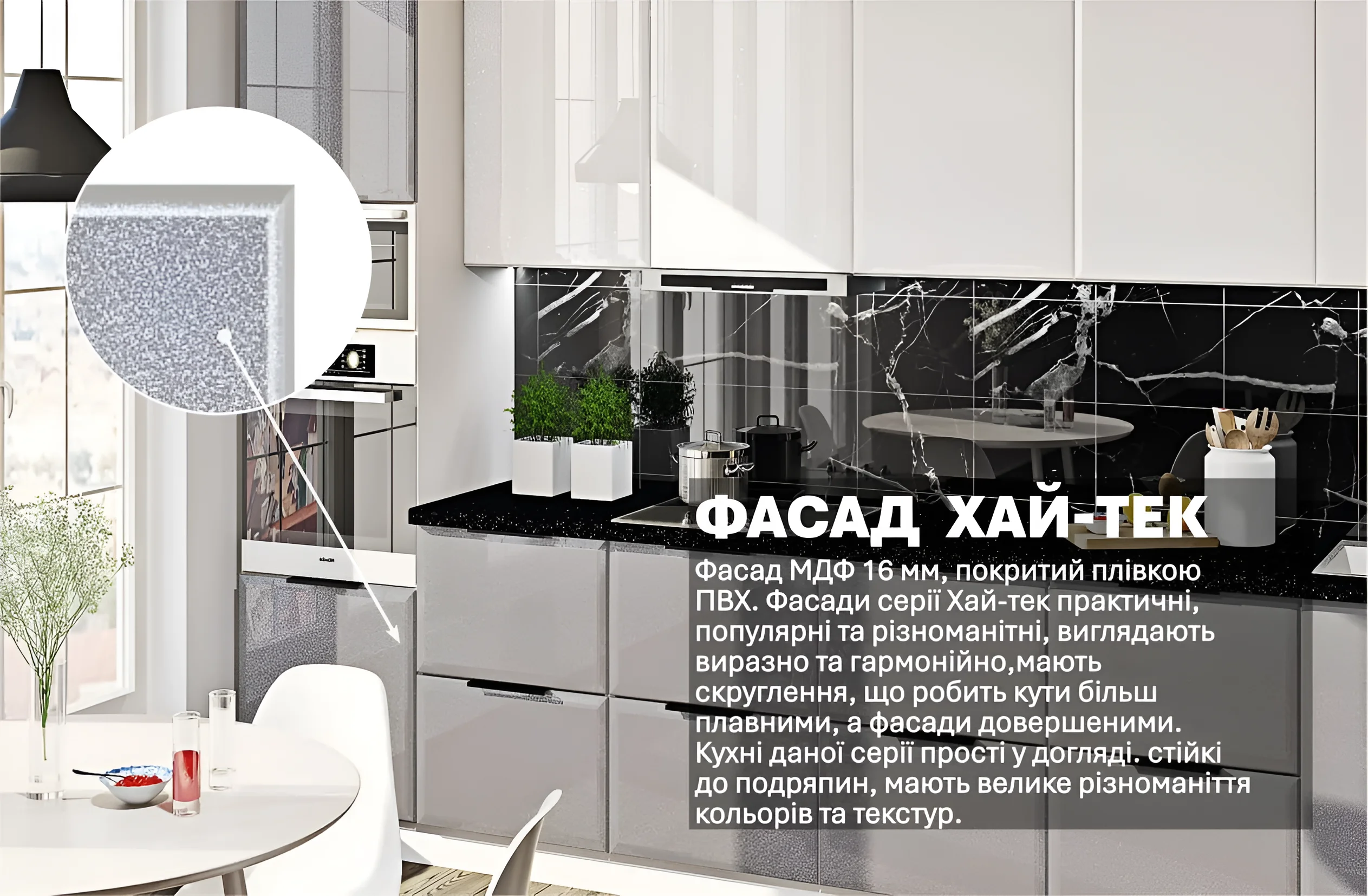 Серия “Хай-тек глянец” говорит сама за себя. Фасады кухни выполнены из высококачественного МДФ и покрыты глянцевой ПВХ-пленкой, что придает им роскошный блеск и визуальную глубину. Цветовое решение — белый и металлик — это классика современного дизайна, которая никогда не выйдет из моды. Белый цвет добавляет света и простора, металлик придает интерьеру футуристические нотки и изысканность. Глянцевое покрытие не только выглядит стильно, но и обладает практичностью: за ним легко ухаживать, поддерживая идеальную чистоту и сияние вашей кухни. Такая поверхность прекрасно отражает свет, делая помещение более светлым и визуально просторным. Дизайн гармонично сочетает в себе эстетическую привлекательность и полную функциональность, что особенно важно для активной кухонной зоны.