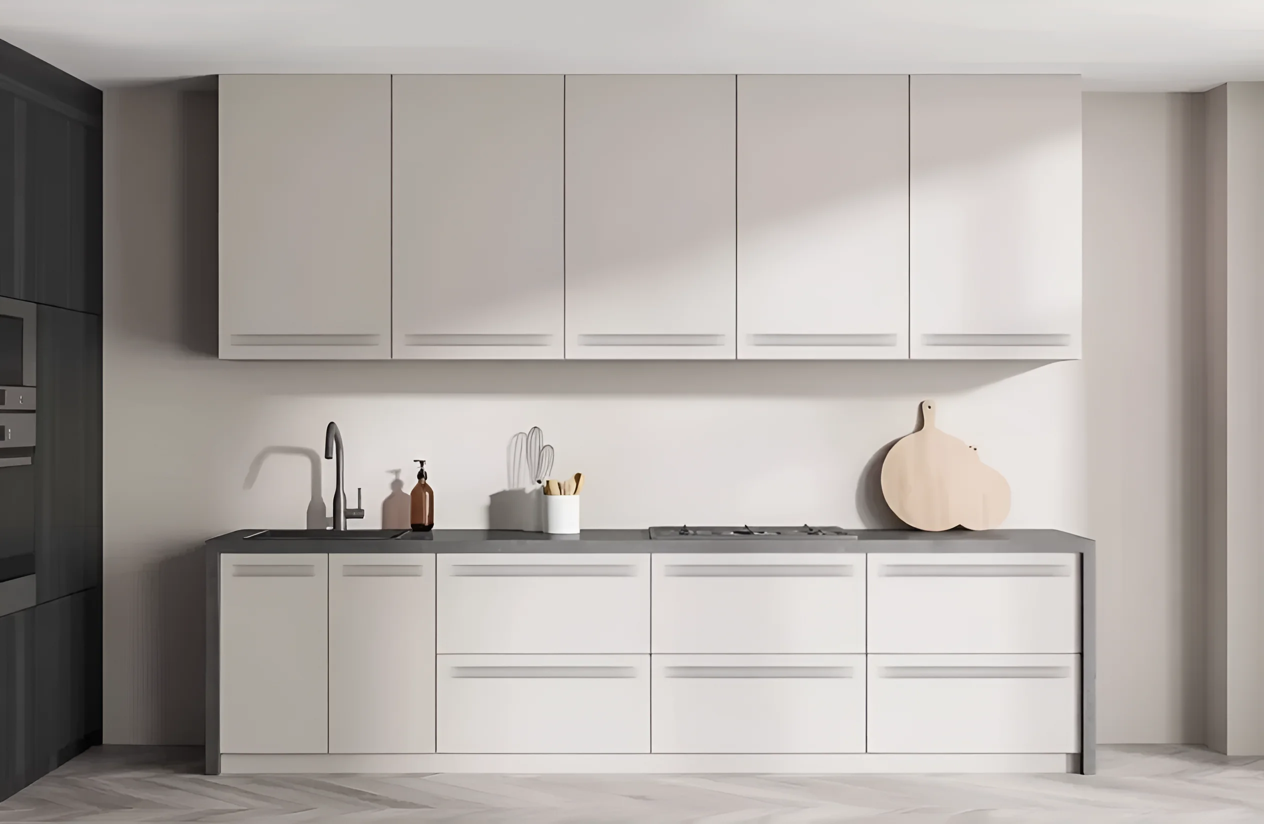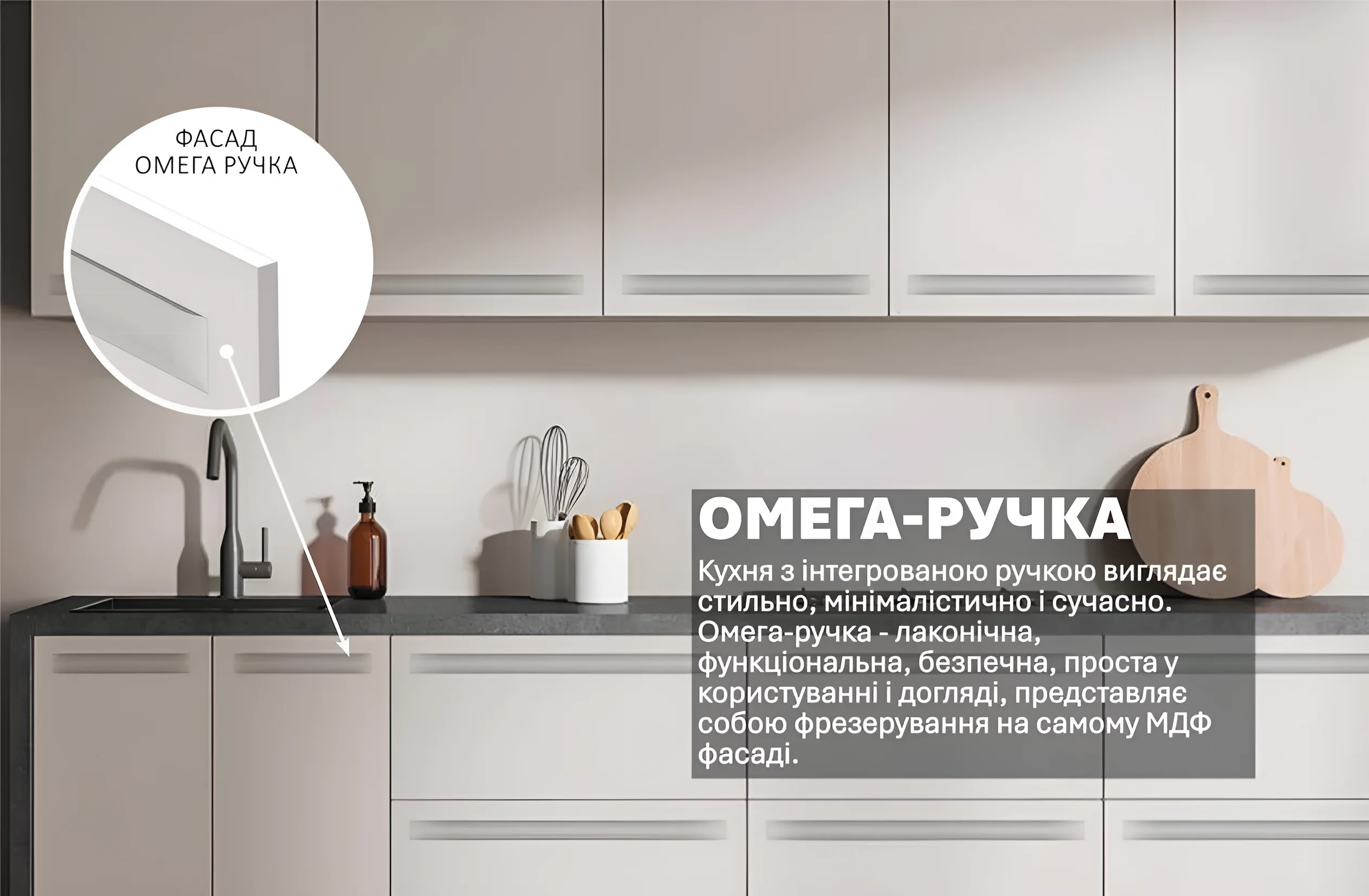 The “Alpha Handle” kitchen is made from proven and durable materials, ensuring its long service life and preservation of its impeccable appearance. The fronts are made of MDF, which is known for its strength, moisture resistance, and ability to hold its shape well, which is critical for kitchen furniture constantly exposed to moisture and steam. The finish of the fronts is painted matte MDF, which guarantees not only a superb appearance but also color durability, resistance to fading from sunlight, and ease of care. The kitchen carcass is made of high-quality chipboard (DSP), a material that ensures the strength and stability of the entire set. This combination of materials – painted MDF for the fronts and DSP for the carcass – guarantees a long service life for your kitchen and the preservation of its original appearance for many years, even with intensive use. We carefully select material suppliers to offer you only the best.