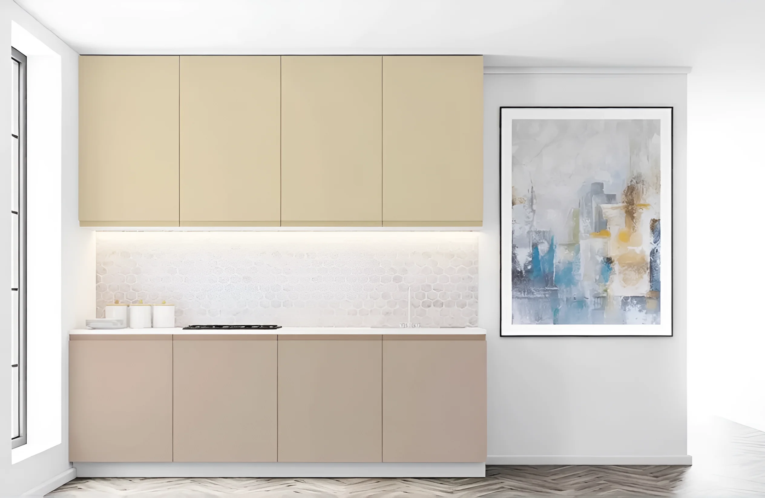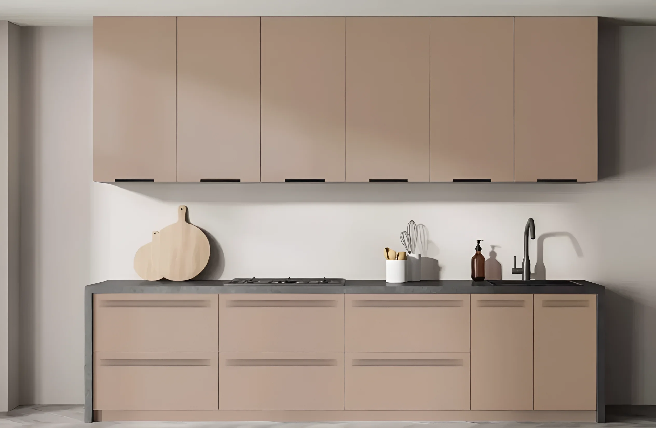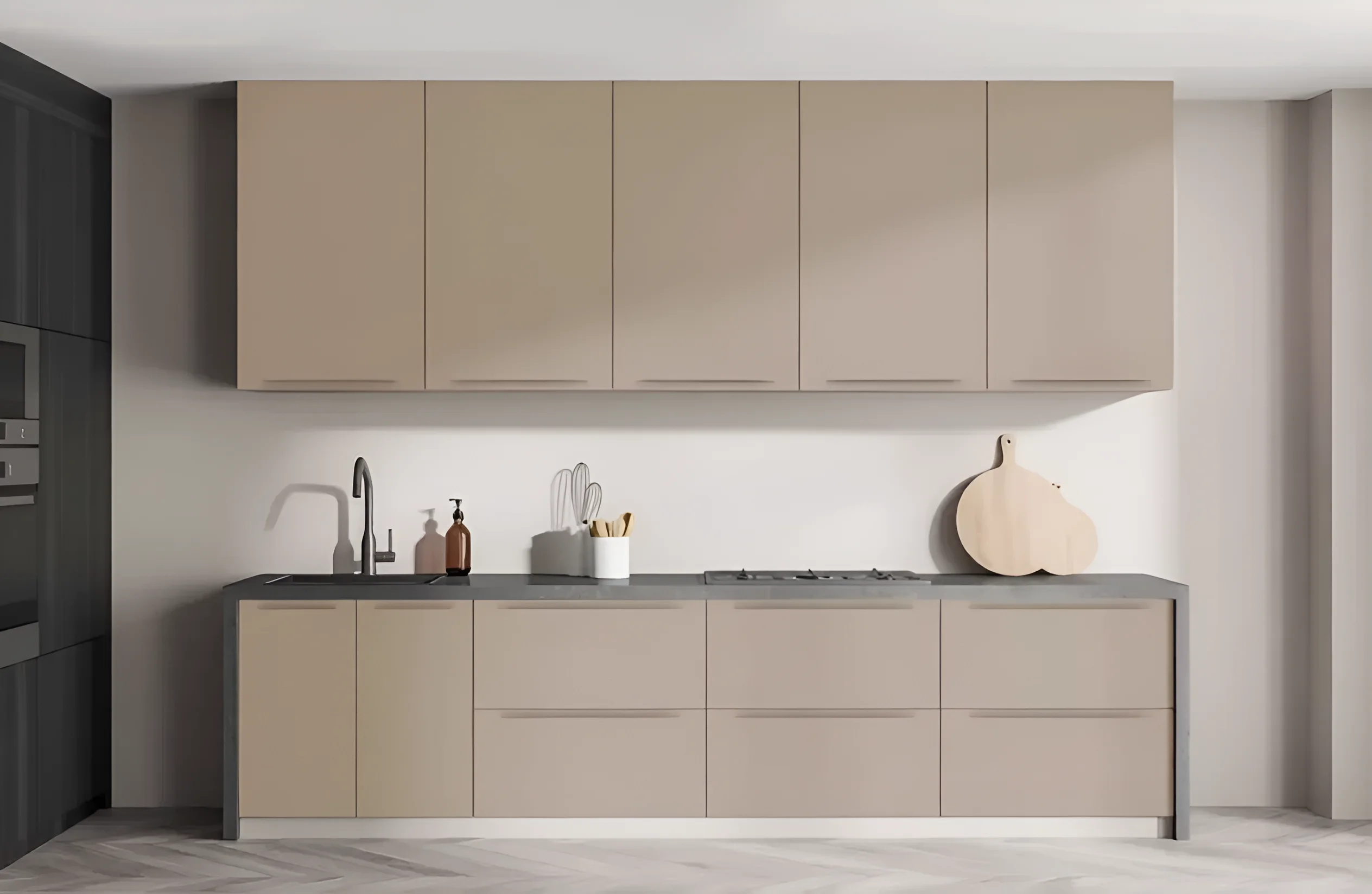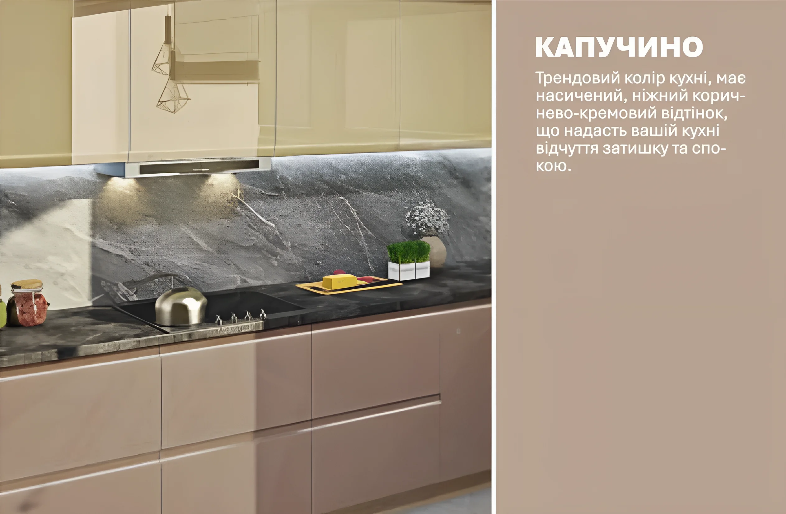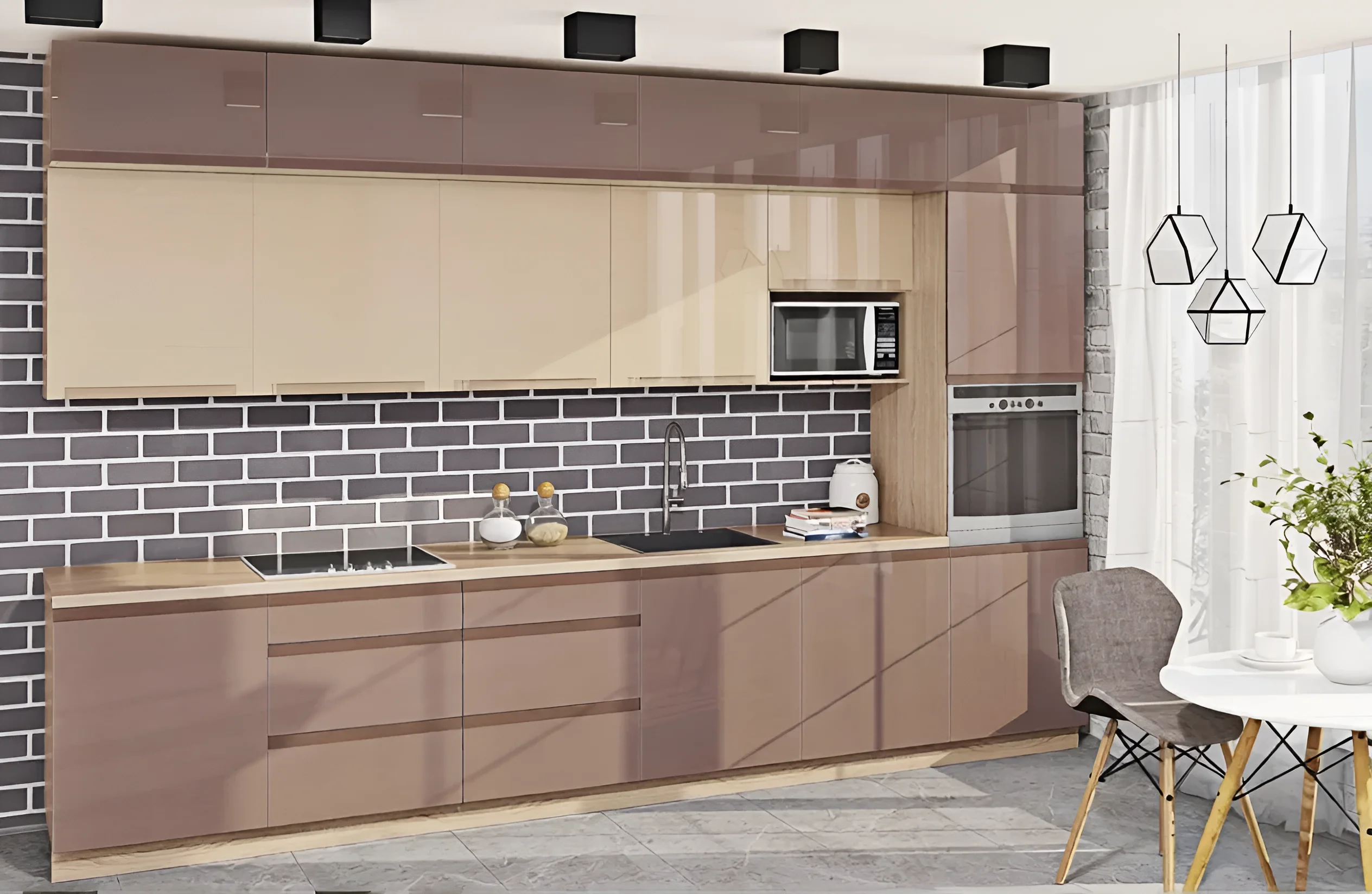 The “Alpha Handle” kitchen is made in delicate and versatile shades of Cappuccino and Cream. These colors create an atmosphere of warmth and comfort, perfectly harmonizing with various interior styles – from minimalism to modern classic. Glossy painted MDF facades not only give the kitchen a refined and luxurious look but also visually expand the space, filling it with light. The absence of protruding handles, characteristic of the “Alpha Handle” series (as is often implied in the modern design of such series), emphasizes the laconic and modern style, making the lines clean and continuous. Such a kitchen will easily fit into both a spacious dining room and a cozy kitchen-living room, becoming a bright accent of your home.