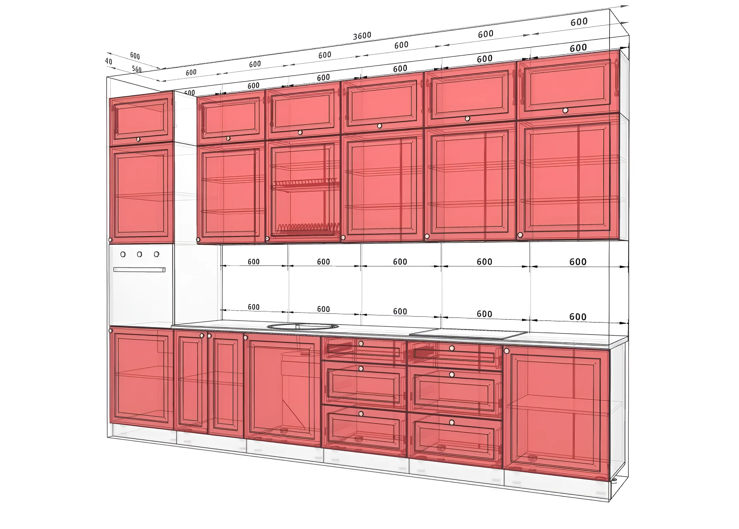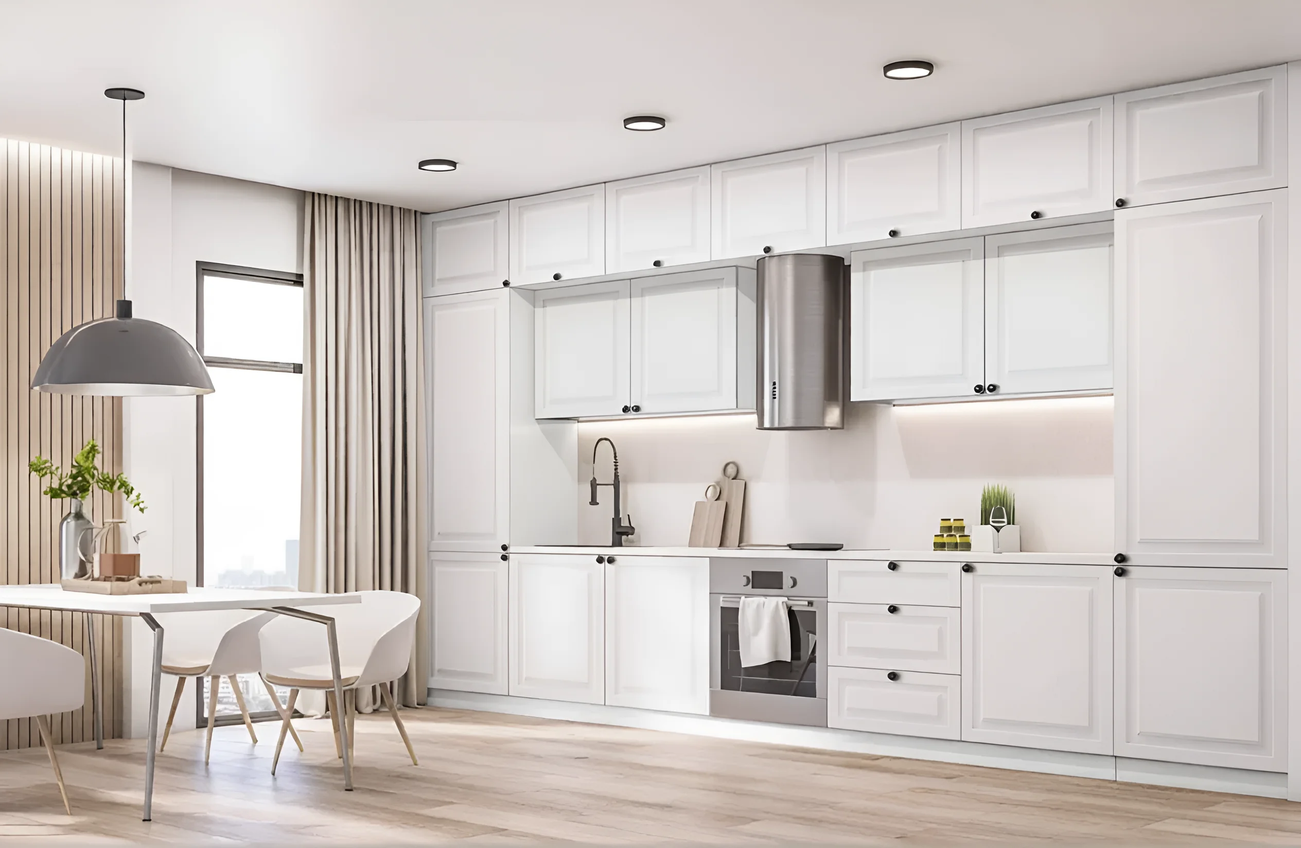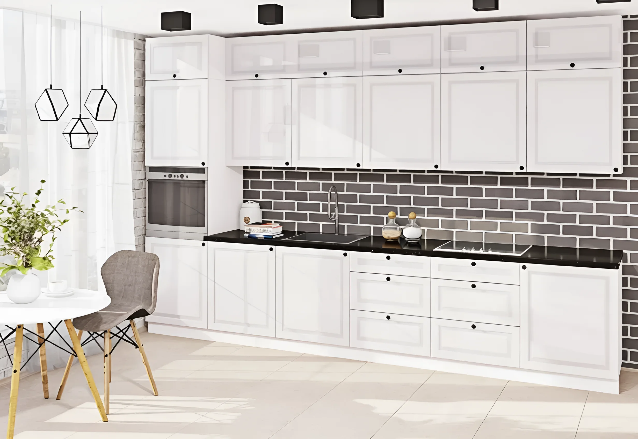The “Atlanta” kitchen, 3.6 meters long, is ideal for spacious rooms, offering maximum workspace and storage. A distinctive feature of this model is its impressive height – 2.5 meters, which allows it to be mounted “up to the ceiling.” This solution not only creates a sense of monolithic unity and completeness of the interior but also provides additional storage space thanks to mezzanines, where rarely used items or seasonal dishes can be stored. High upper cabinets, available in two height options – 1080 mm and 1280 mm, allow for maximum efficient use of vertical space while maintaining lightness and airiness. The white color of the fronts visually expands the space, fills it with light, and makes the interior “cleaner” and more modern.