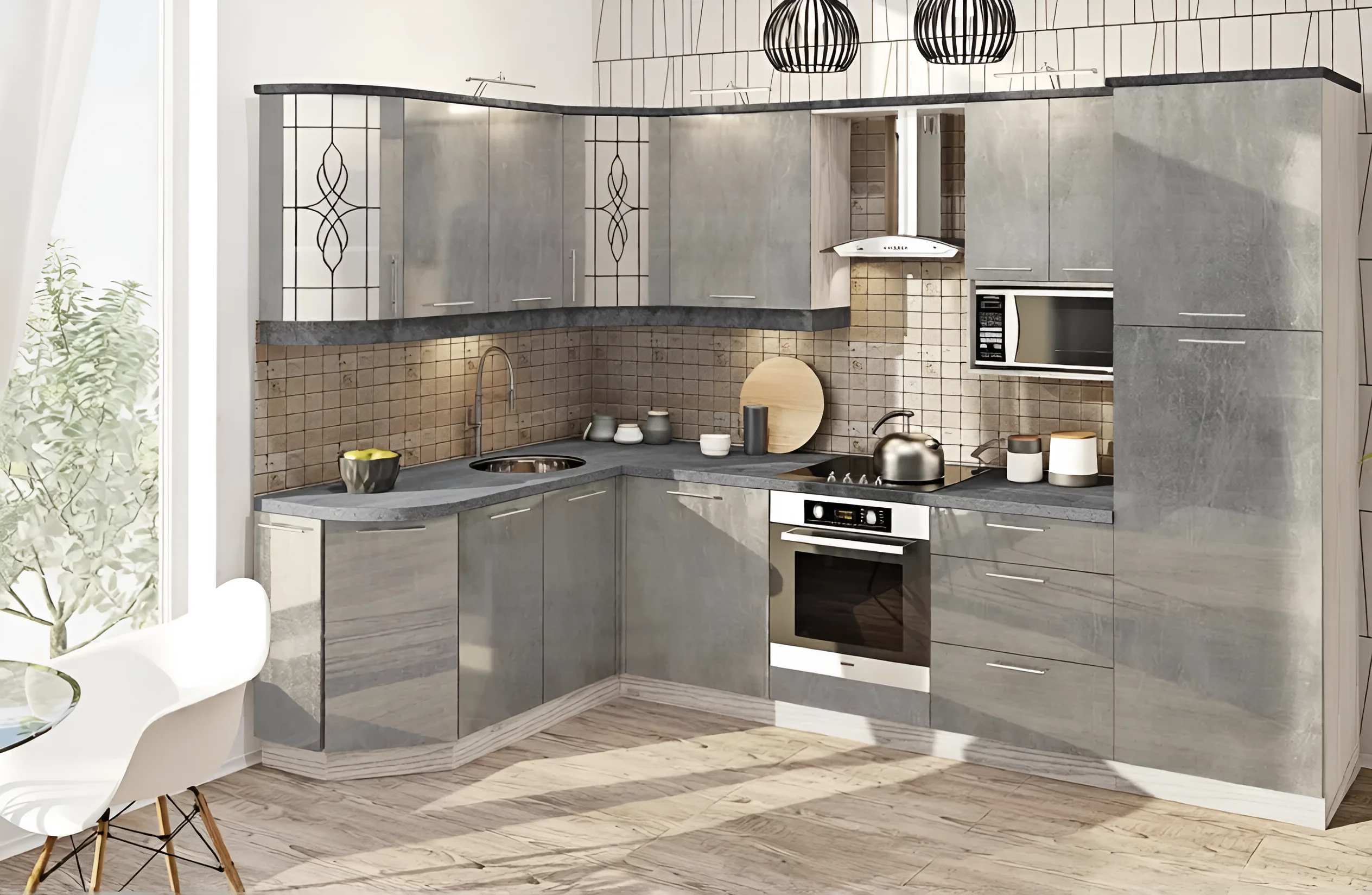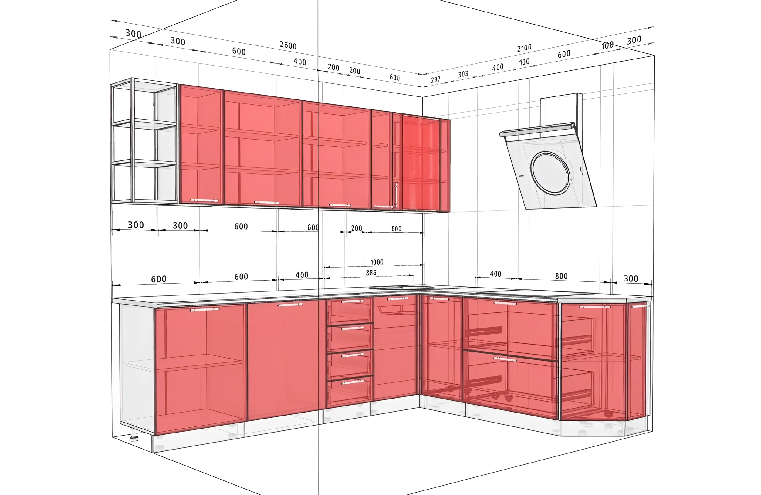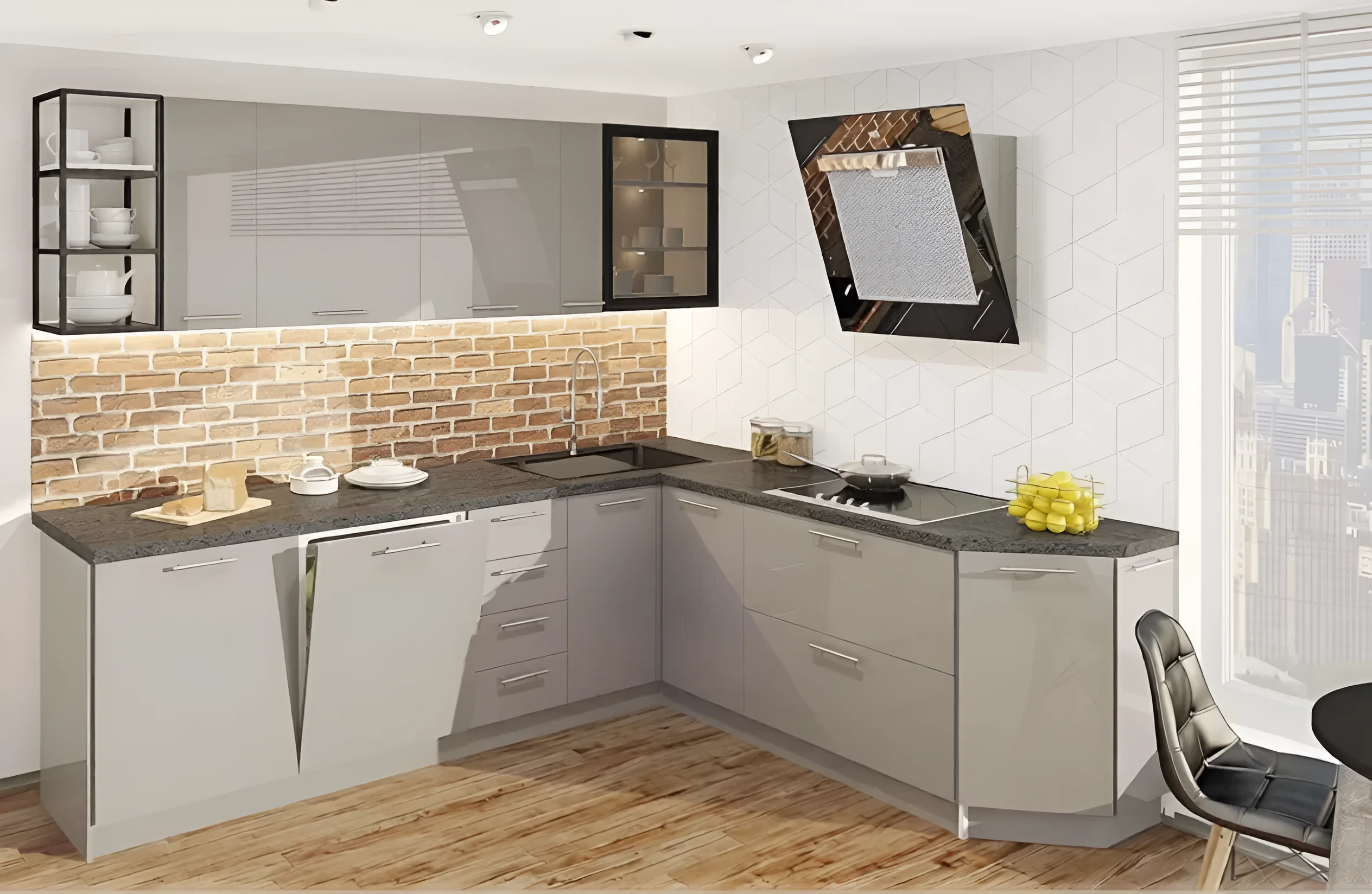 The “Painted High Gloss” 2.6 x 2.1 m corner kitchen in Cashmere is designed with all the needs of a modern hostess in mind. The corner design allows for the creation of a convenient “work triangle” between the stove, sink, and refrigerator, minimizing unnecessary movements during cooking. The depth of the lower cabinets is 450 mm, which is considered standard and optimal for storing dishes, kitchen utensils, and small appliances. The countertop depth of 600 mm is also standard, providing a spacious enough work surface for comfortable cooking and food preparation. You can choose the height of the upper cabinets that perfectly suits your height and needs: options of 720 mm and 920 mm are available, allowing for maximum efficient use of vertical space and keeping everything you need at hand.