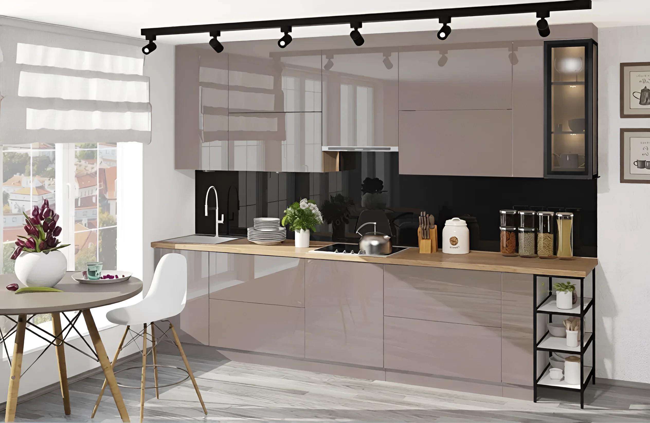 The facades of this kitchen are made of high-quality MDF, coated with a high-gloss paint. This coating not only gives the kitchen an incredibly stylish and modern look but also makes its surface perfectly smooth, reflecting light and visually expanding the space. The Cashmere color is the embodiment of elegance and versatility. It harmonizes perfectly with various interior styles, from minimalism to modern classic, allowing for easy selection of other decor elements. The high-gloss finish of the facades is not only beautiful but also practical: it is moisture-resistant and easy to clean from dirt, which significantly simplifies kitchen maintenance. The facade material, despite the MDF coating, includes chipboard elements to ensure the strength and durability of the structure, guaranteeing a long service life for your new kitchen. The kitchen carcass is also made of durable chipboard, ensuring the stability and reliability of the entire structure. The total height of the kitchen is 2.15 meters, which is standard and convenient for most users.