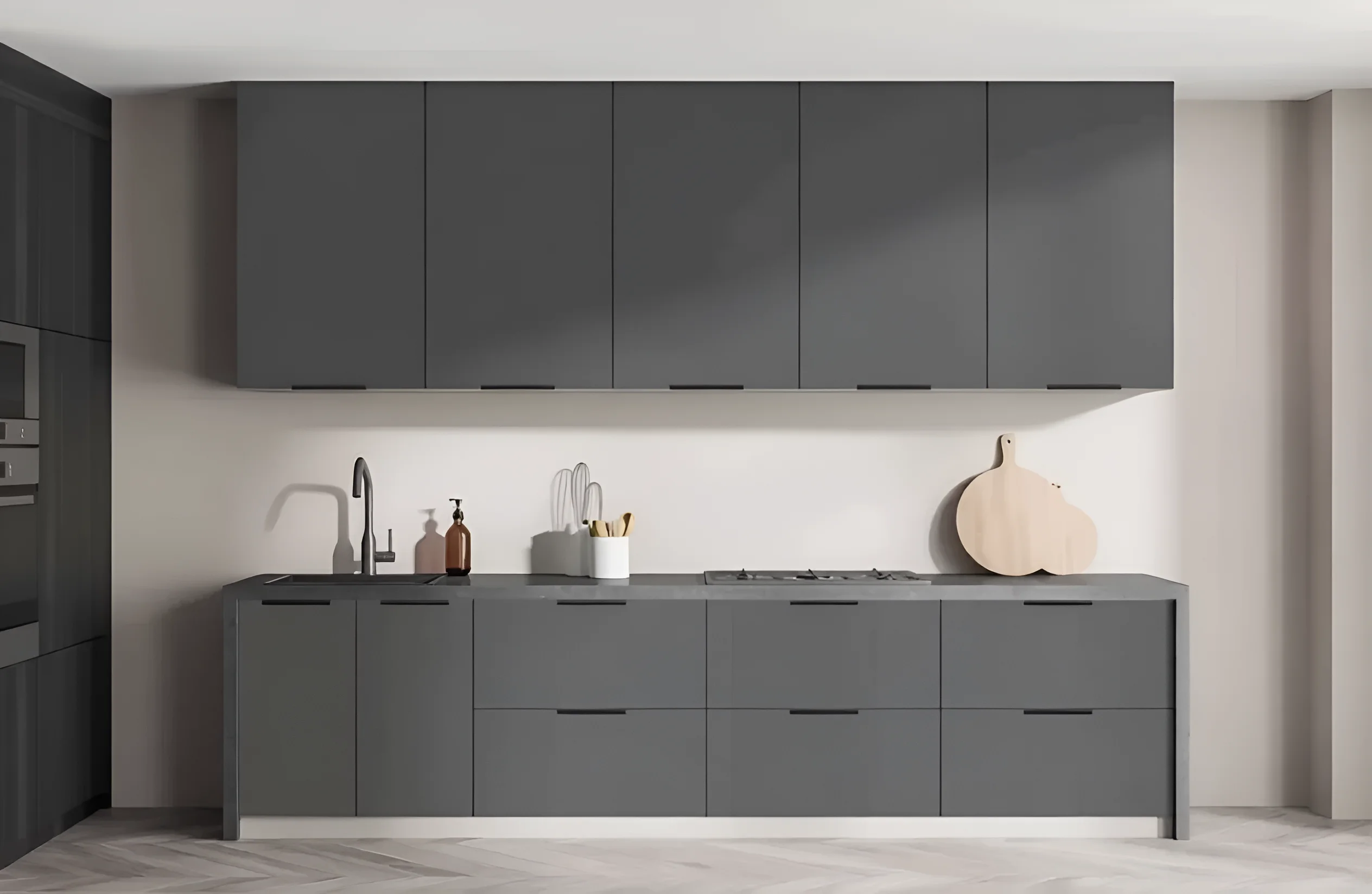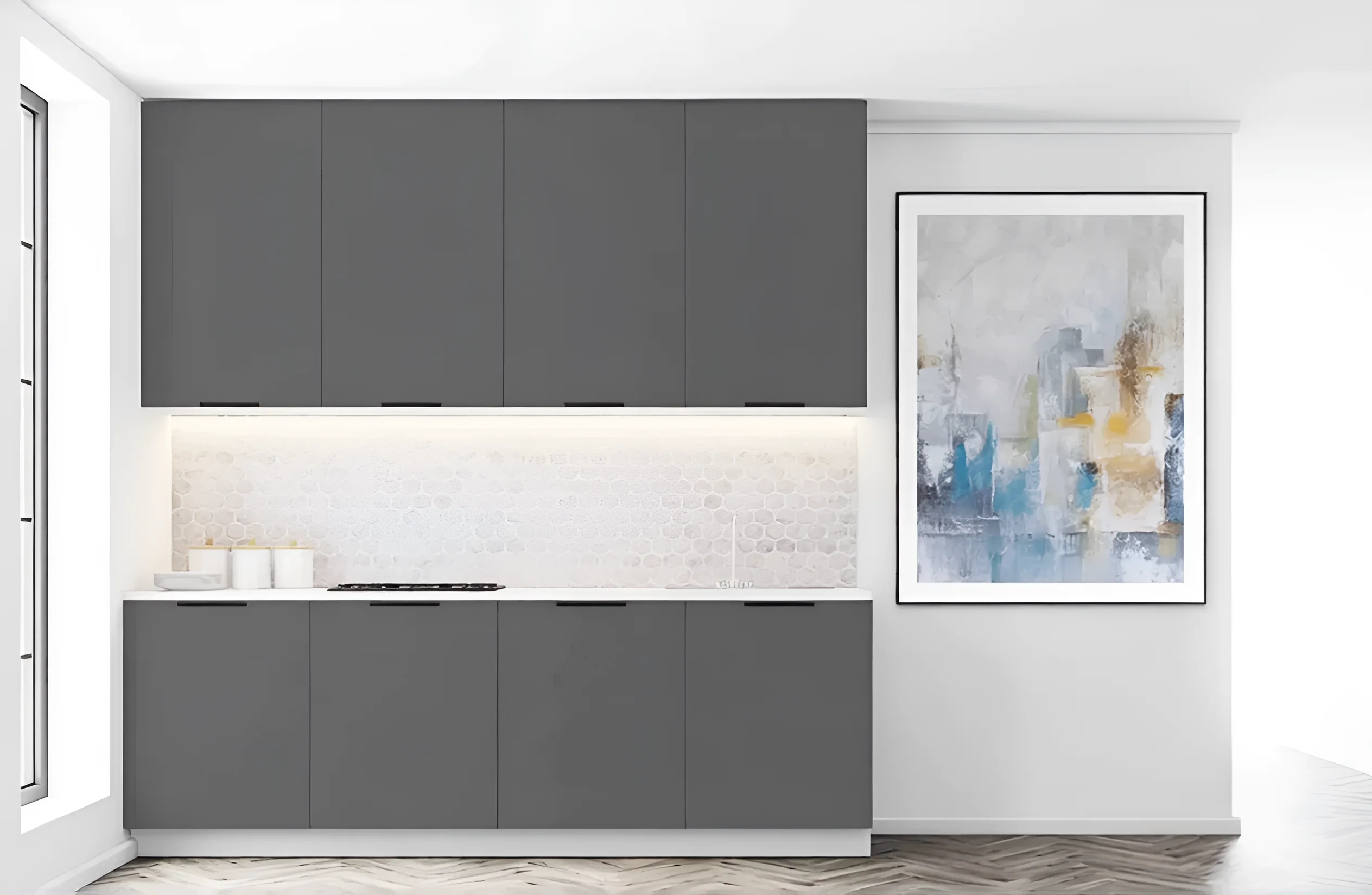 High-quality MDF (medium-density fiberboard) is used for the production of facades, valued for its density, uniform structure, and resistance to external influences. The painted matte finish is applied using modern technologies, ensuring perfect smoothness and color durability. This coating does not fade over time, is resistant to abrasion, and is easy to clean from dirt, which is critically important for kitchen furniture.