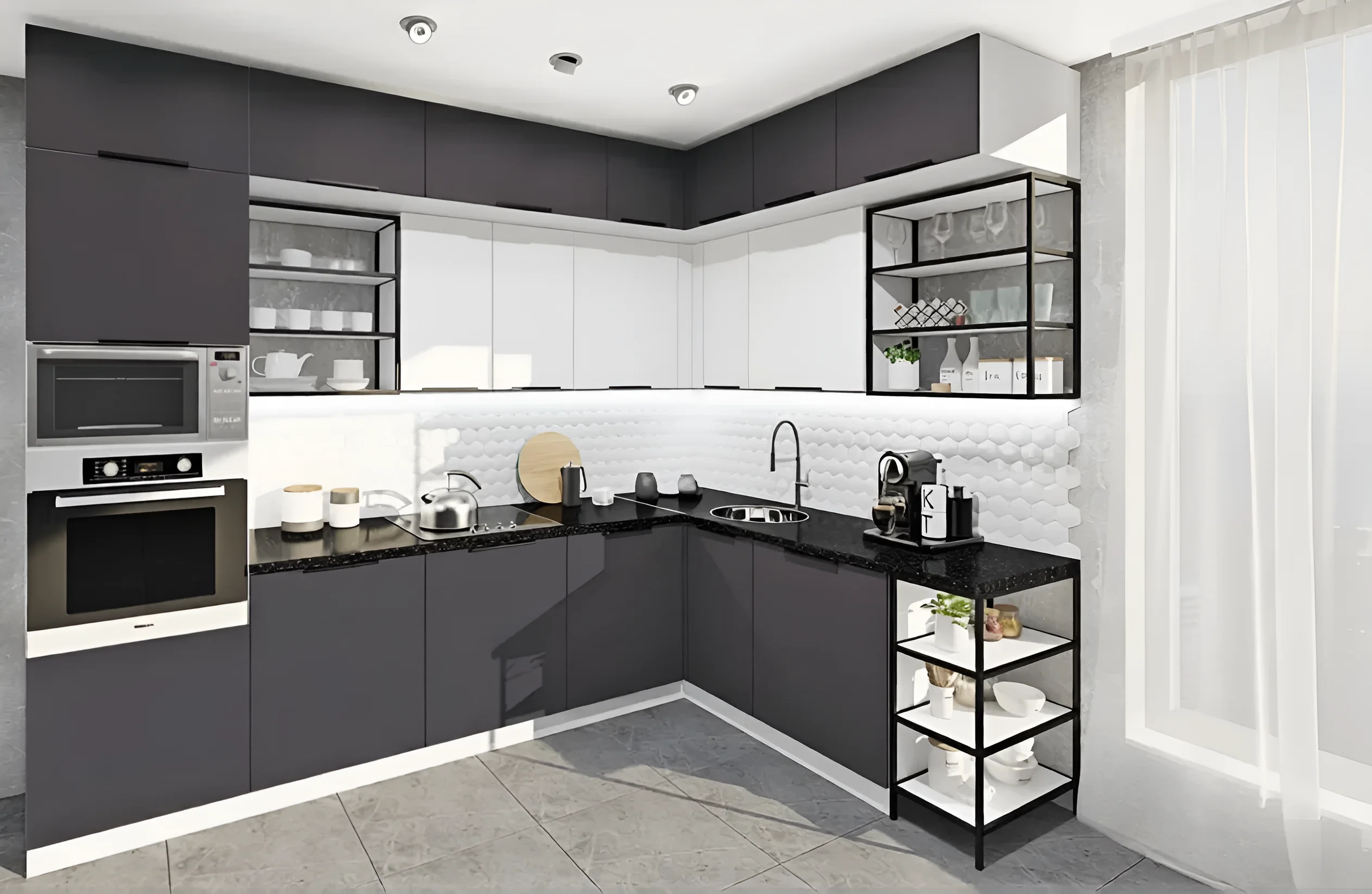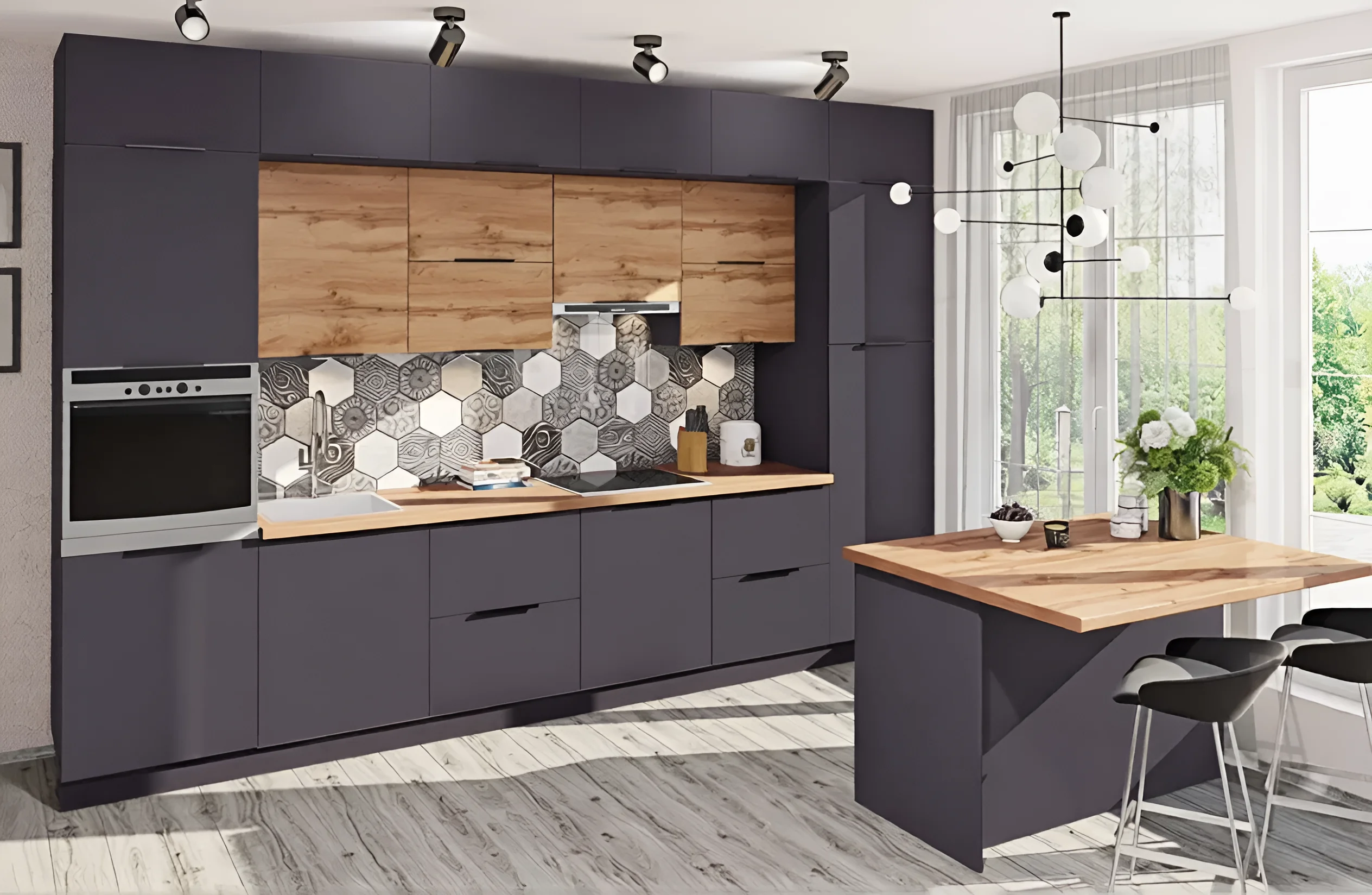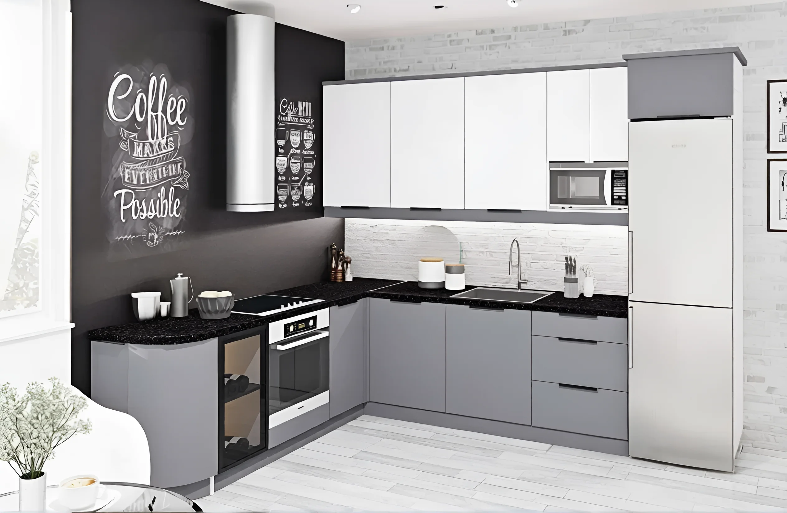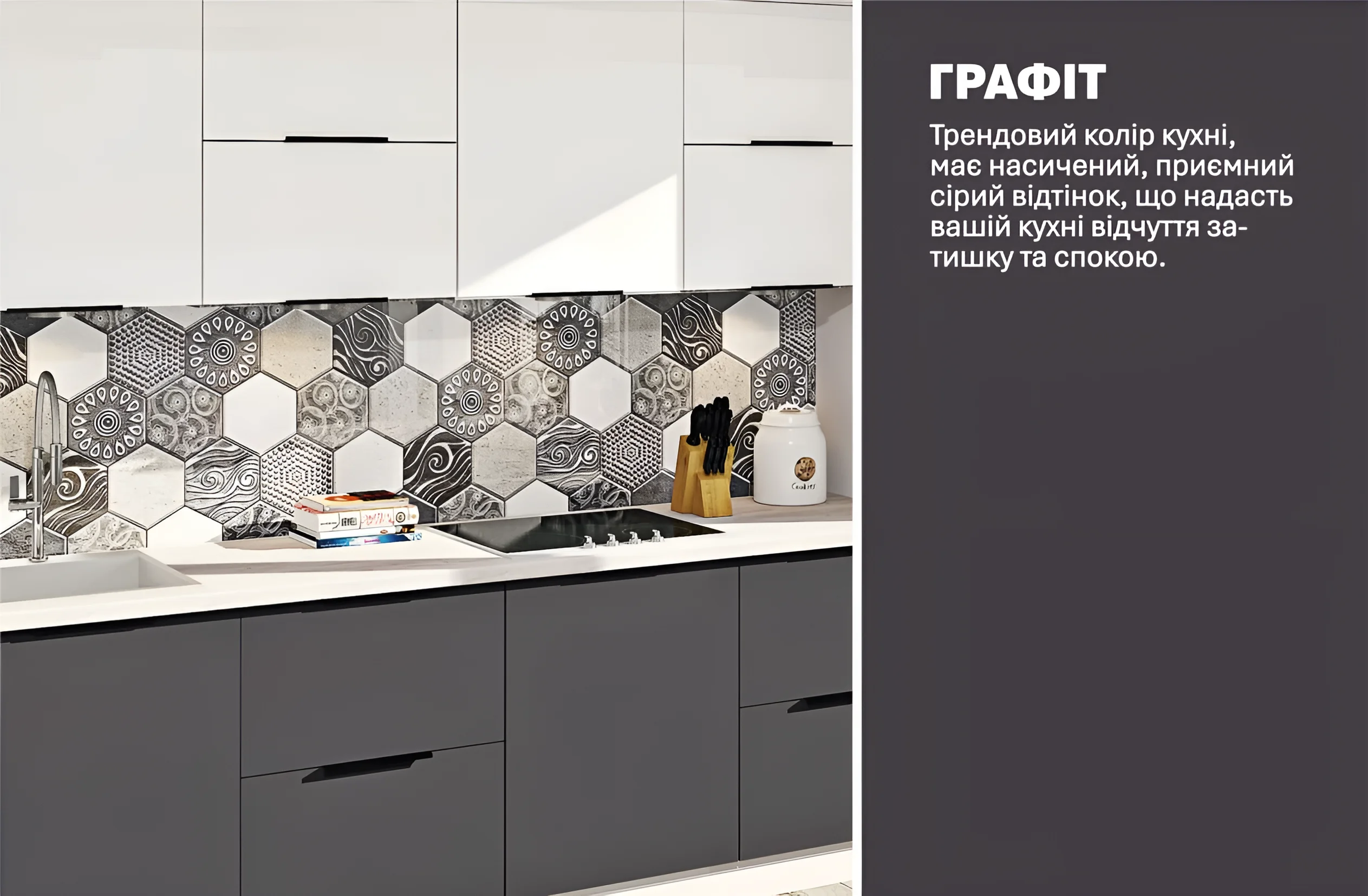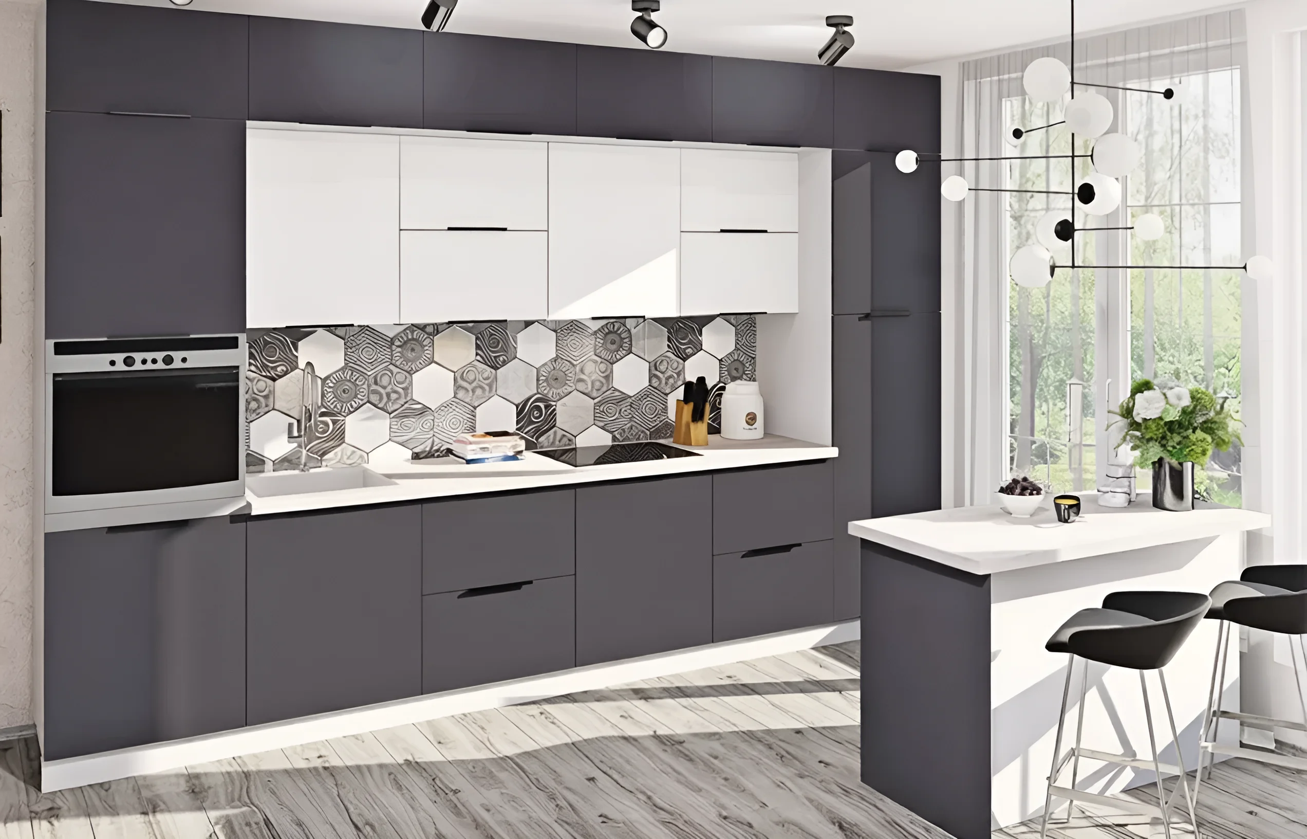 The Loft Kitchen is the embodiment of modern interior design trends. The combination of two classic yet contrasting facade colors – noble White and deep Graphite – gives the set a special expressiveness and dynamism. Matte painted MDF facades not only look exquisite but are also pleasant to the touch, creating a cozy atmosphere. This color scheme allows for easy integration of the kitchen into various interior concepts, from minimalism to industrial style.