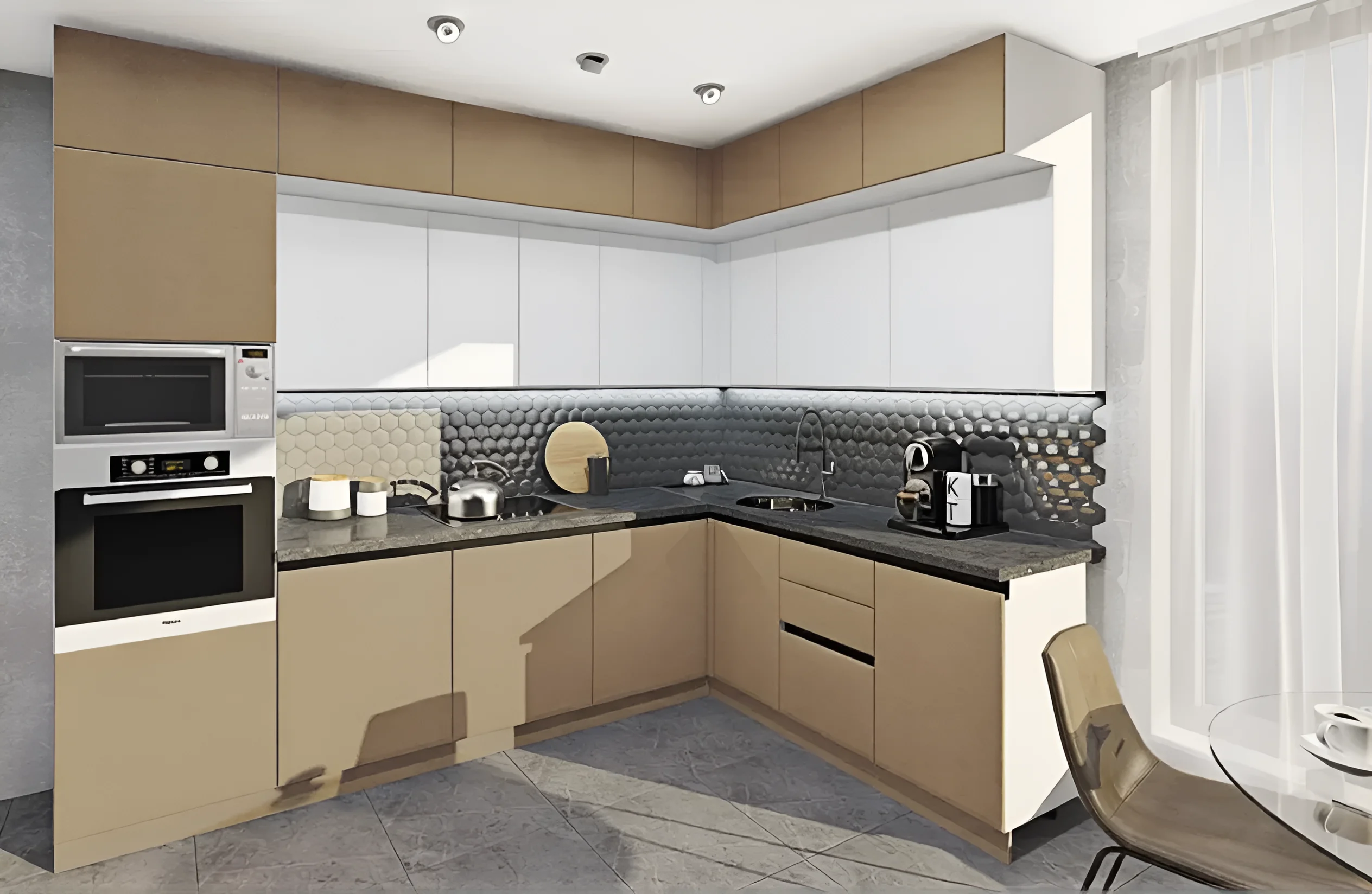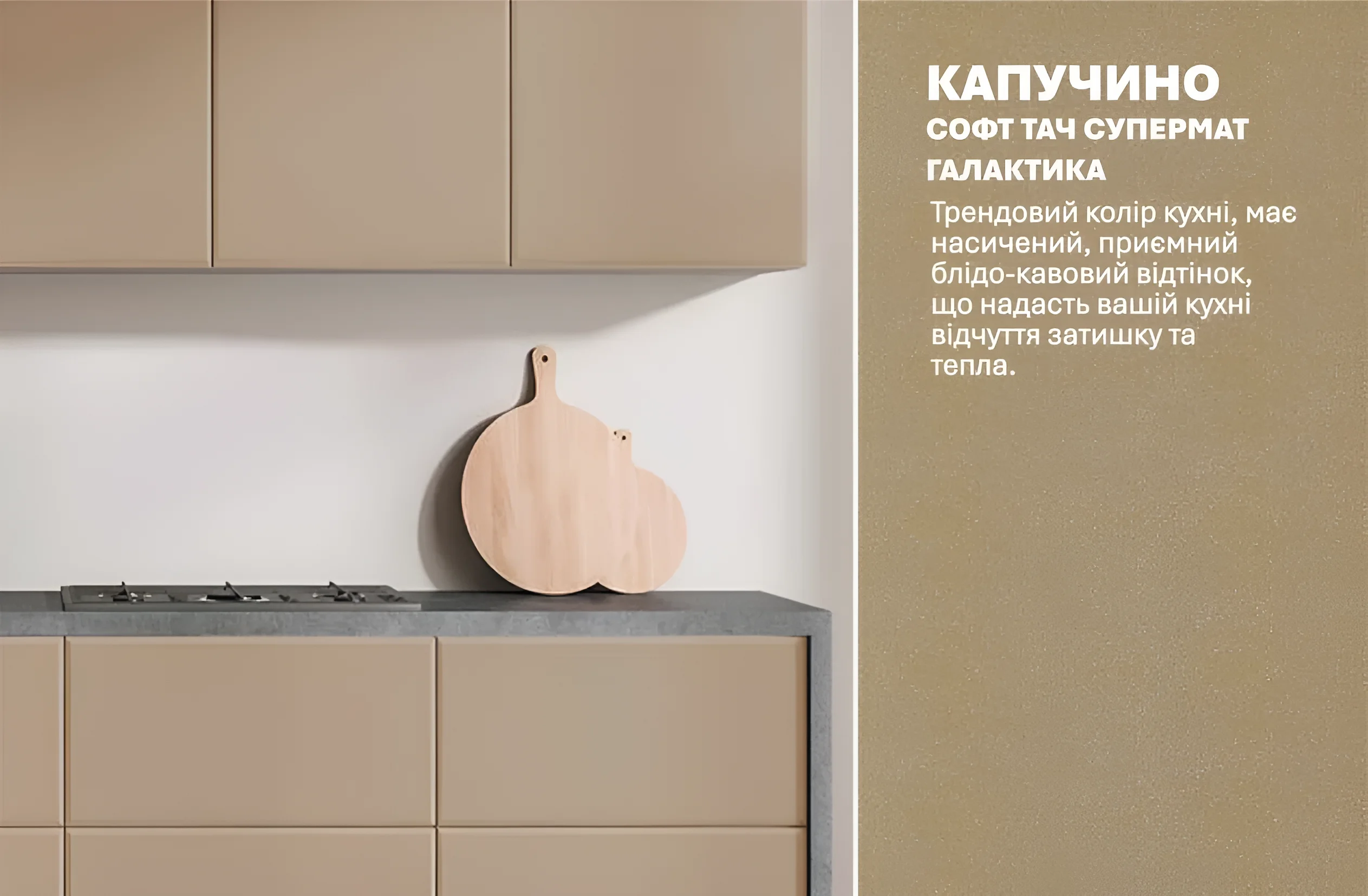 Our “Hi-Tech Soft Touch Supermatt” series kitchen is the embodiment of modern design. Clean lines, absence of unnecessary details, and thoughtful ergonomics make it an ideal choice for a dynamic life. The Cappuccino colored facades give the kitchen an exquisite and warm look that easily fits into any interior palette, from light to richer tones. This neutral yet stylish shade creates an atmosphere of coziness and tranquility, making your kitchen not just a place for cooking, but also a zone for pleasant leisure.
