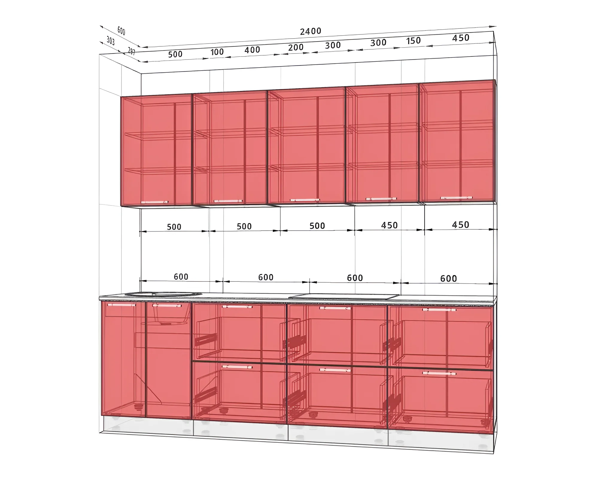 Despite its compactness, this kitchen offers full functionality and ease of use. The standard kitchen height of 2.15 meters ensures easy access to all elements. The kitchen length of 2.4 meters is optimal for small spaces, allowing for the placement of all necessary zones: for cooking, washing, and storage. We have provided the option to choose the height of the upper cabinets: 720 mm or 920 mm. This allows you to adapt the kitchen to your individual needs and ceiling height, providing maximum usable space for storing dishes and kitchenware.