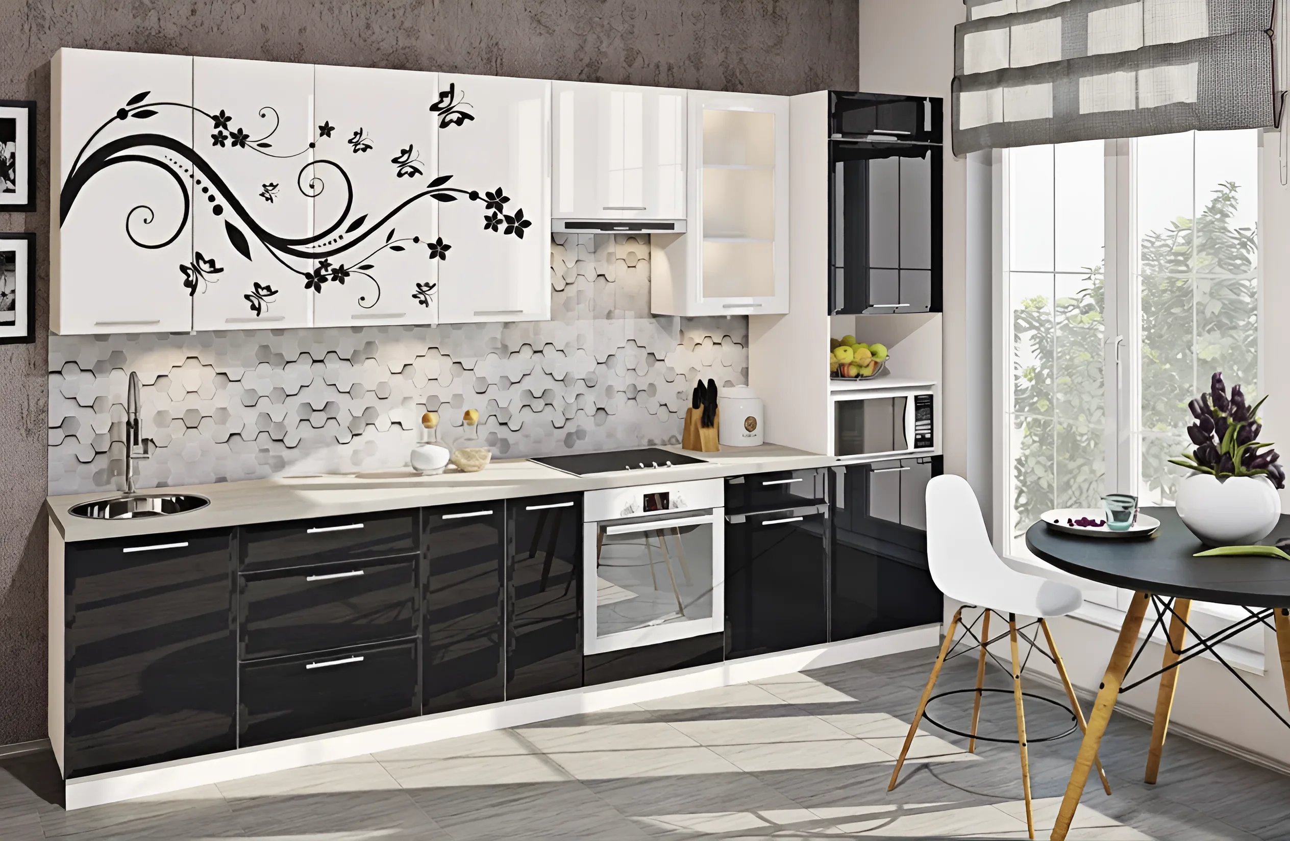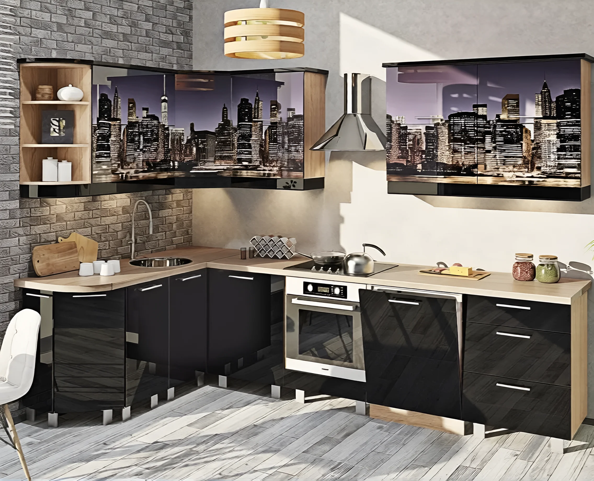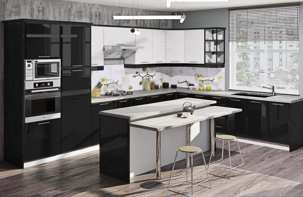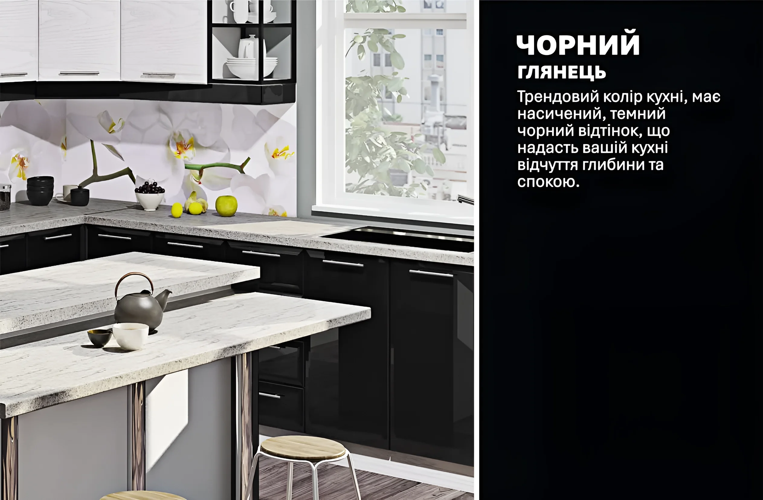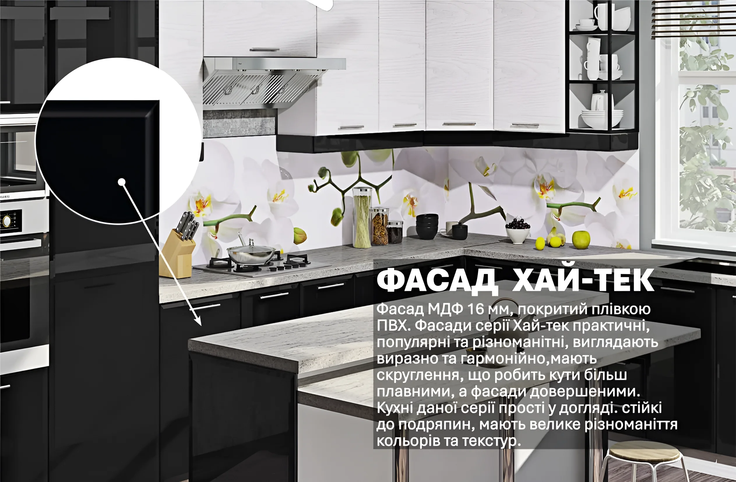 Special attention is paid to materials and finishes. The fronts are made of high-quality MDF – a material known for its durability, longevity, and resistance to moisture and temperature fluctuations. The front finish is PVC film, available in two options: glossy and textured. Glossy black surfaces give the kitchen a luxurious, modern look, reflecting light and visually expanding the space. Textured fronts in whitewashed oak add warmth and naturalness, creating a pleasant contrast and a unique play of textures. This «Hi-tech» series is available in both glossy and textured finishes, allowing you to choose the perfect option for your interior.