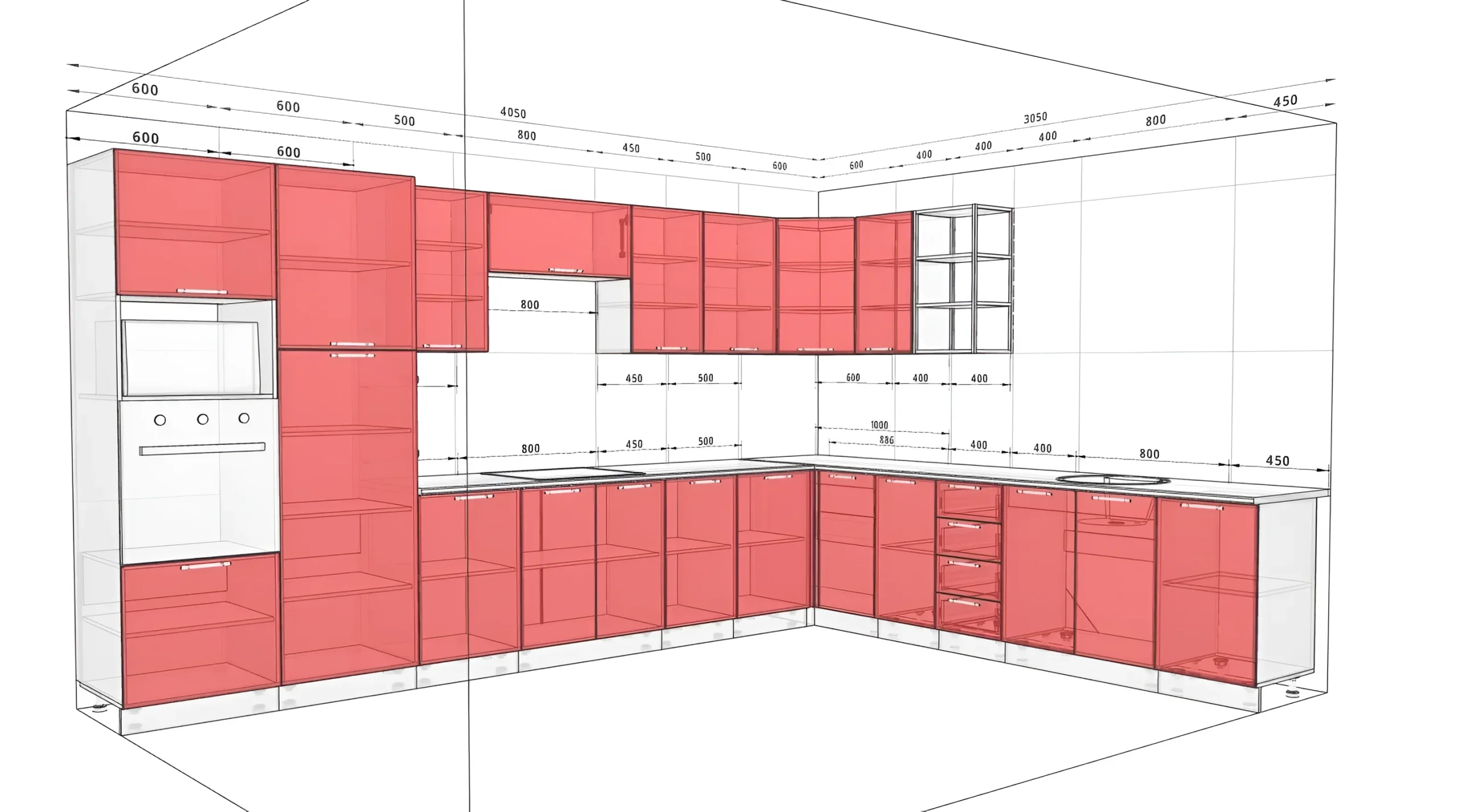 The «Hi-tech» kitchen is designed for those who appreciate clean lines, glossy surfaces, and modern technologies. Its impressive dimensions — 4.05 meters long on one side and 3.05 meters on the other — allow for maximum efficient use of corner space, creating a comfortable working area. The standard kitchen height is 2.15 meters, which ensures optimal placement of all elements and convenient access to cabinet contents for most users. The «Hi-tech» design concept implies the absence of excesses, making this kitchen an ideal solution for dynamic interiors.