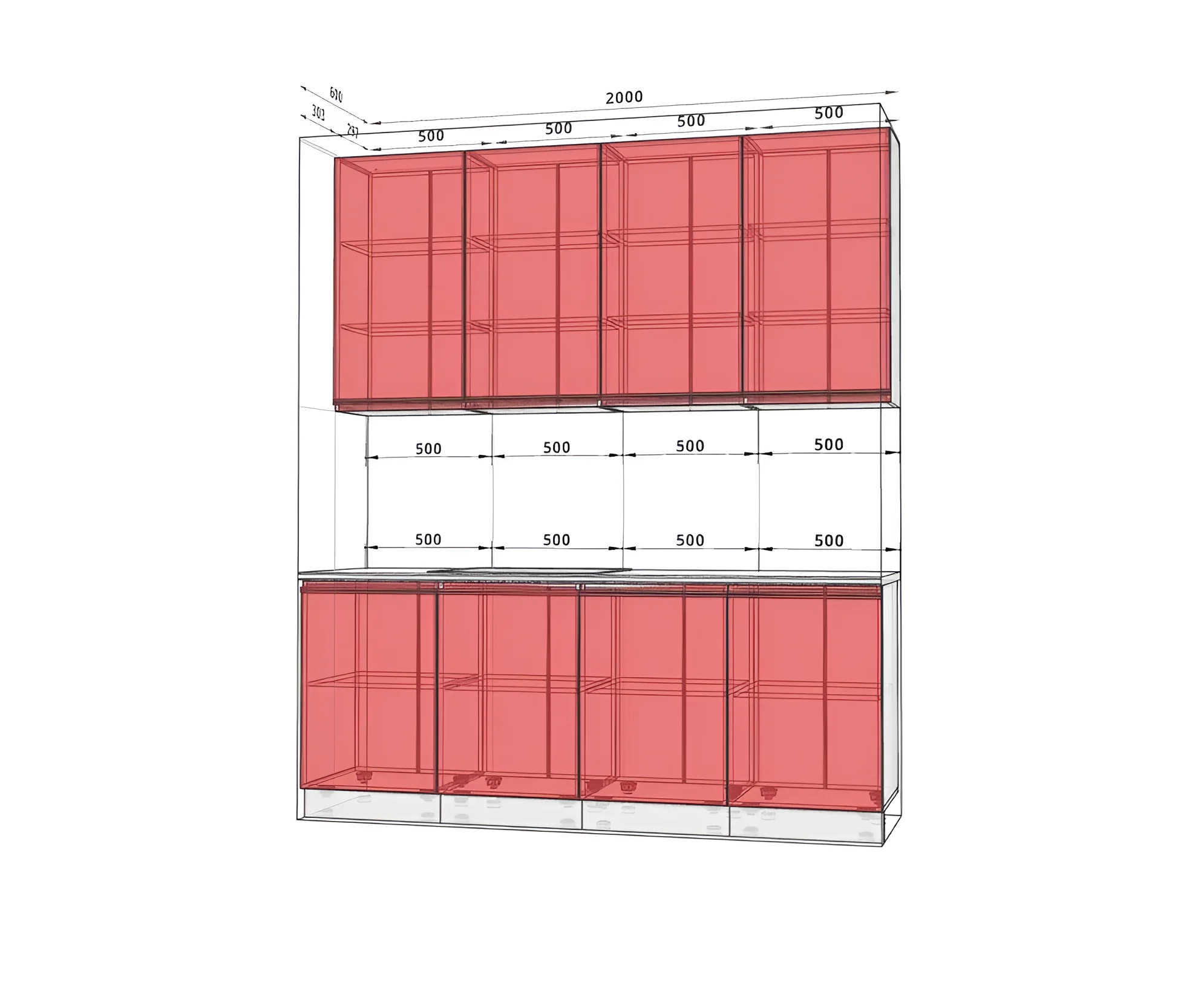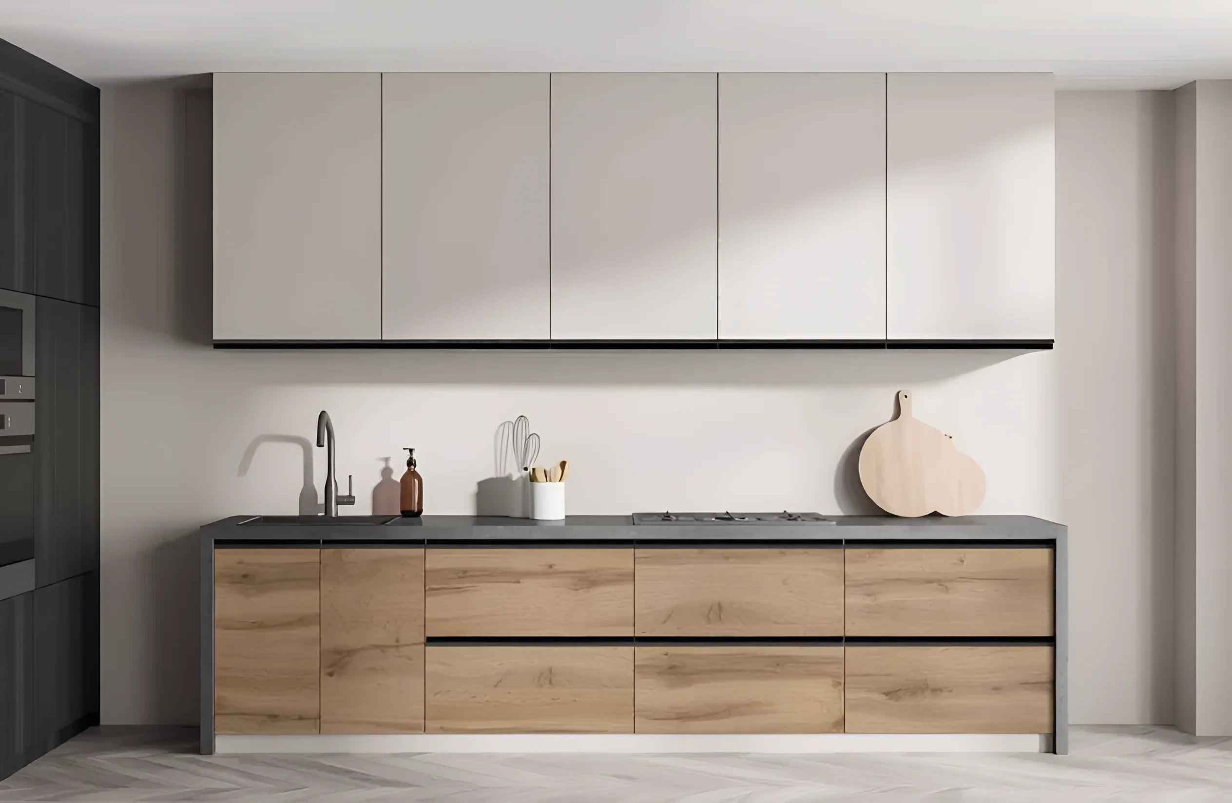 The “Sigma handle” kitchen is designed with the standard needs of a modern homeowner in mind. The total height of the kitchen is 2.15 m, which is a standard and convenient indicator for most rooms. The 2-meter length of the unit makes it compact yet spacious enough to store all necessary kitchen utensils. The upper cabinets are offered in two height options: 720 mm and 920 mm, allowing for maximum efficient use of vertical space and adaptation of the kitchen to individual needs or ceiling heights. The depth of the lower cabinets is 450 mm, which is considered standard and provides convenient access to contents, as well as compatibility with most built-in appliances. The countertop has a standard depth of 600 mm, leaving enough space for comfortable cooking and placement of small appliances.