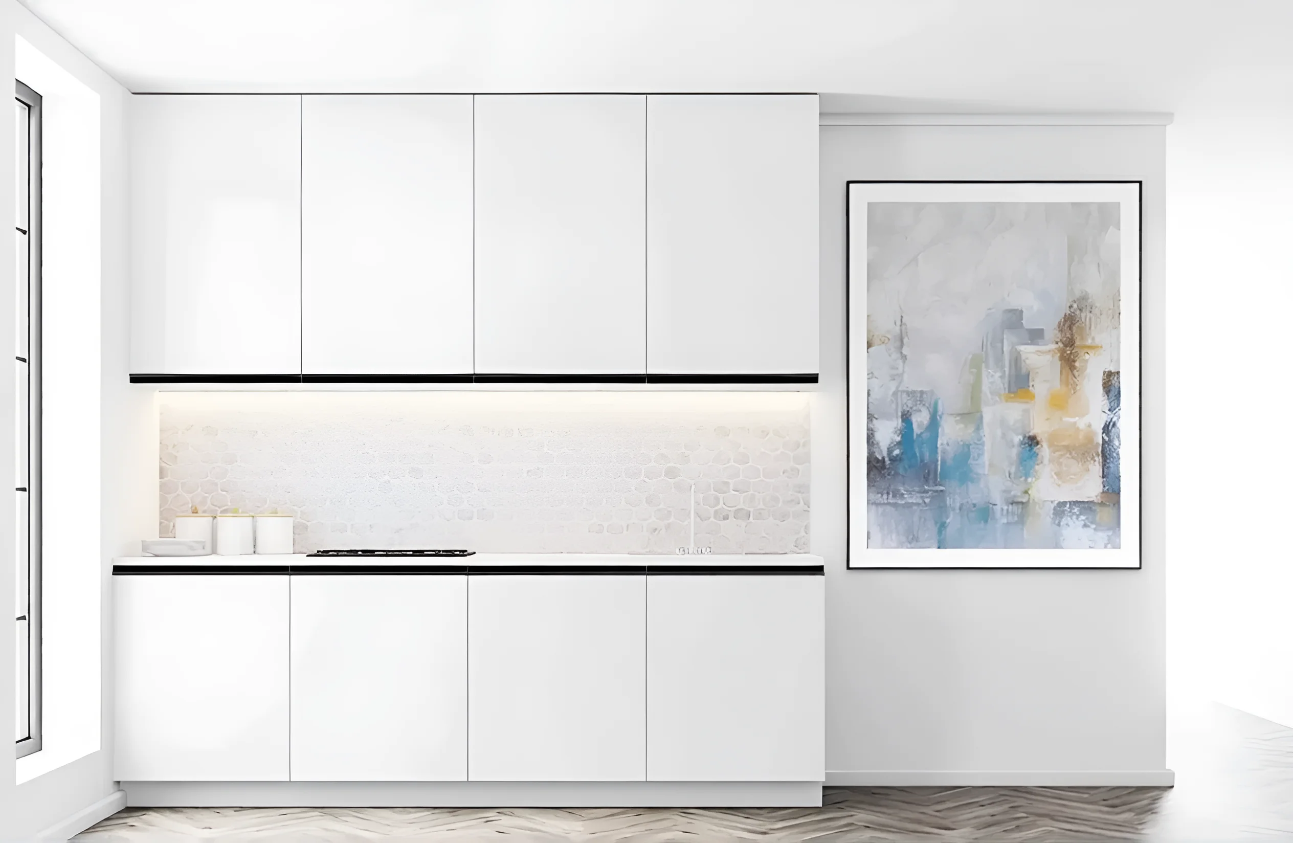 Choosing white facades for the “Sigma handle” kitchen is not just a fashion statement, it’s an investment in a classic, always relevant design. White brings freshness, cleanliness, and lightness to the interior. It pairs perfectly with any other shades and materials, be it wood, metal, or glass. A white kitchen creates a sense of spaciousness, makes the room brighter by reflecting natural and artificial light. It is the ideal solution for those who value clean lines, functionality, and modern aesthetics. The “soft-touch” coated facades minimize the visibility of minor dirt and fingerprints, which is especially important for white furniture, and make kitchen maintenance as simple and hassle-free as possible, maintaining its impeccable appearance.