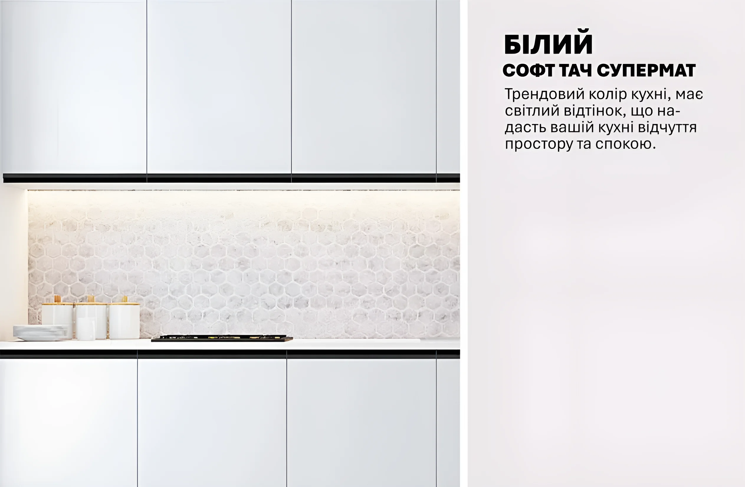 The “Sigma handle” kitchen is distinguished by its high-quality craftsmanship and thoughtful material selection. The kitchen facades are made of high-quality MDF, known for its durability, longevity, and resistance to moisture and temperature fluctuations. The additional PVC film coating with a “soft-touch” effect gives the surfaces a pleasant, velvety texture and provides increased wear resistance. Such facades are easy to clean, do not leave fingerprints, and retain their original appearance for many years. The body material is made of durable chipboard, which guarantees the reliability and stability of the entire structure. The “Sigma handle” series emphasizes a minimalist design with integrated or hidden handles, creating smooth, continuous lines that are highly valued in modern design, and the white color of the kitchen facade adds to its versatility and lightness.