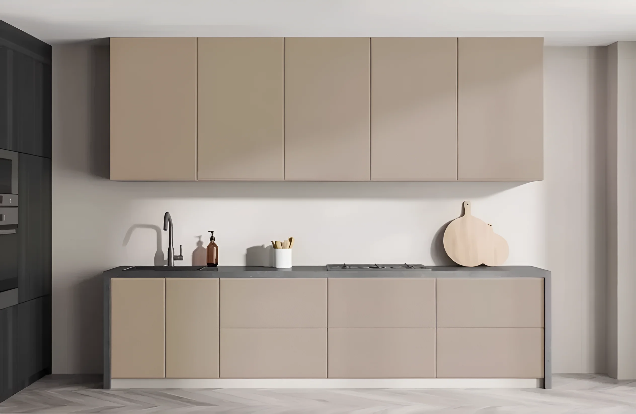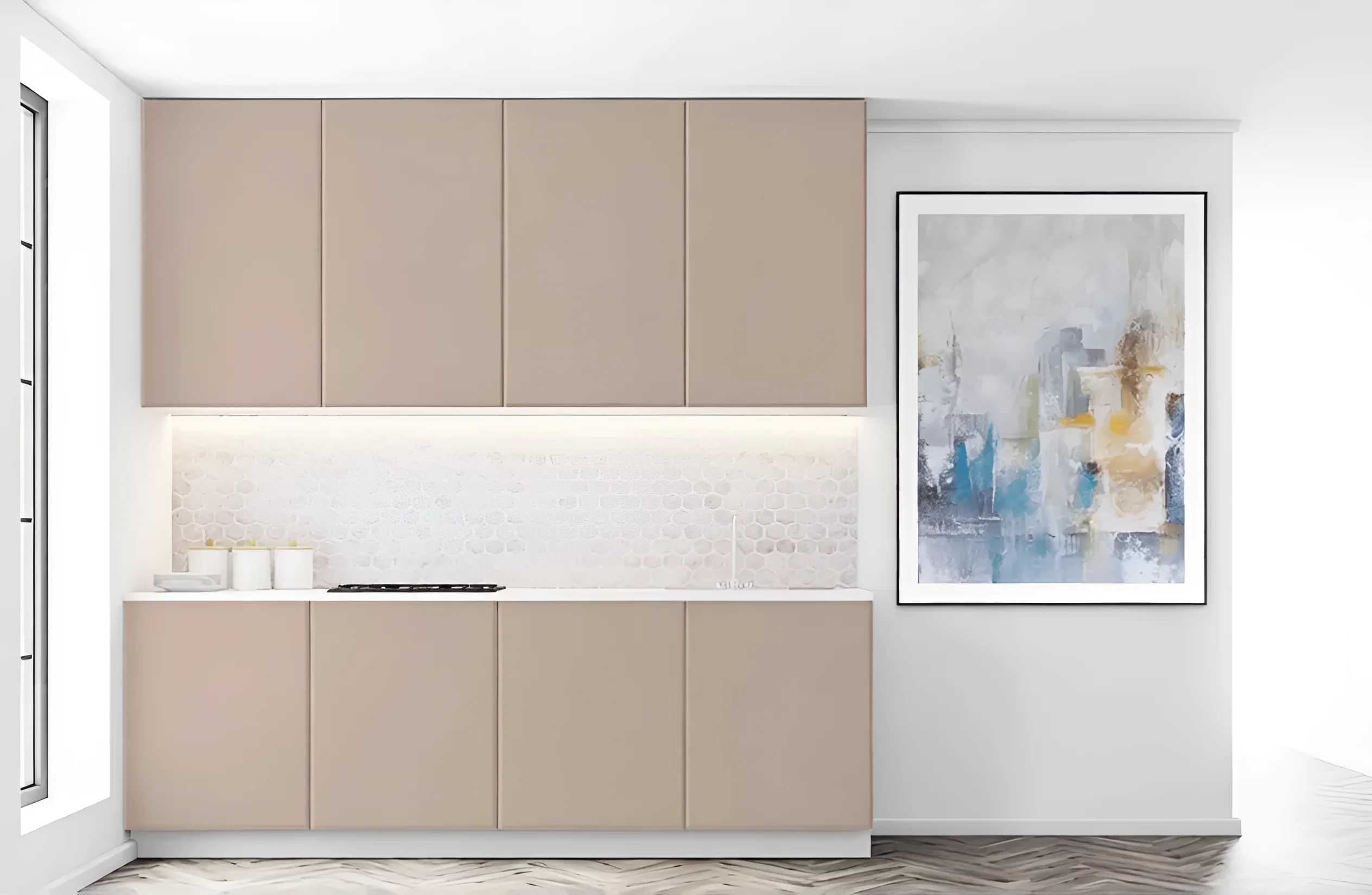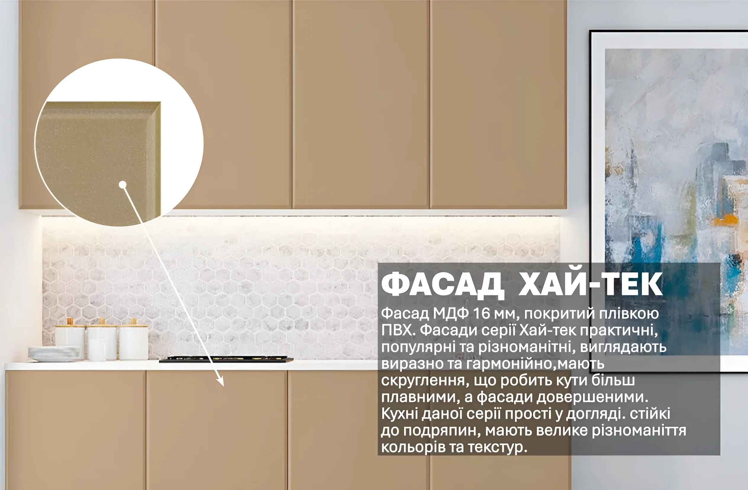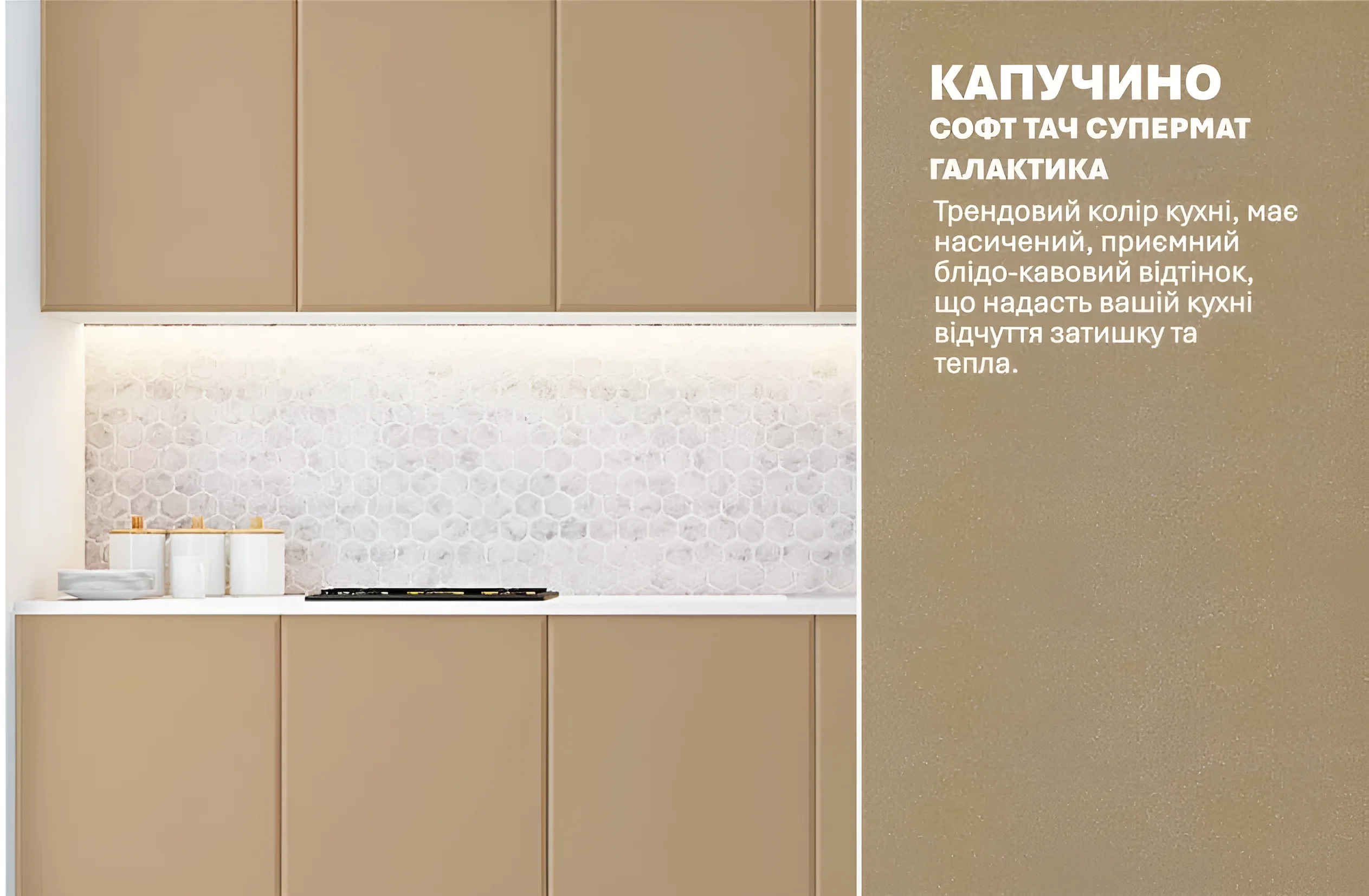 The “Hi-Tech Soft Touch Supermatt” series embodies modern trends in the furniture industry. The distinctive feature of this kitchen is its facades. Made from high-quality MDF, they are coated with a PVC film with a soft-touch effect. This coating not only gives the facades an exquisite matte look but also makes them incredibly pleasant to the touch, creating a sense of warmth and coziness, despite the strict hi-tech style. The “Cappuccino” color is a classic that will never go out of fashion. It is versatile, easily combines with various interior elements, and gives the kitchen a noble and refined appearance. The matte surface of the facades eliminates glare, makes minor dirt less noticeable, and is easy to clean, which is a significant advantage in everyday use.