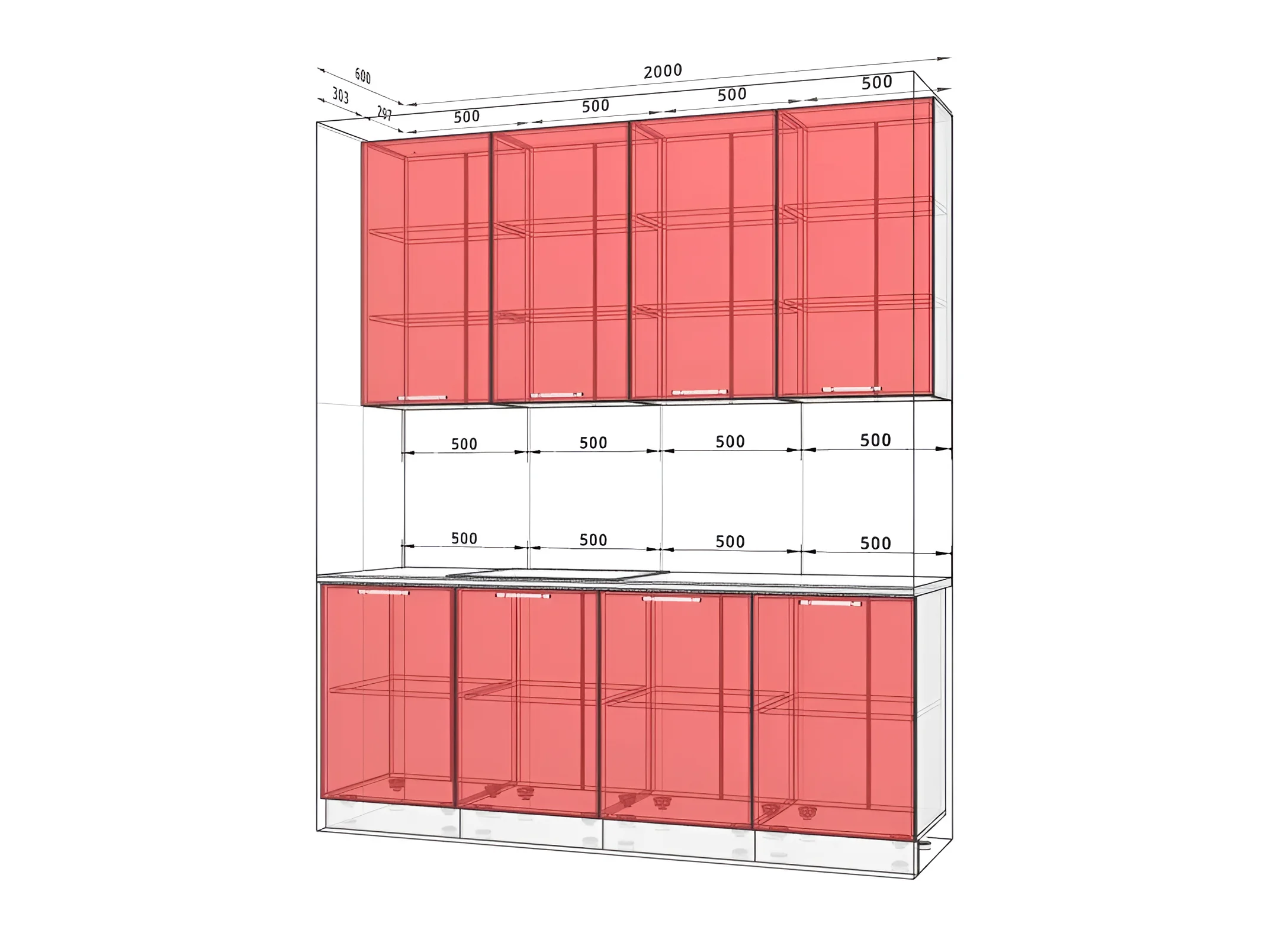 Despite its compact dimensions – the kitchen length is 2 meters – this model offers full functionality for comfortable cooking and storage of kitchen utensils. The standard kitchen height of 2.15 meters allows for efficient use of vertical space. Upper cabinets are available in two height options: 720 mm and 920 mm, giving you the opportunity to choose the optimal solution depending on your needs and ceiling height. The depth of the lower cabinets is 450 mm (standard), providing enough space for dishes and appliances without cluttering the passage. The 600 mm deep countertop (standard) provides a spacious work surface, convenient for placing kitchen appliances and cooking.