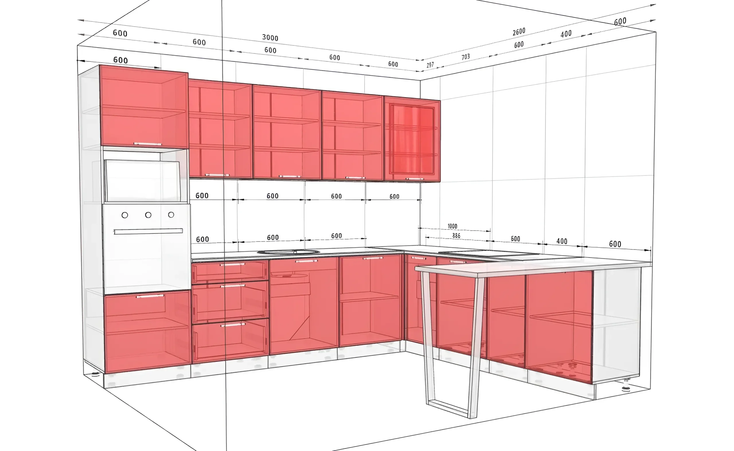 The “Sigma Handle” kitchen is designed with standard ergonomic requirements in mind, ensuring maximum comfort during cooking and storage. The standard kitchen height is 2.15 meters, which is convenient for most users. The kitchen length, indicated as 3 meters, implies the total length of one of the sides of the U-shaped configuration. Upper cabinets are offered in two height options: 720 mm and 920 mm, allowing you to choose the optimal storage solution depending on your needs and ceiling height. You can combine these sizes to create a unique design and functionality. The standard depth of base cabinets is 450 mm, providing sufficient space for built-in appliances and kitchenware storage without overloading the space. The countertop has a standard depth of 600 mm, creating a convenient work surface and allowing for easy placement of kitchen appliances such as a kettle, toaster, or coffee maker.