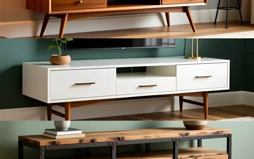 Коллаж из трех стильных тумб под телевизор: мид-сенчури модерн, минималистичная белая и индустриальная лофт-модель
