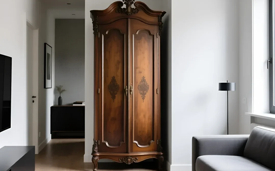 Несмотря на винтажный вид, этот шкаф остается высокофункциональным для хранения одежды, белья или даже в качестве элегантного буфета в гостиной. Его габариты требуют достаточного пространства для визуального «дыхания», поэтому он идеально подходит для просторных гостиных или спален, где он станет центральным акцентом. Это не модульная система, а цельное, капитальное хранилище.