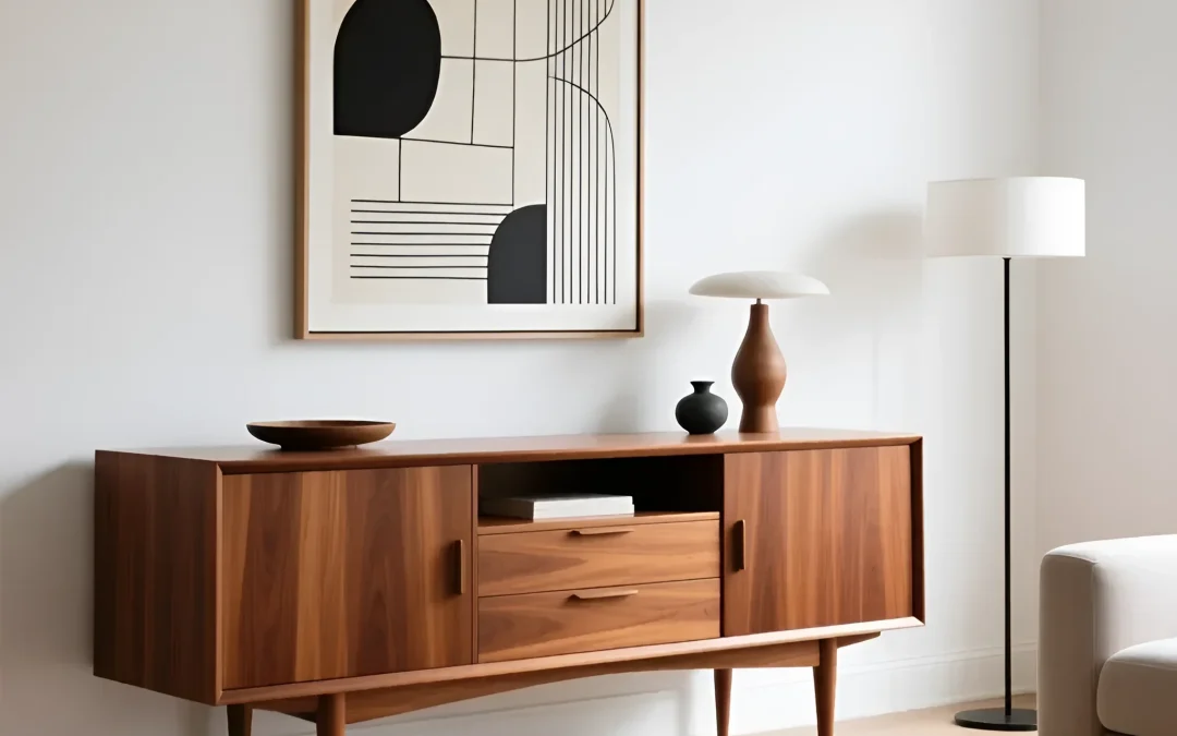 Представленный предмет — это длинный, низкий комод-буфет, выполненный в классическом стиле Mid-Century Modern. Он характеризуется чистыми горизонтальными линиями, скругленными краями и характерными коническими ножками, приподнимающими корпус. Комбинация закрытых секций со створками и открытых/выдвижных ящиков обеспечивает универсальность хранения. Его пропорции идеально подходят для размещения под длинными картинами или телевизорами в современных гостиных.