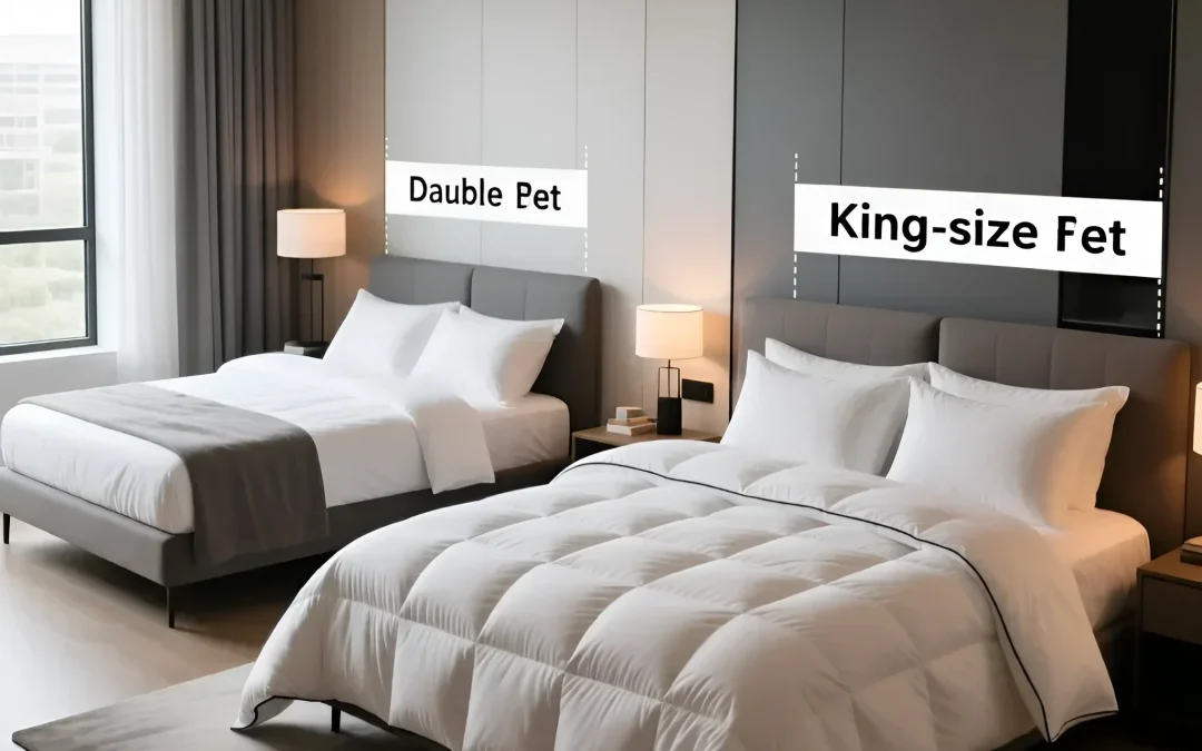Иллюстрация демонстрирует разницу в размере одеял для двуспальной и королевской кровати, подчеркивая важность правильного выбора.