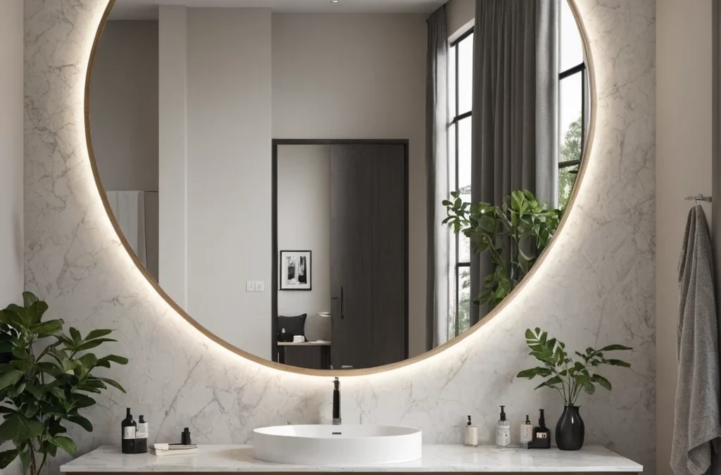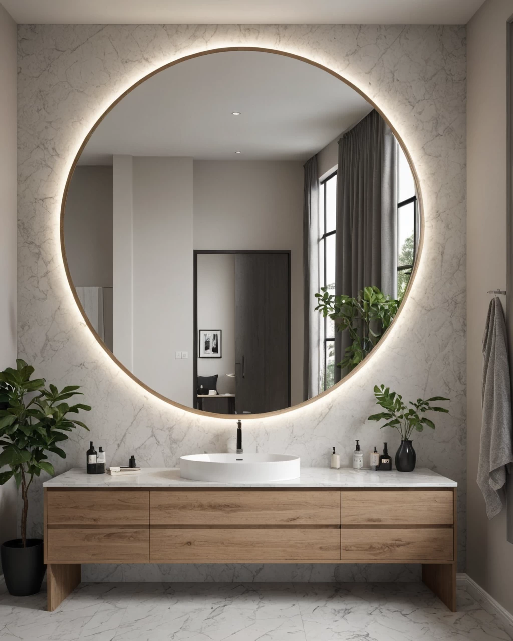 photorealistic, a modern vanity with a large circular mirror, bold statement piece №05 — mebeltops.com