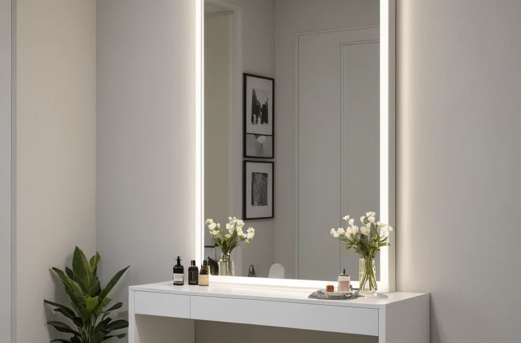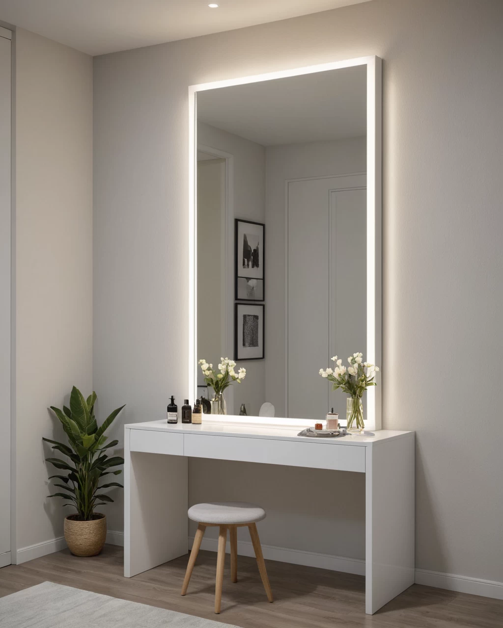 photorealistic, contemporary vanity with hidden storage, clean white finish, rectangular mirror with integrated LED, minimalist №18 — mebeltops.com