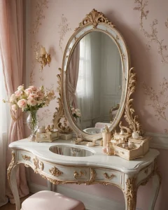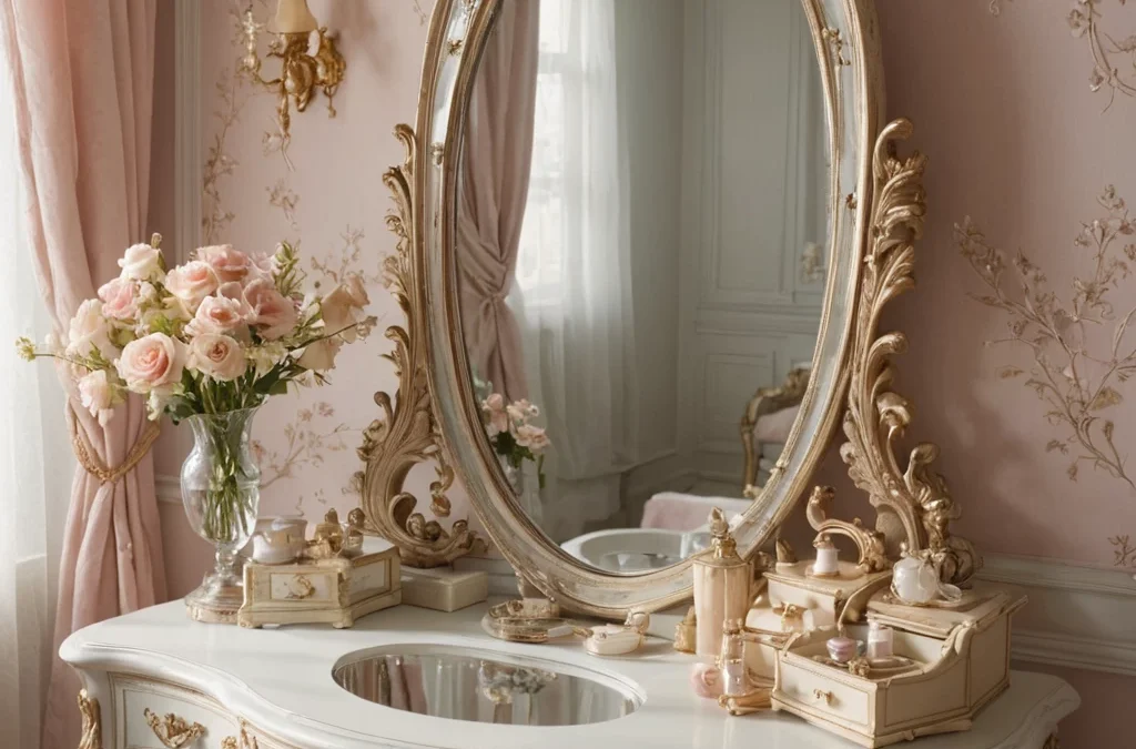 photorealistic, feminine vanity with a gilded mirror, ornate details, soft pastel colors, delicate jewelry box, romantic bedroom №24 — mebeltops.com