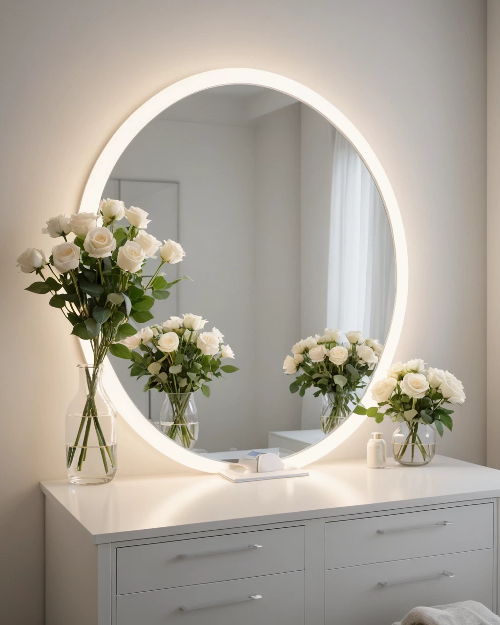 photorealistic, modern minimalist vanity, sleek lines, round illuminated mirror, small bouquet of white roses, bright airy bedro №32 — mebeltops.com