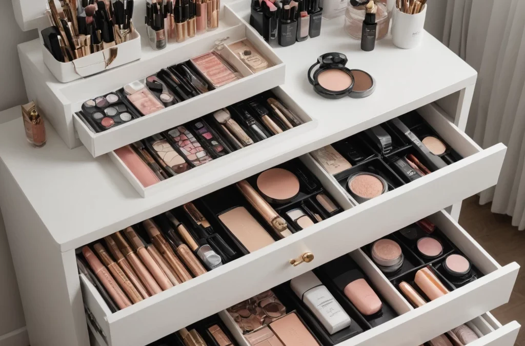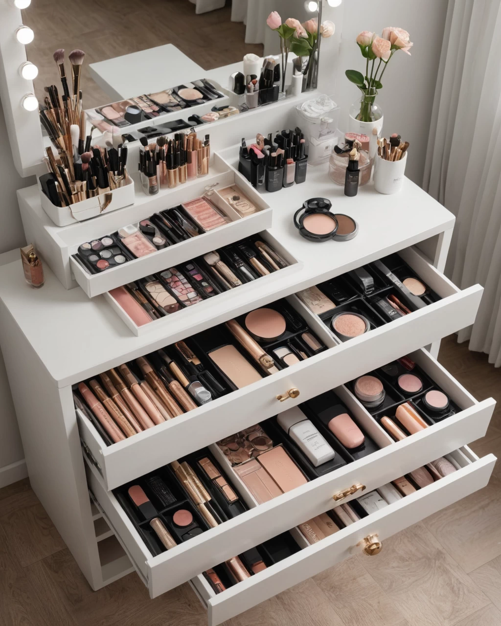 photorealistic, vanity table with integrated drawers, organized makeup and beauty products, neat and tidy setup №46 — mebeltops.com