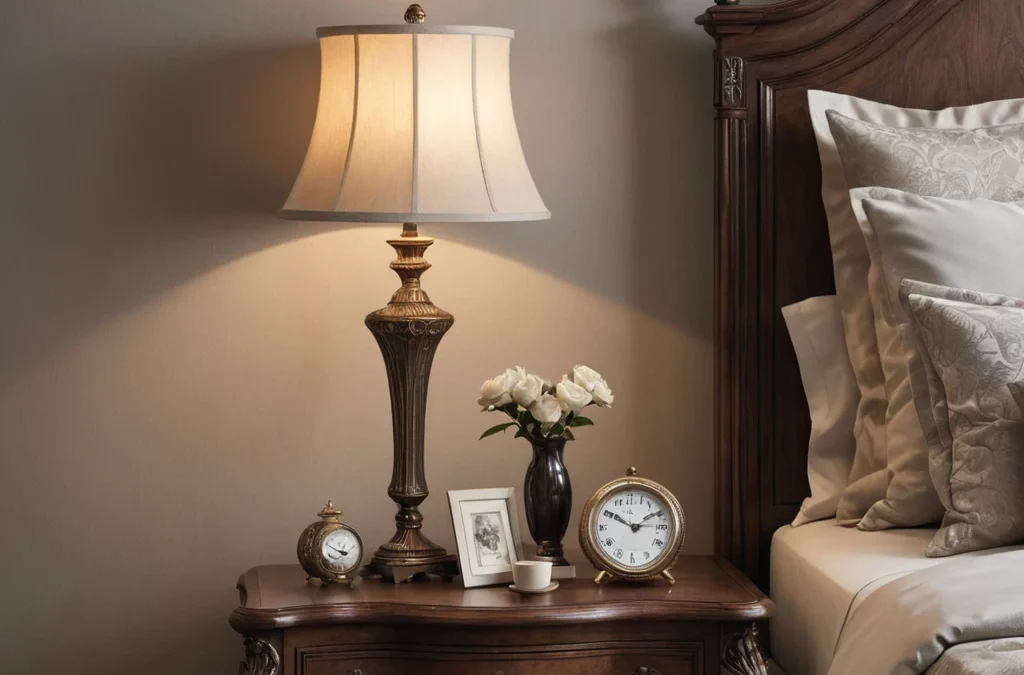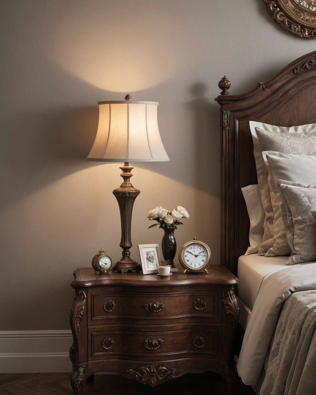 photorealistic, elegant traditional nightstand, dark wood, ornate carving, classic lamp, luxurious bedroom №16 — mebeltops.com