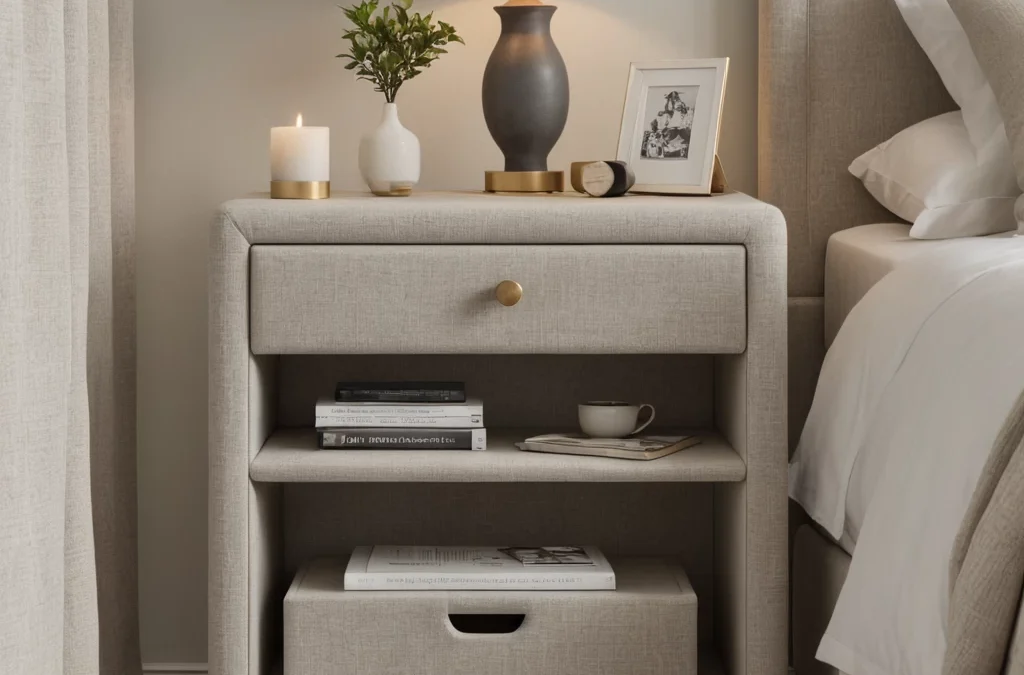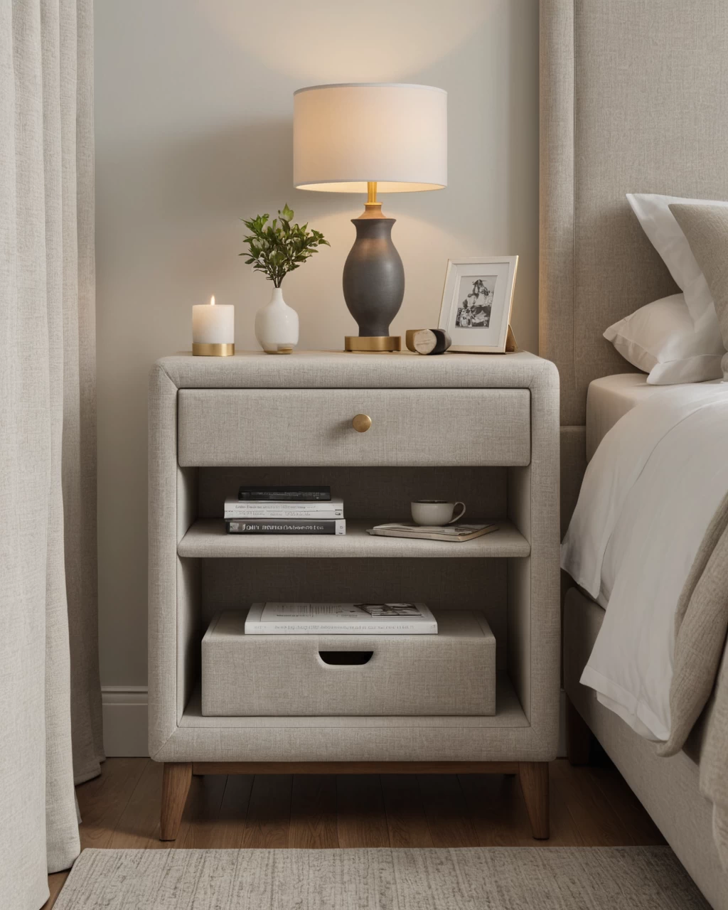 photorealistic, fabric upholstered nightstand, soft texture, matching bedroom aesthetic, cozy and inviting №17 — mebeltops.com