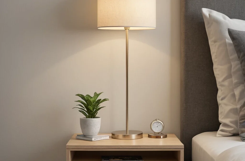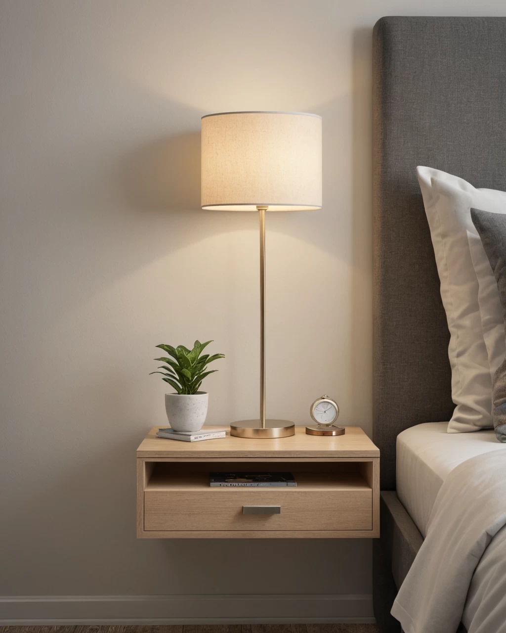 photorealistic, modern minimalist nightstand, floating design, single drawer, simple lamp, sleek bedroom, soft diffused lighting №23 — mebeltops.com
