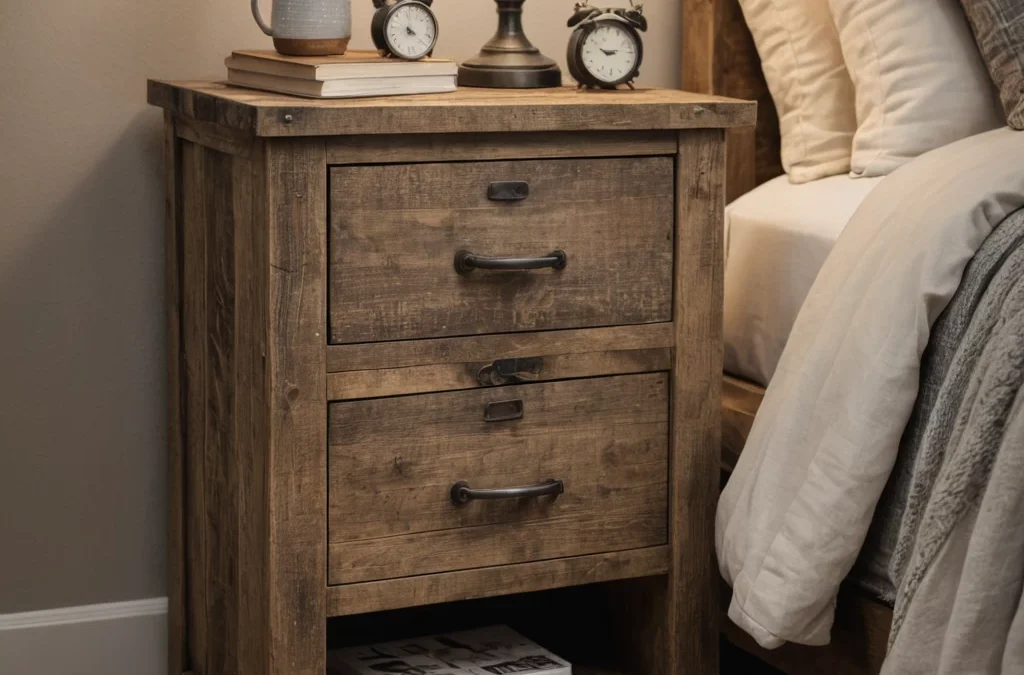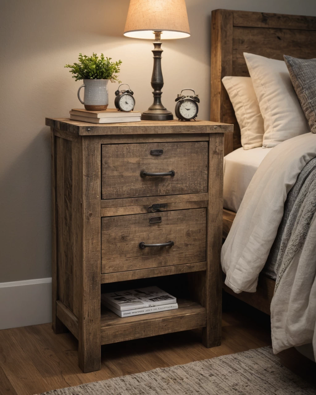 photorealistic, rustic farmhouse nightstand, reclaimed wood, metal handle, distressed look, cozy bedroom, warm ambient lighting №47 — mebeltops.com